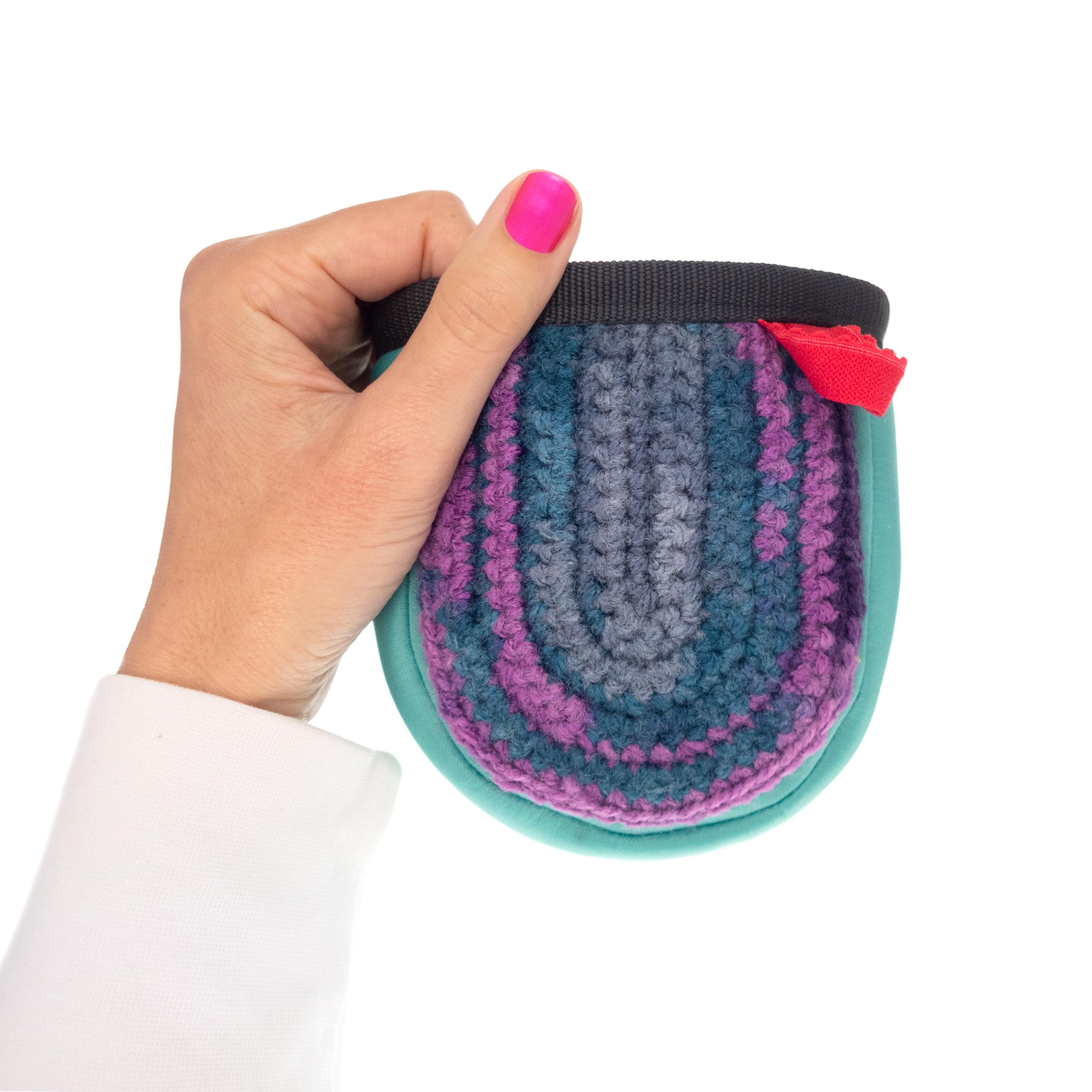Handmade Cool Chalk Bag for Climbing Kids, designed by Nadamlada with hand knit front part and sewn of turquoise blue neoprene. This chalk bag is best for gym, indoor bouldering and for outdoor rock climbing. We designed this climb gear for children as cool small chalkbag. It closes well with a thin elastane grey fabric on its top. The chalk bag can be attached on harness or bought with a belt. Unique, fair trade, and only one available.