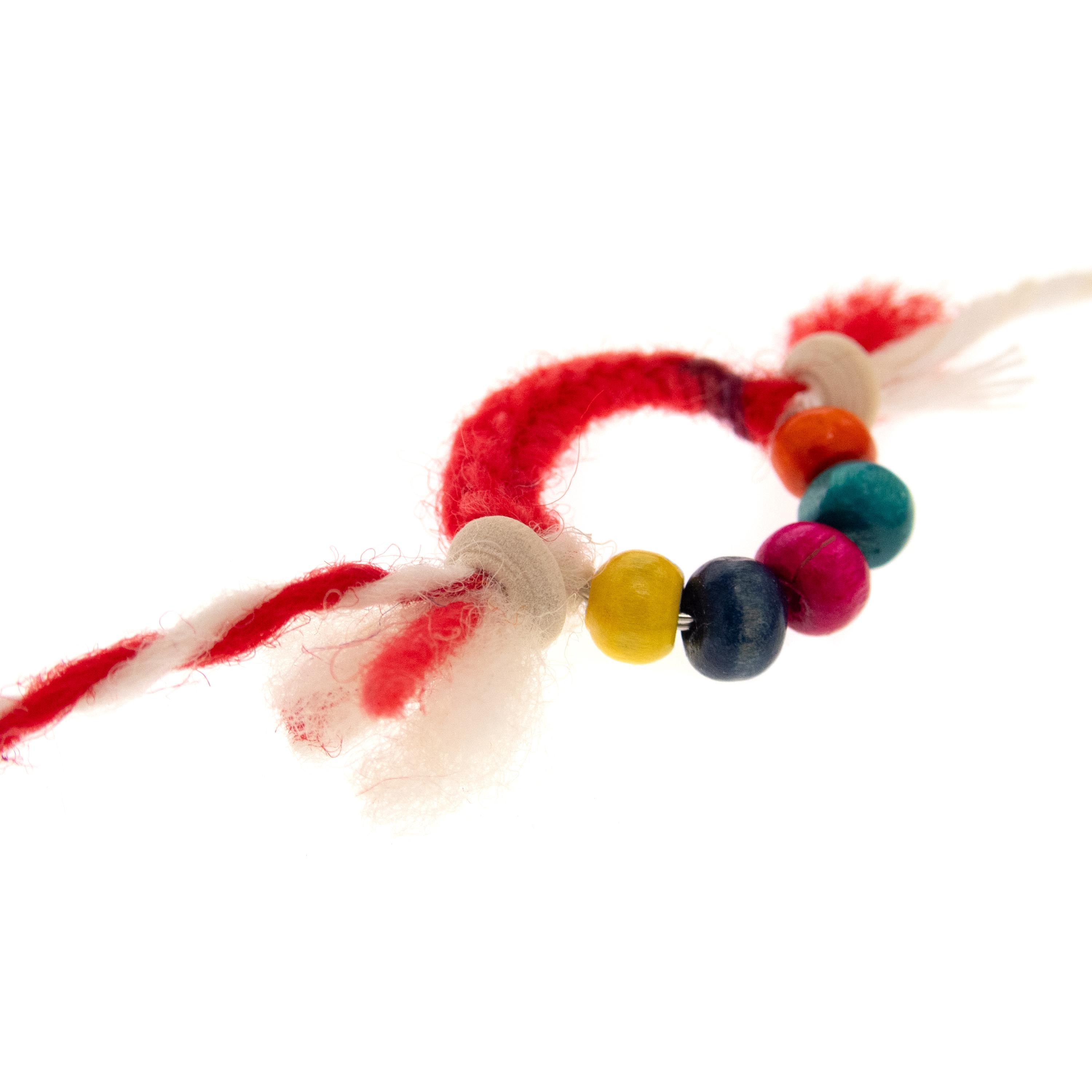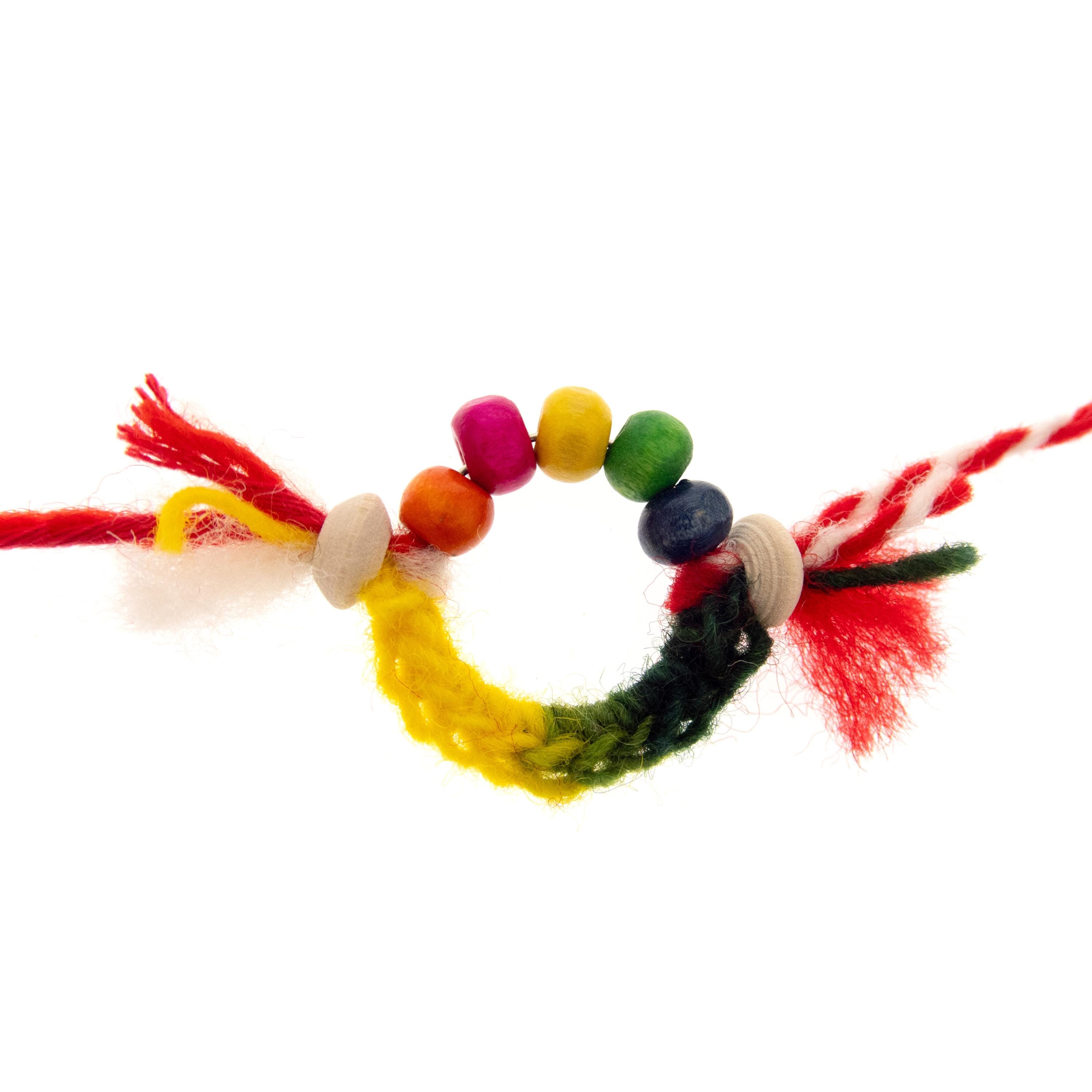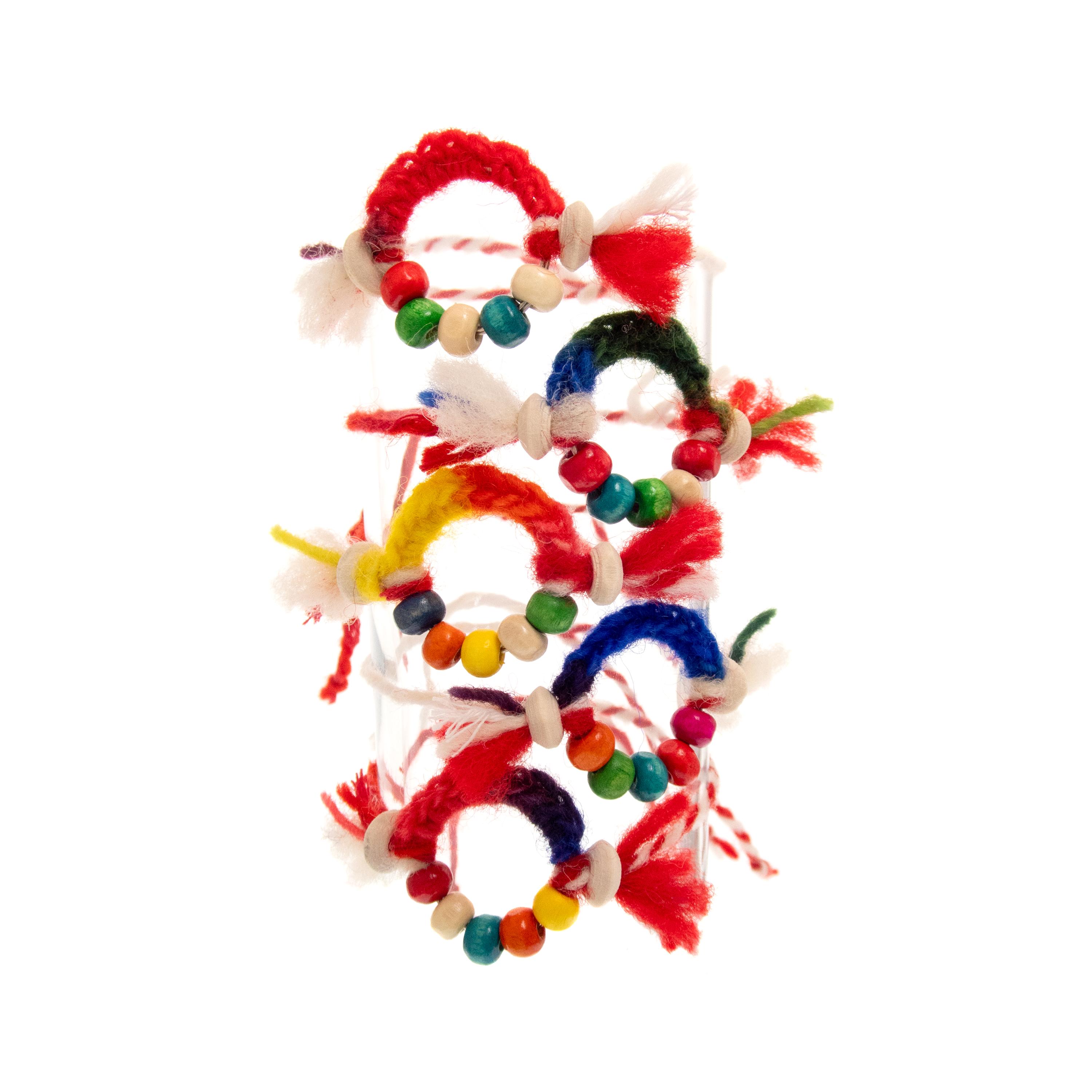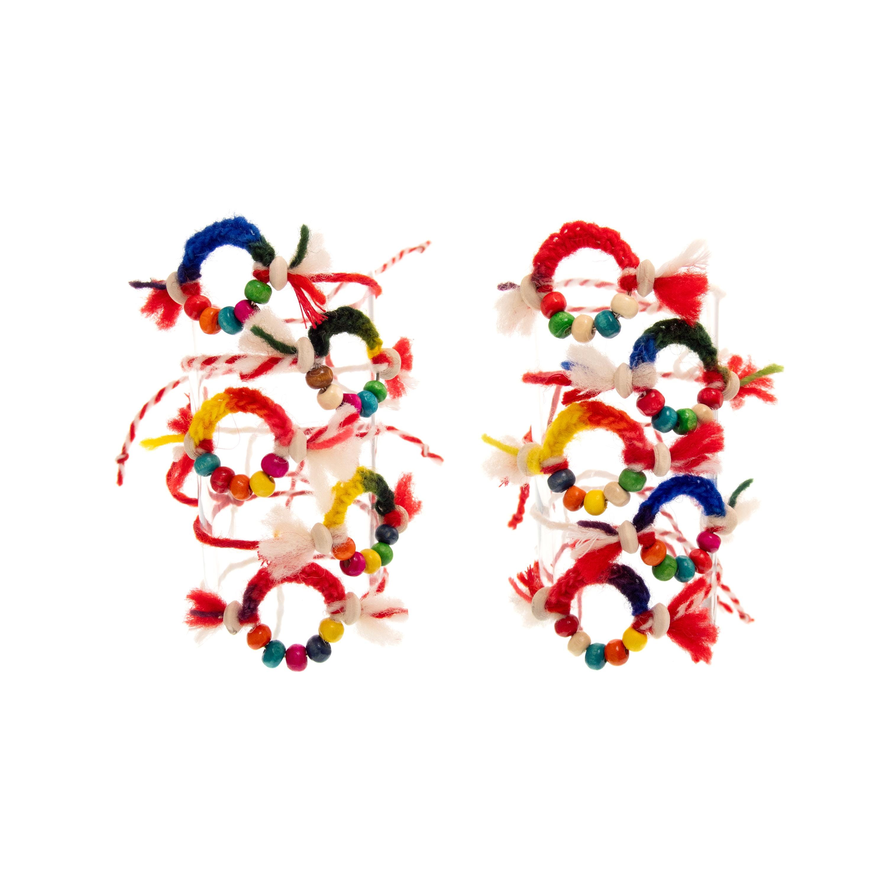 Set of 10 traditional Martenitsa Bracelets and Romanian Martisor spring jewelry in red and white. Nadamlada handmade these Martenichka Bracelets and Bulgarian Martenitsi using natural materials: wool yarn, wood beads. Colorful, bright and unique these Baba Marta Jewelry bracelets are used as gift favors on 1 March in Bugaria. There is same tradition in Romania too. Perfect for sharing joy and good luck, these charming red and white Martenitsi embody the spirit of Baba Marta day celebrations, symbolizing health, prosperity, and the arrival of spring.