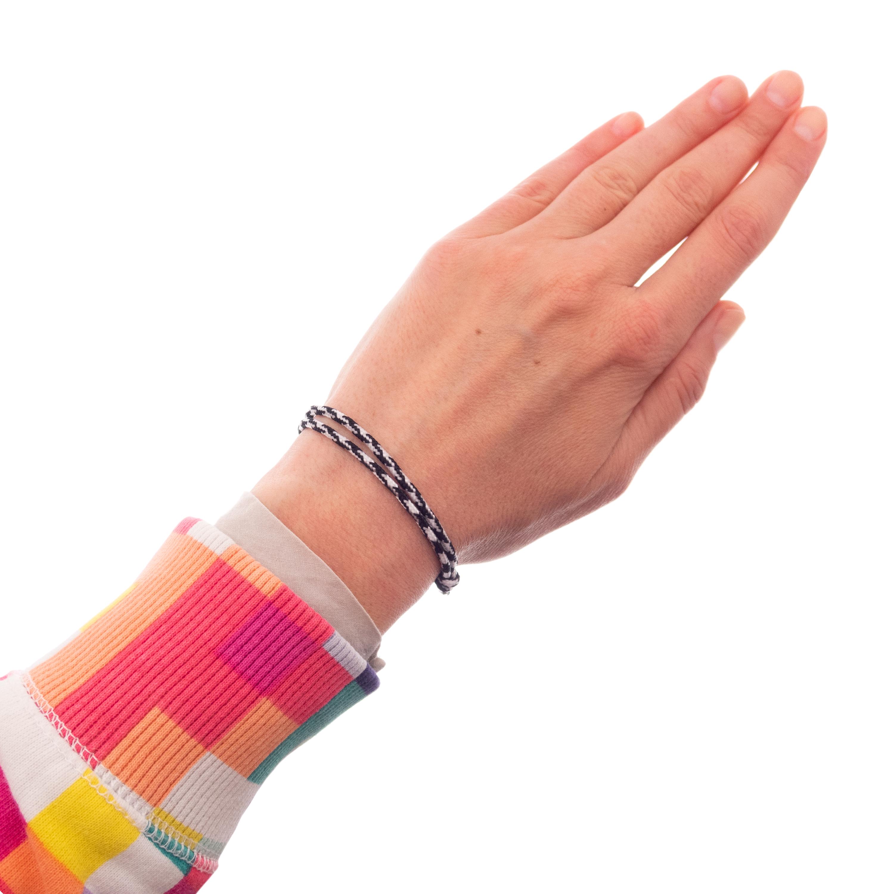 Handmade and Adjustable, this Knot String Bracelet is designed as bracelet of cord with sliding knot. Nadamlada handmade this bracelet as no clasp friendship rope bracelet with slip knot of durable black and white cord. The black and white color scheme represents balance and harmony, making it a symbolic choice for those seeking equilibrium in their lives. You regulate its size when you slide the knots. It fits comfortably men's and women's wrists. It is a stylish accessory that offers both comfort and flexibility. This bracelet can be worn individually or shared with loved ones as symbols of connection, friendship, and personal style.