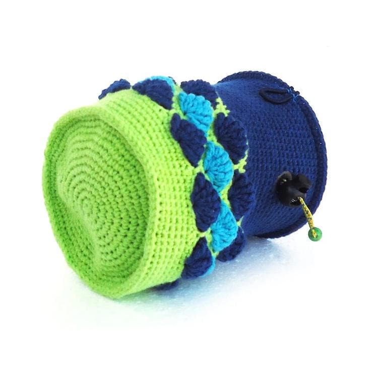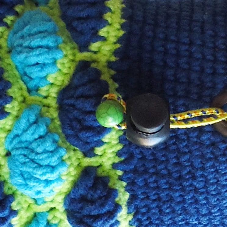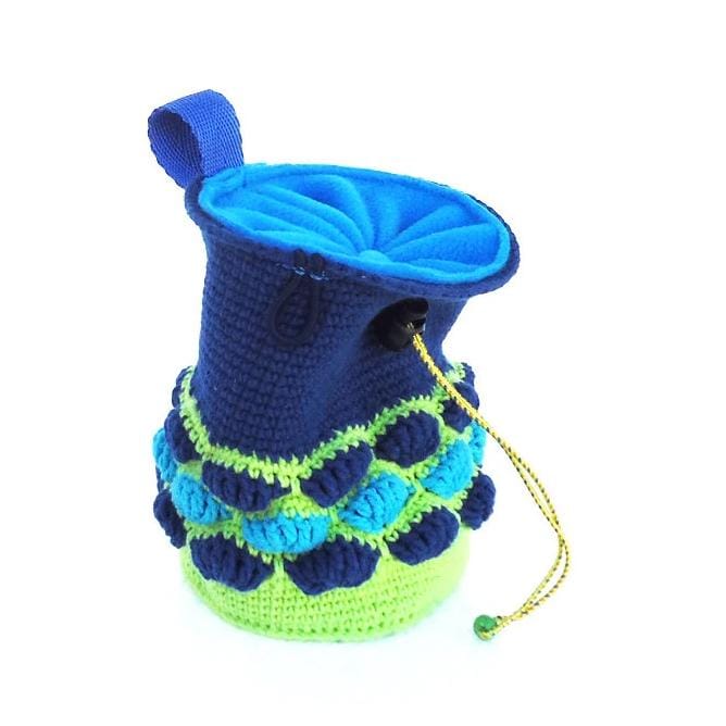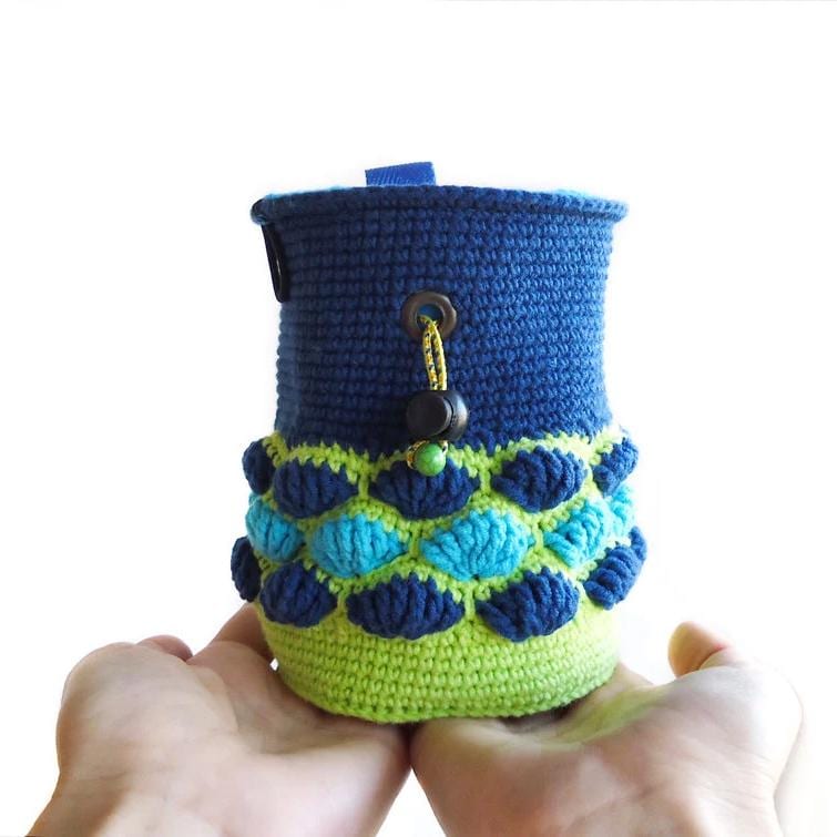 Unique chalk bag for rock climber. We designed it and handmade it for outdoor and indoor rock climbing. Best outdoor gift idea, this funky chalkbag is crochet of yarn in dark blue and neon yellow colors. Some turquoise blue yarn is used as an accent. This long rock climbing bag is with OOAK design, comfortable, colorful and modern simultaneously. The inner is made of high quality fleece in turquoise blue. Between both layers there is hidden waterproof membrane, that keeps the chalk in. The closure is tight. There is one attaching point and an elastic brush holder.