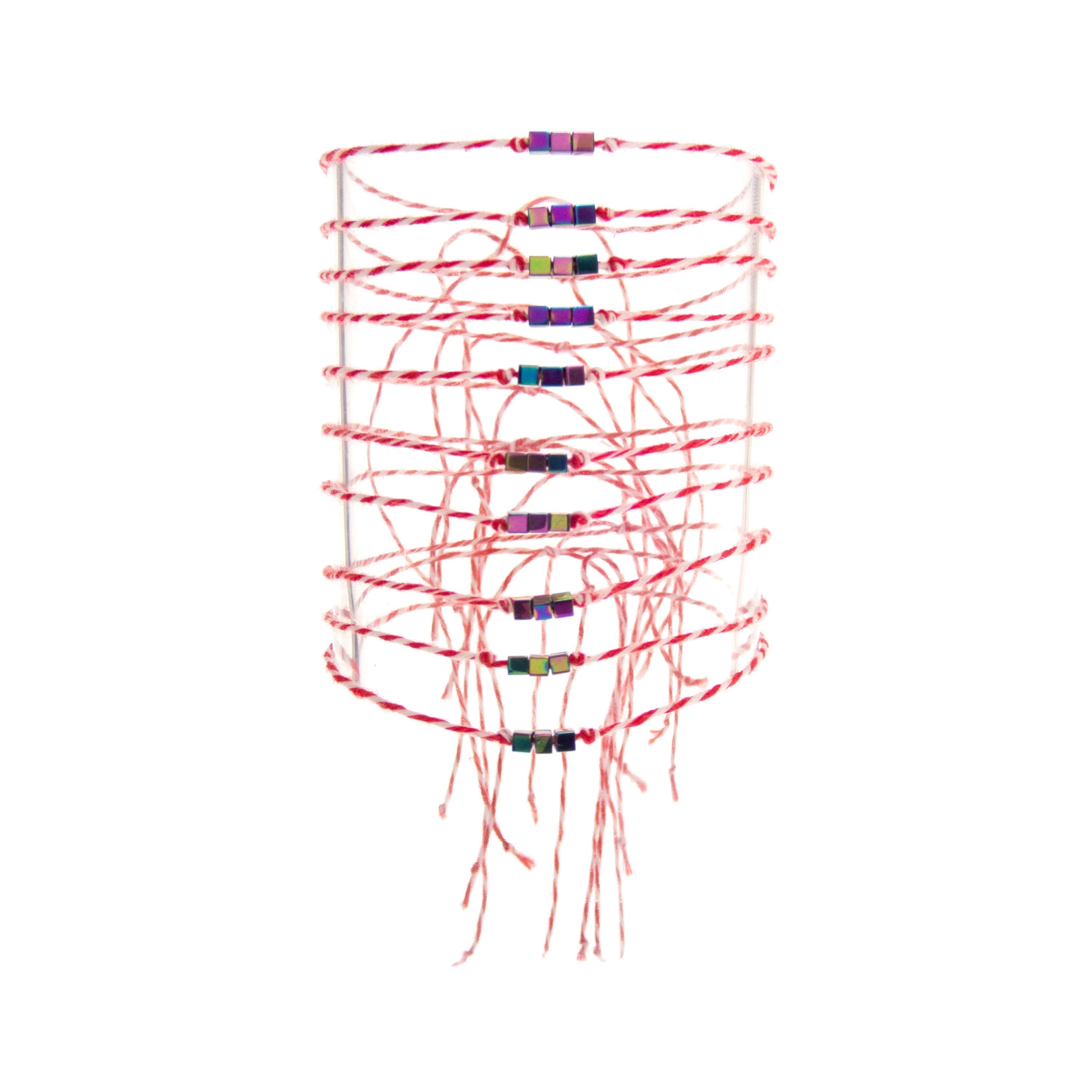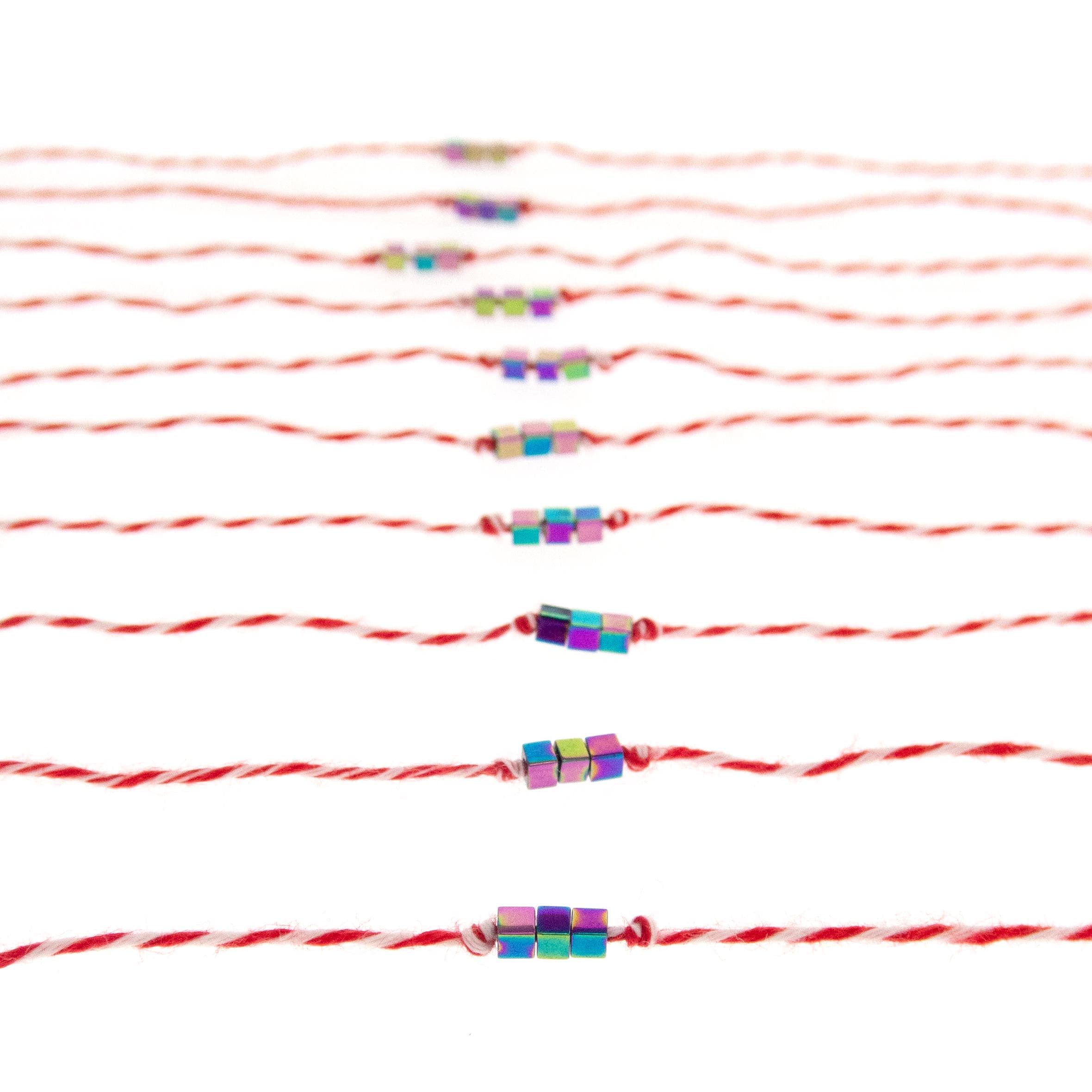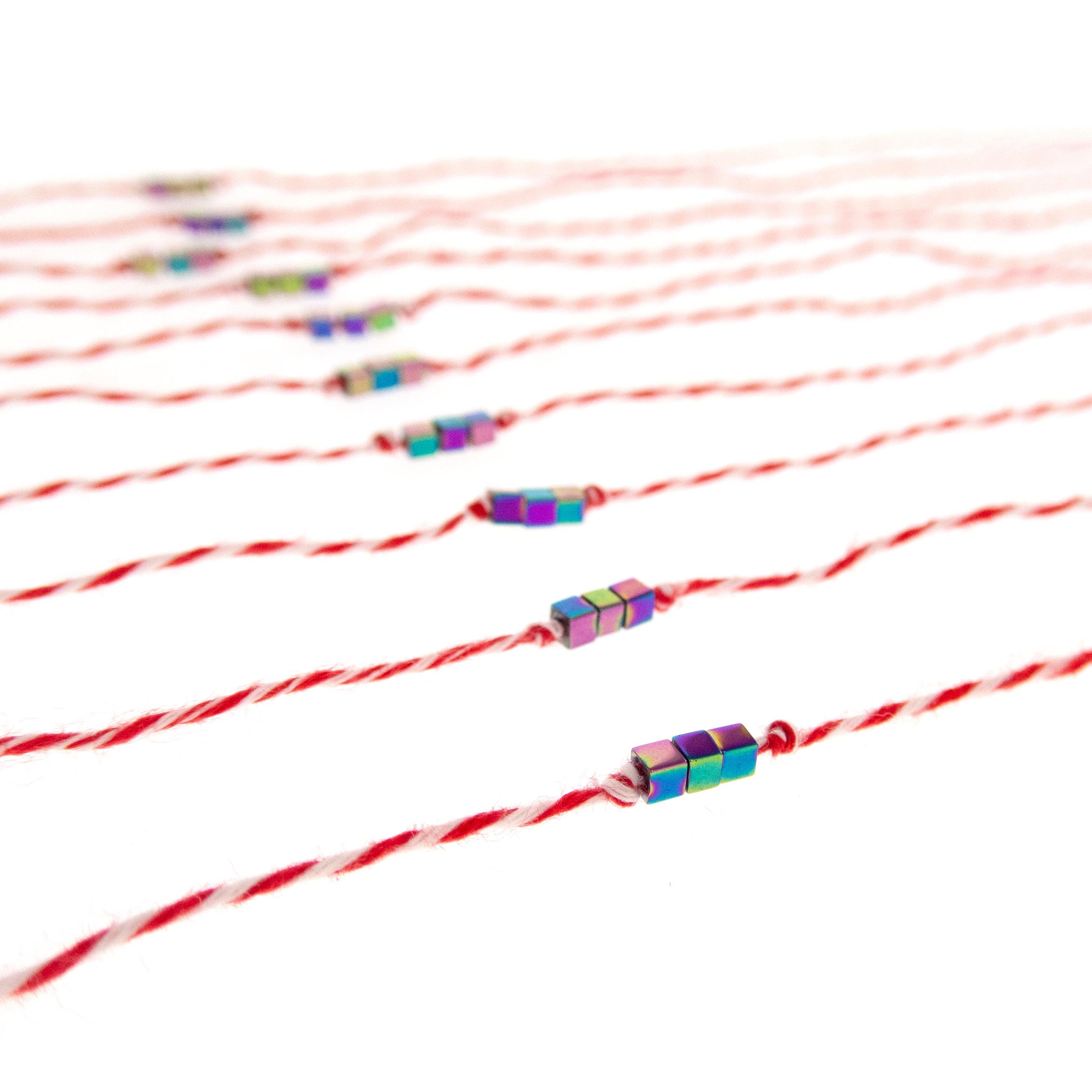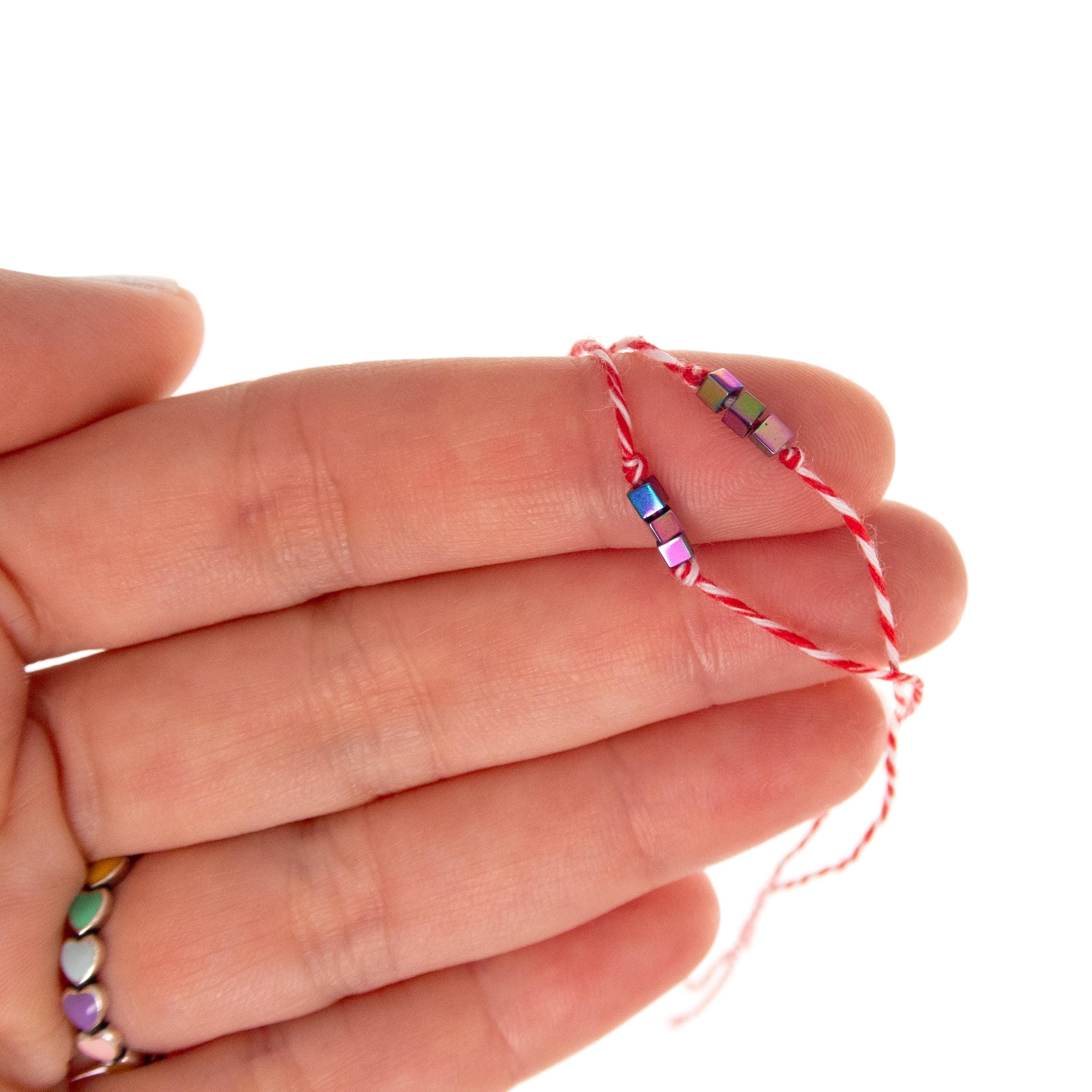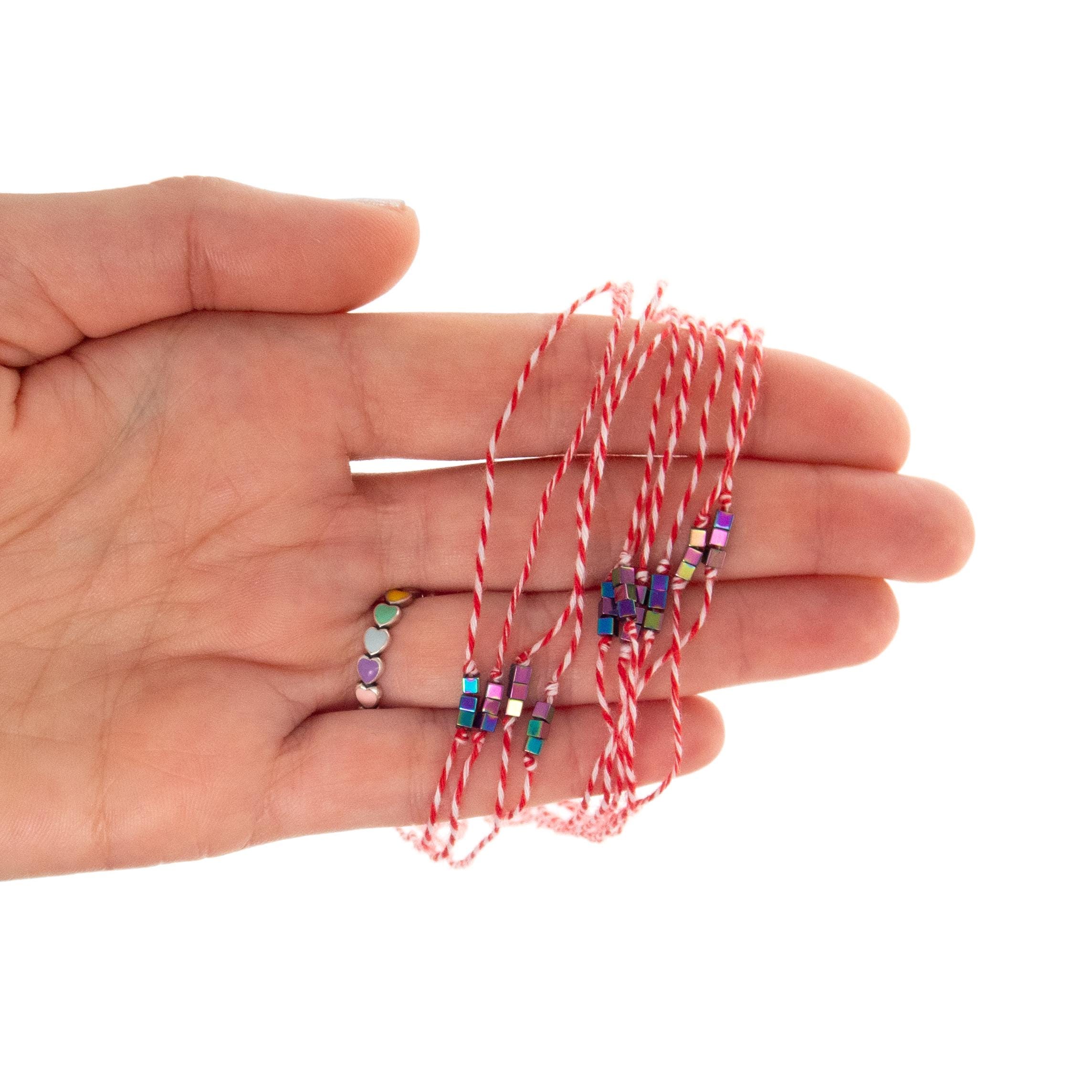 This is set of 10 Simple Thin Bracelets. Handmade of super thin cotton thread and miniature hematite gemstone square beads. These are red and white friendship bracelets, created by Nadamlada. Inspired of martenitsa, martisoare, martisor March bracelets, famous in Bulgaria, Greece, Moldova and Romania. Handmade of super thin cotton thread and decorated with 3 minimalist beads in square shape. The beads are hematite gemstone (Stone Beads Shamballa Beads) with rainbow color changing color. The red and white colors symbolize the transition from winter to spring. You can use these bracelets as wristband favors or small gifts for your guests at parties, events, birthdays or weddings.