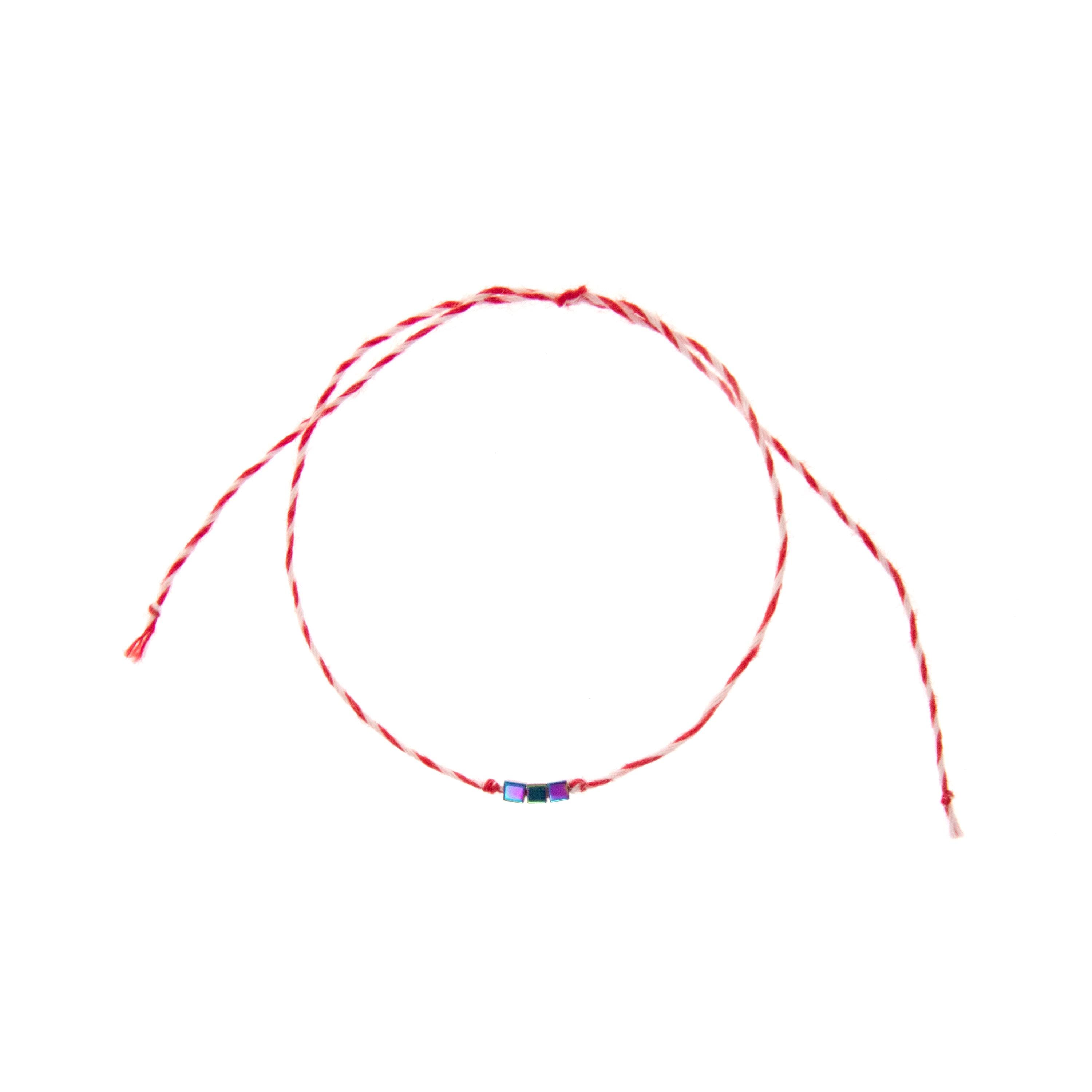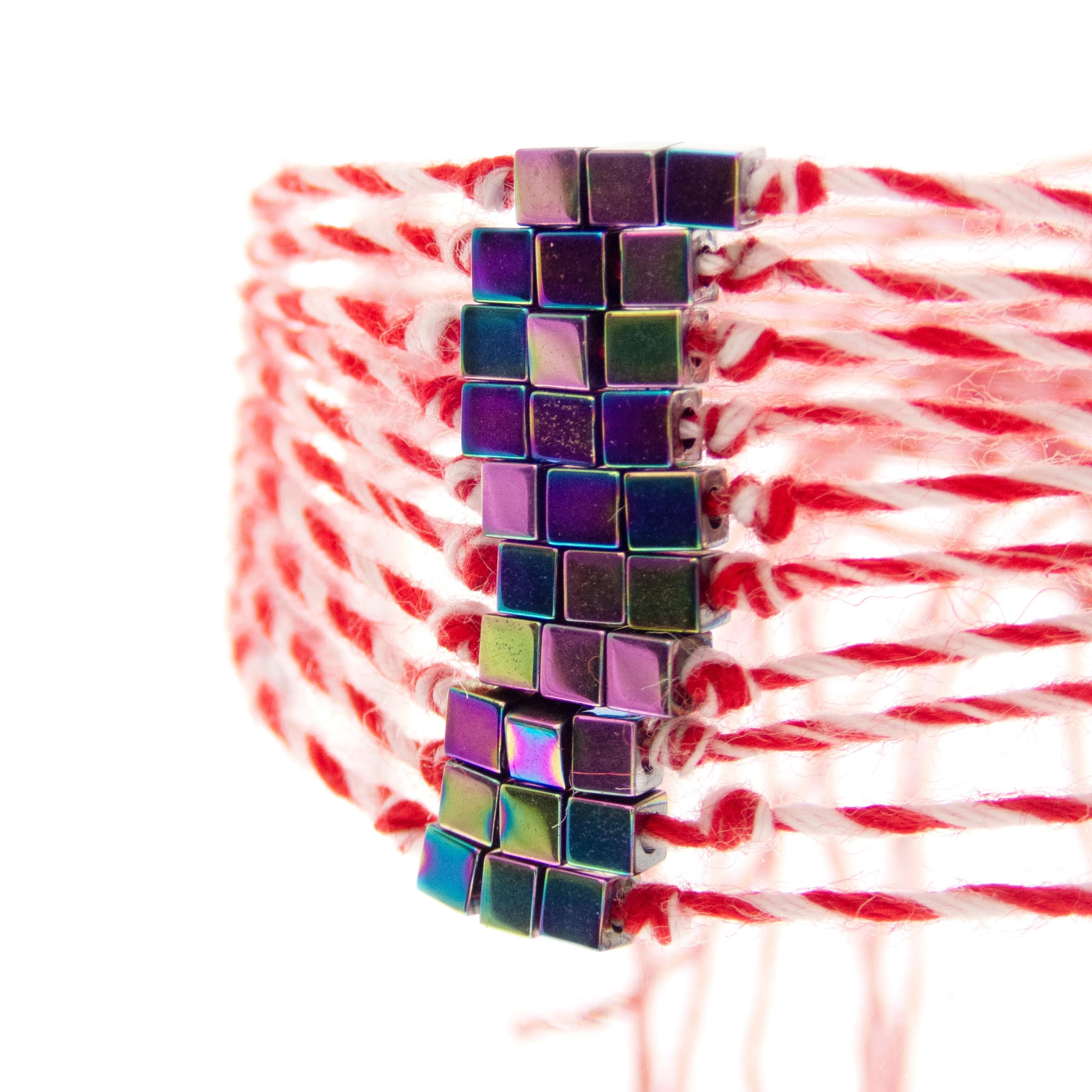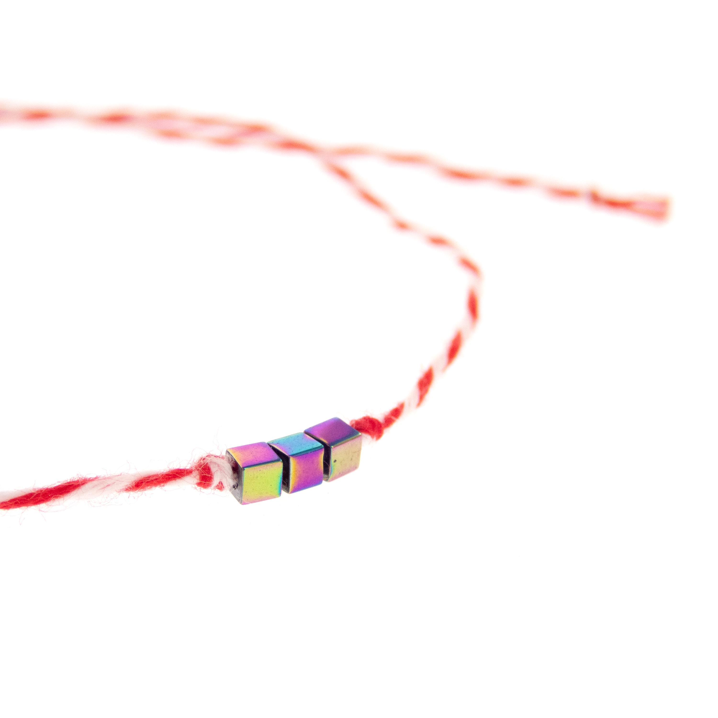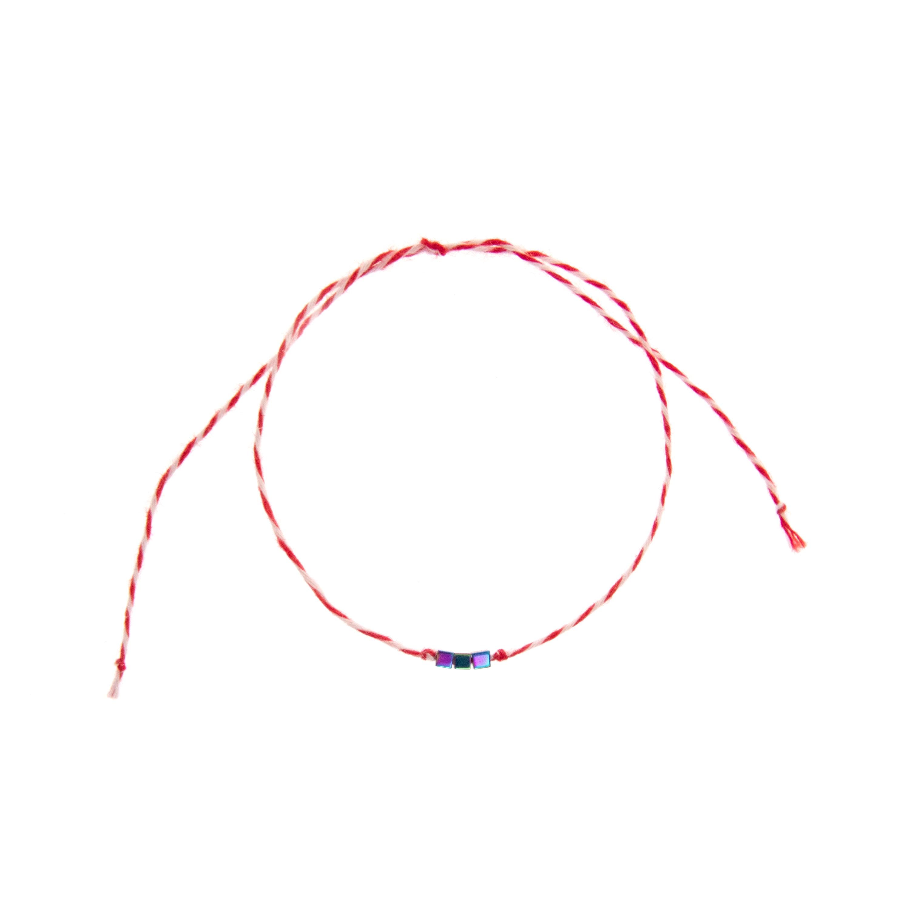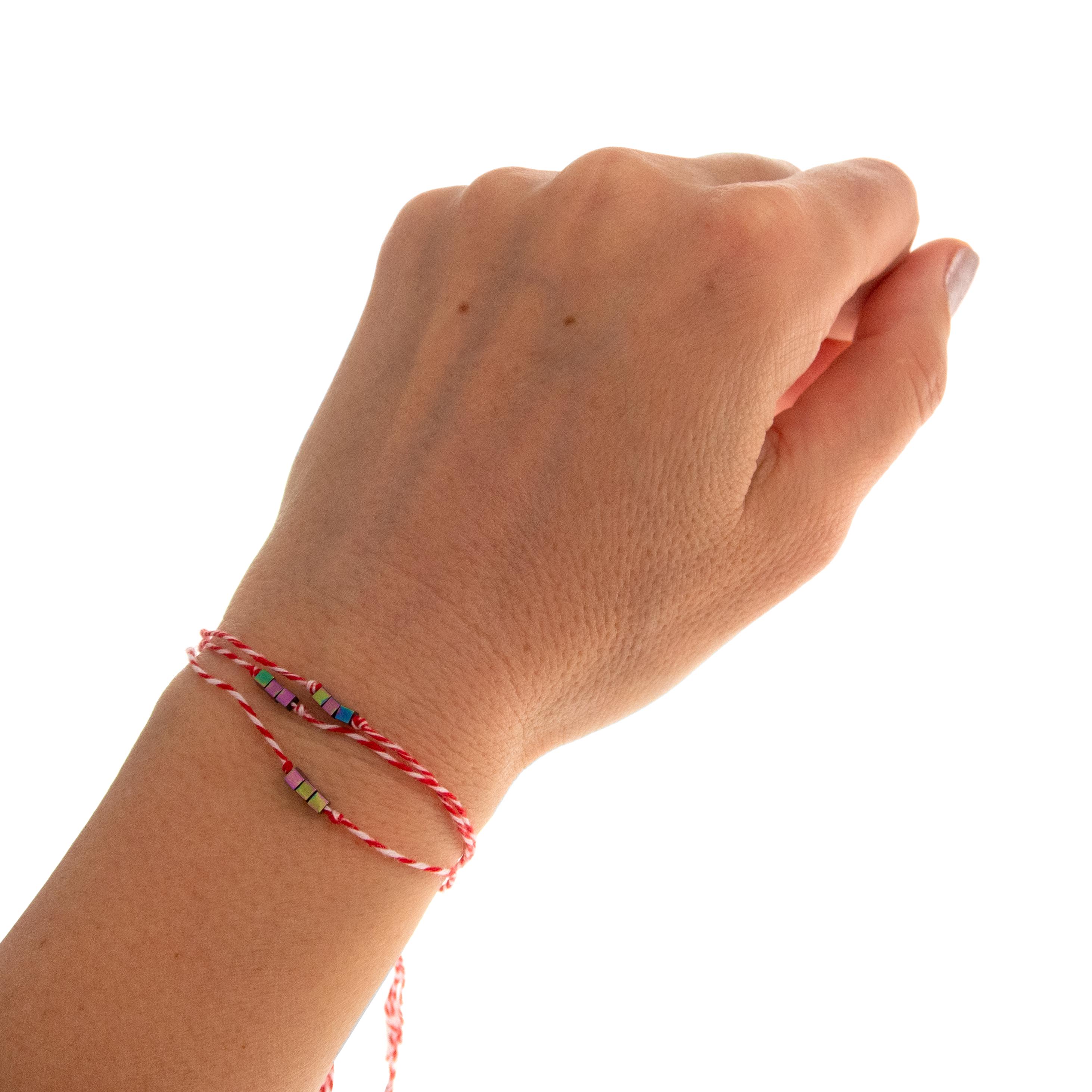 This is set of 10 Simple Thin Bracelets. Handmade of super thin cotton thread and miniature hematite gemstone square beads. These are red and white friendship bracelets, created by Nadamlada. Inspired of martenitsa, martisoare, martisor March bracelets, famous in Bulgaria, Greece, Moldova and Romania. Handmade of super thin cotton thread and decorated with 3 minimalist beads in square shape. The beads are hematite gemstone (Stone Beads Shamballa Beads) with rainbow color changing color. The red and white colors symbolize the transition from winter to spring. You can use these bracelets as wristband favors or small gifts for your guests at parties, events, birthdays or weddings.