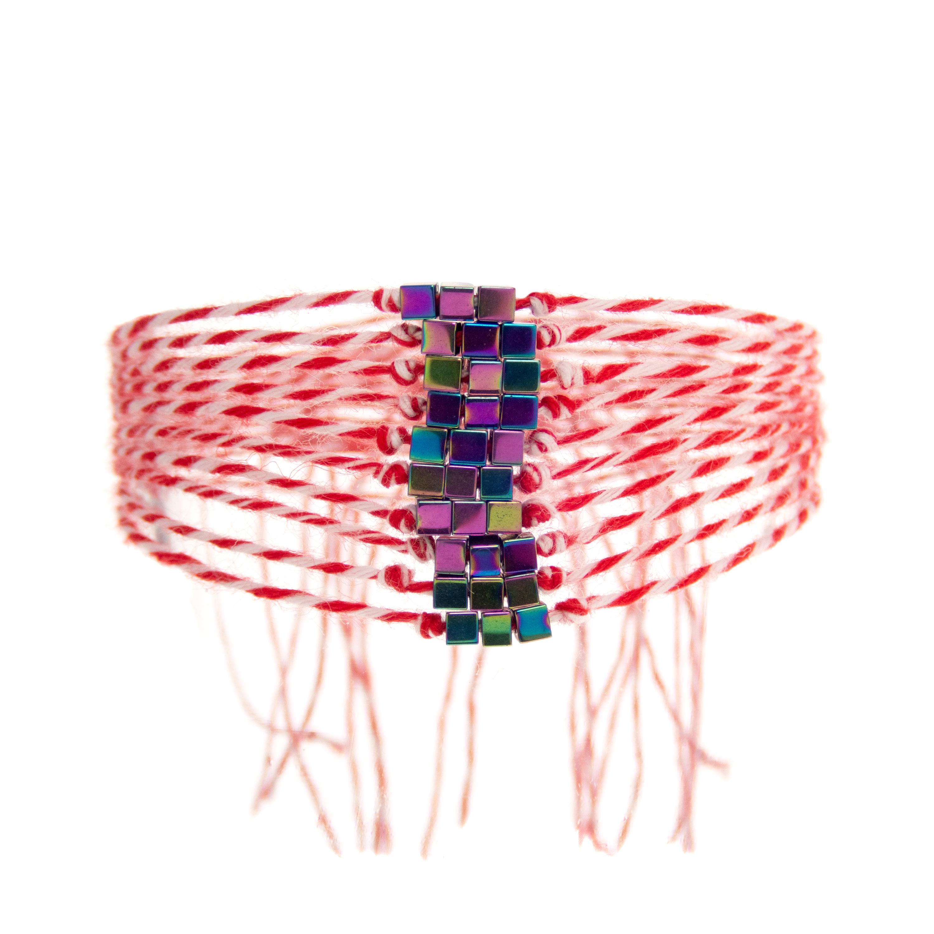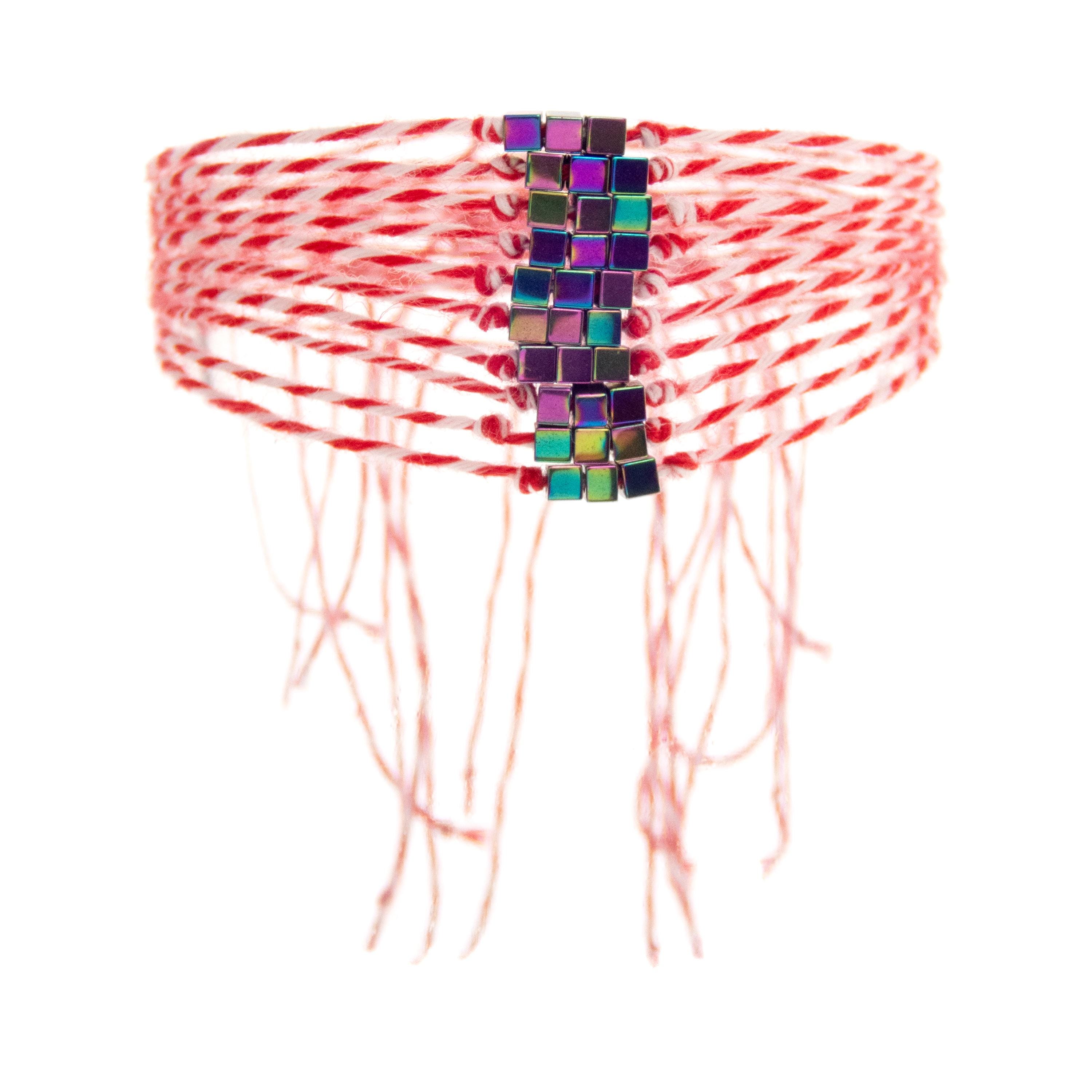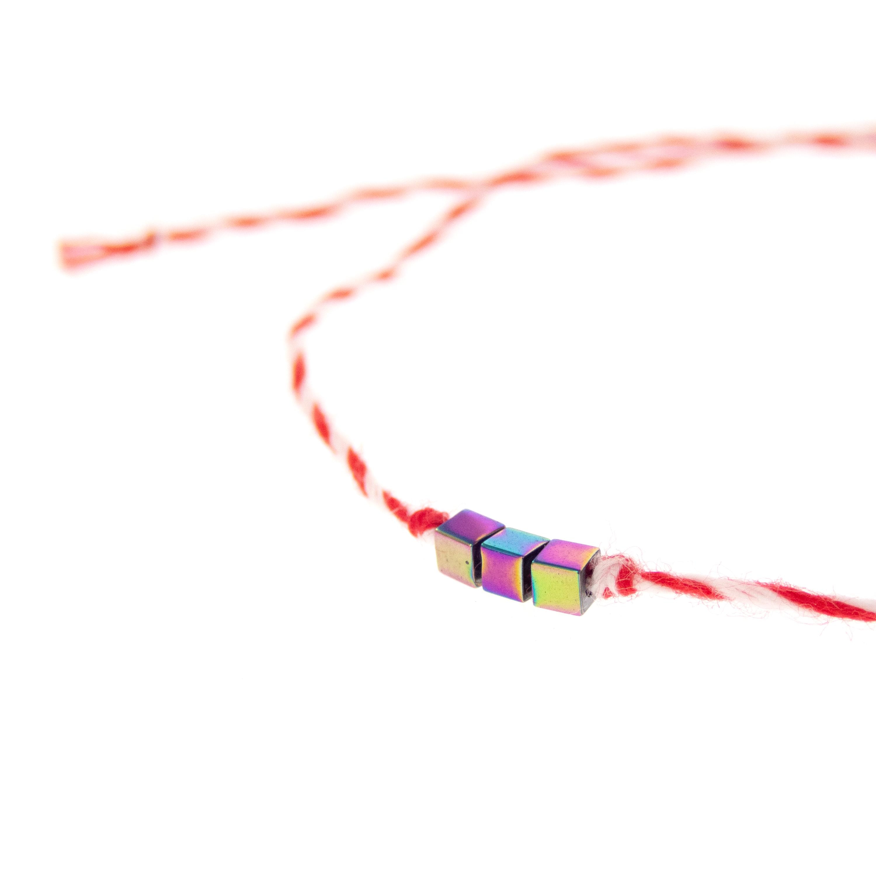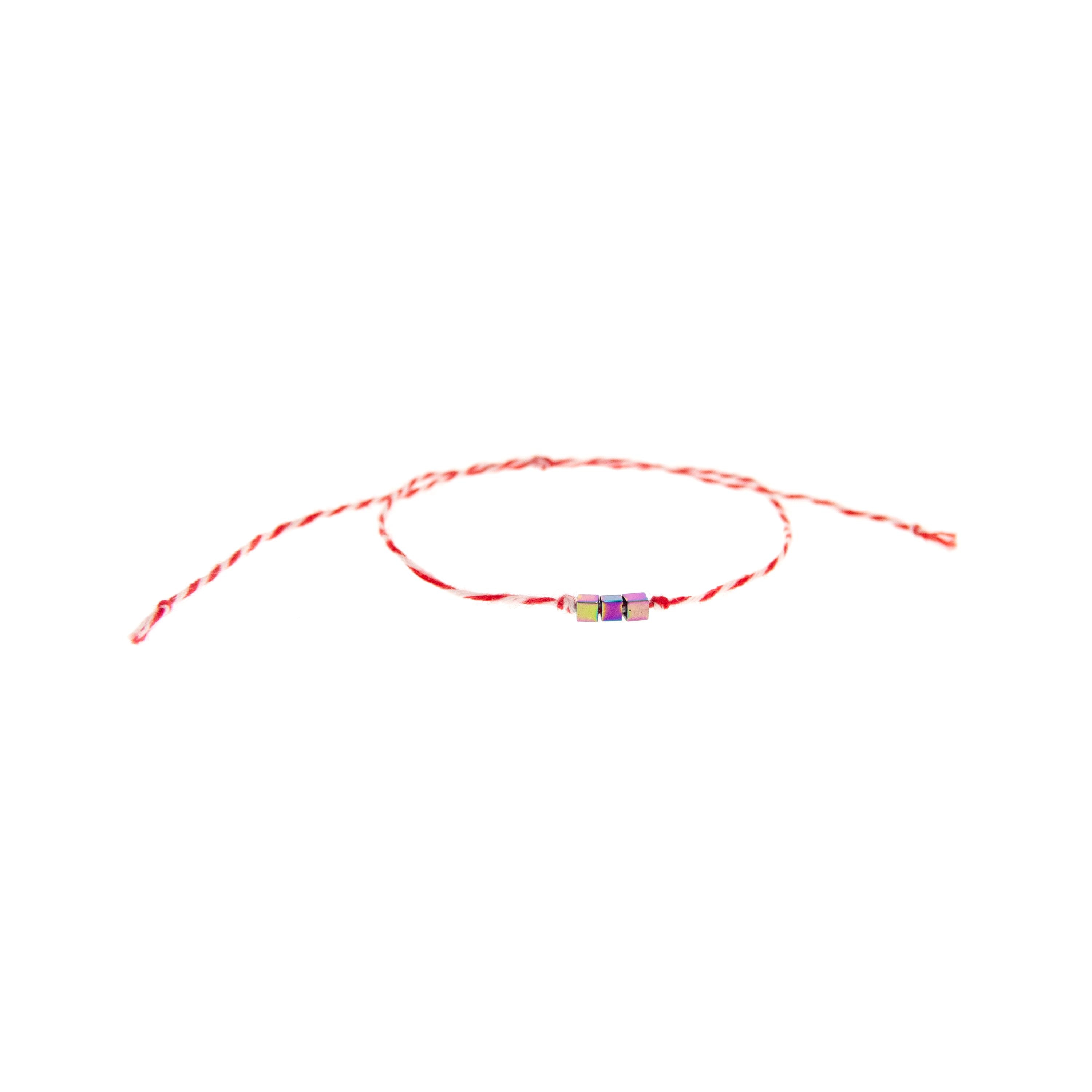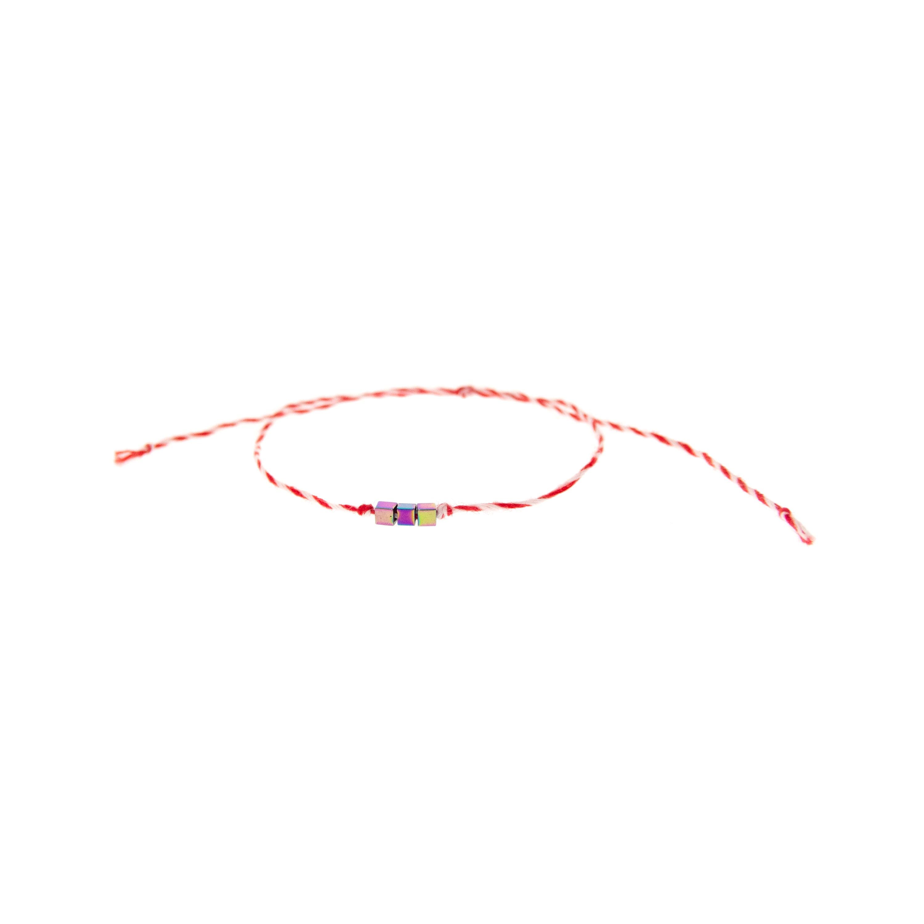 This is set of 10 Simple Thin Bracelets. Handmade of super thin cotton thread and miniature hematite gemstone square beads. These are red and white friendship bracelets, created by Nadamlada. Inspired of martenitsa, martisoare, martisor March bracelets, famous in Bulgaria, Greece, Moldova and Romania. Handmade of super thin cotton thread and decorated with 3 minimalist beads in square shape. The beads are hematite gemstone (Stone Beads Shamballa Beads) with rainbow color changing color. The red and white colors symbolize the transition from winter to spring. You can use these bracelets as wristband favors or small gifts for your guests at parties, events, birthdays or weddings.
