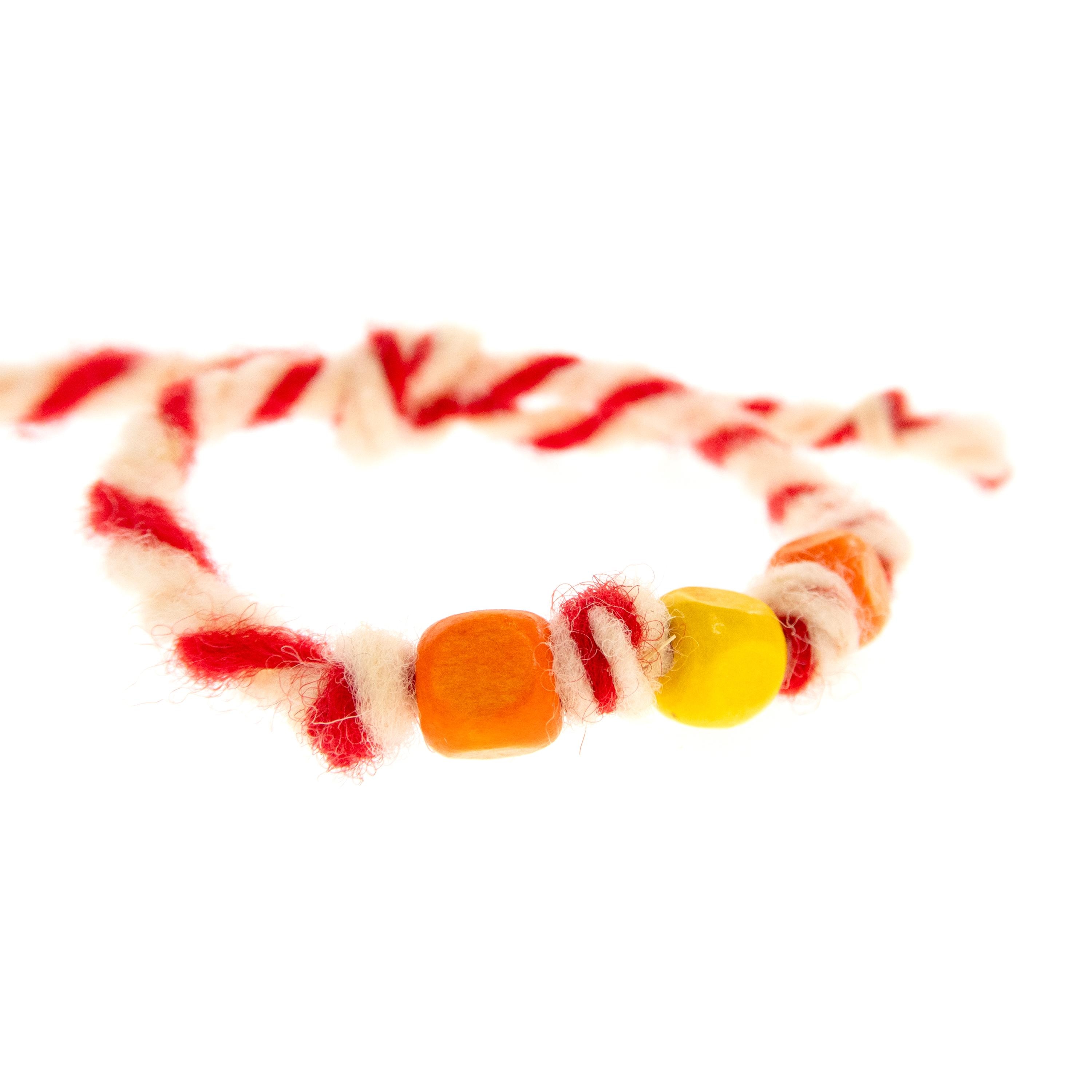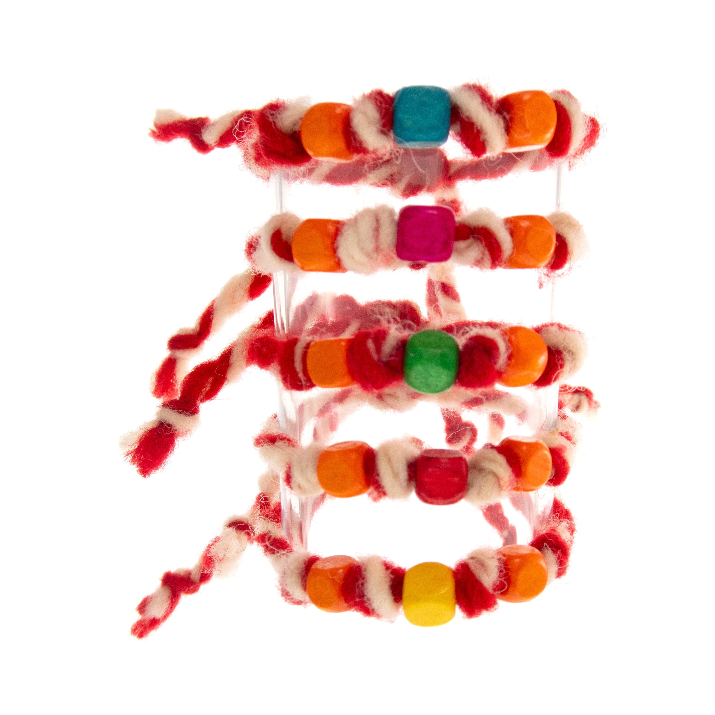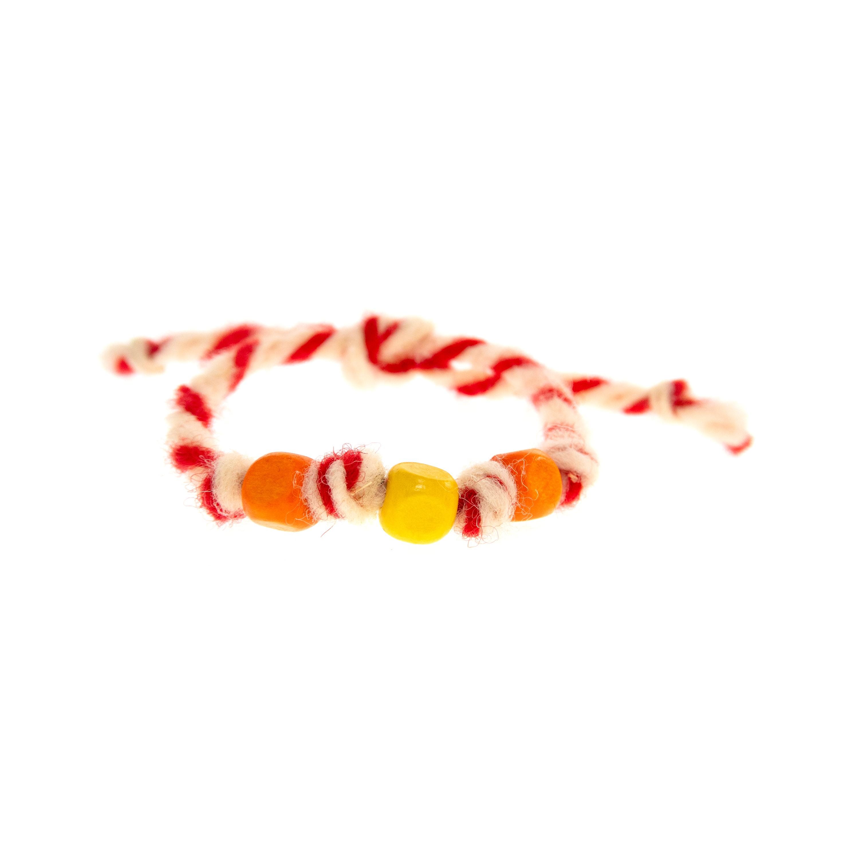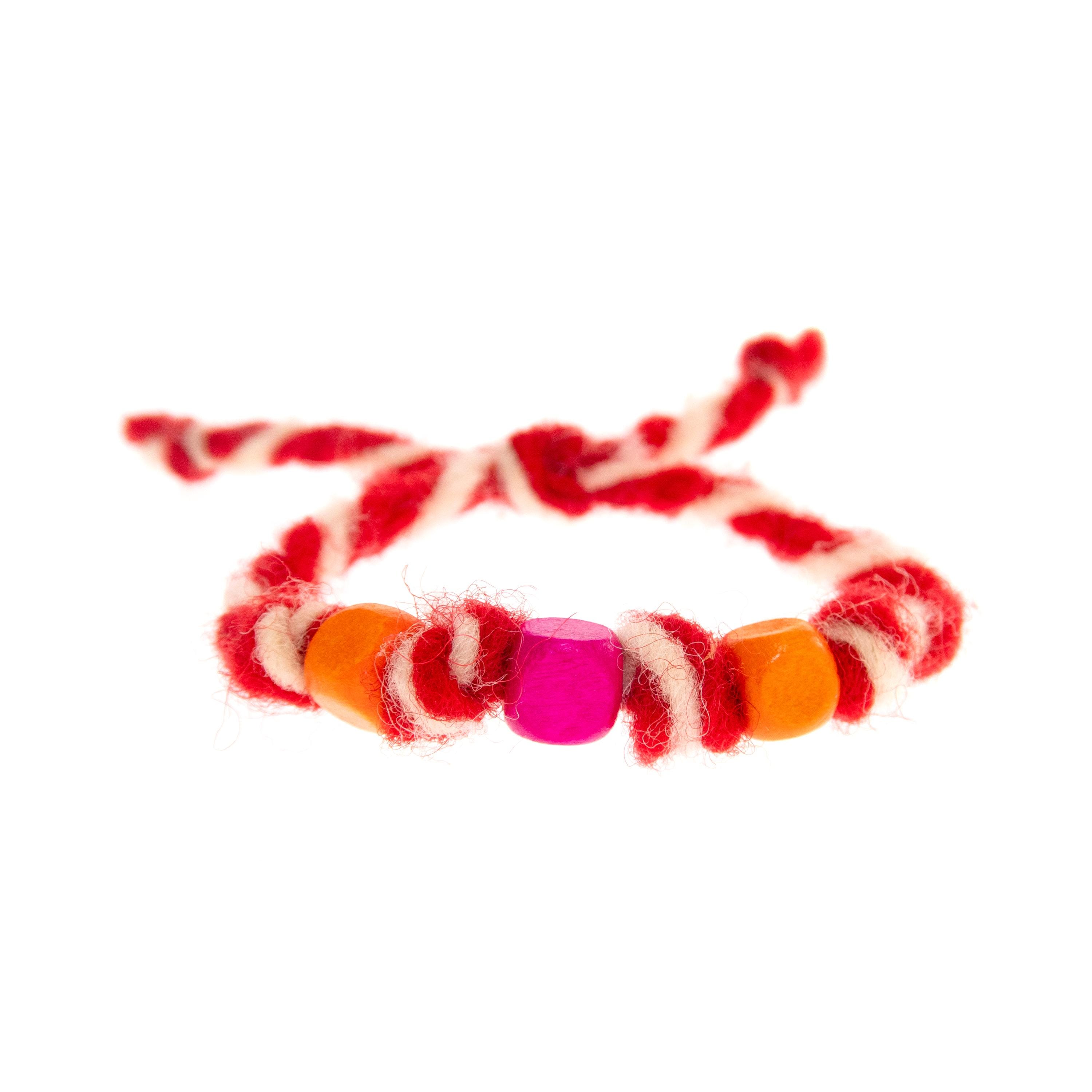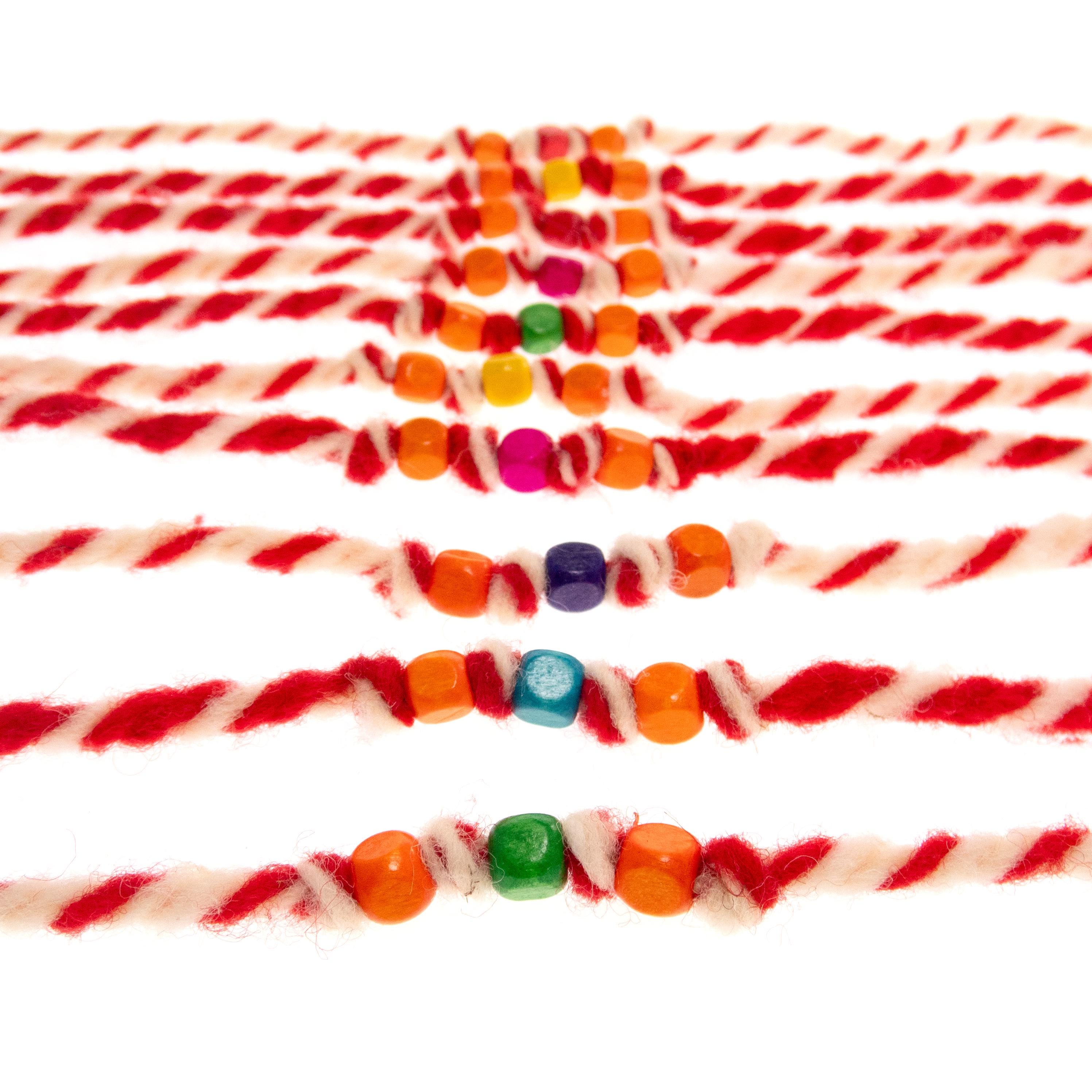 This is set of 10 Simple Thin Bracelets. Handmade wool yarn and colorful wooden beads. The accents are square shaped wood beads and knots. These are red and white friendship bracelets, created by Nadamlada. Inspired of martenitsa, martisoare, martisor March bracelets, famous in Bulgaria, Greece, Moldova and Romania. Handmade of wool yarn and decorated colorful accents. The red and white colors symbolize the transition from winter to spring. You can use these bracelets as wristband favors or small gifts for your guests at parties, events, birthdays or weddings. Made of natural materials.