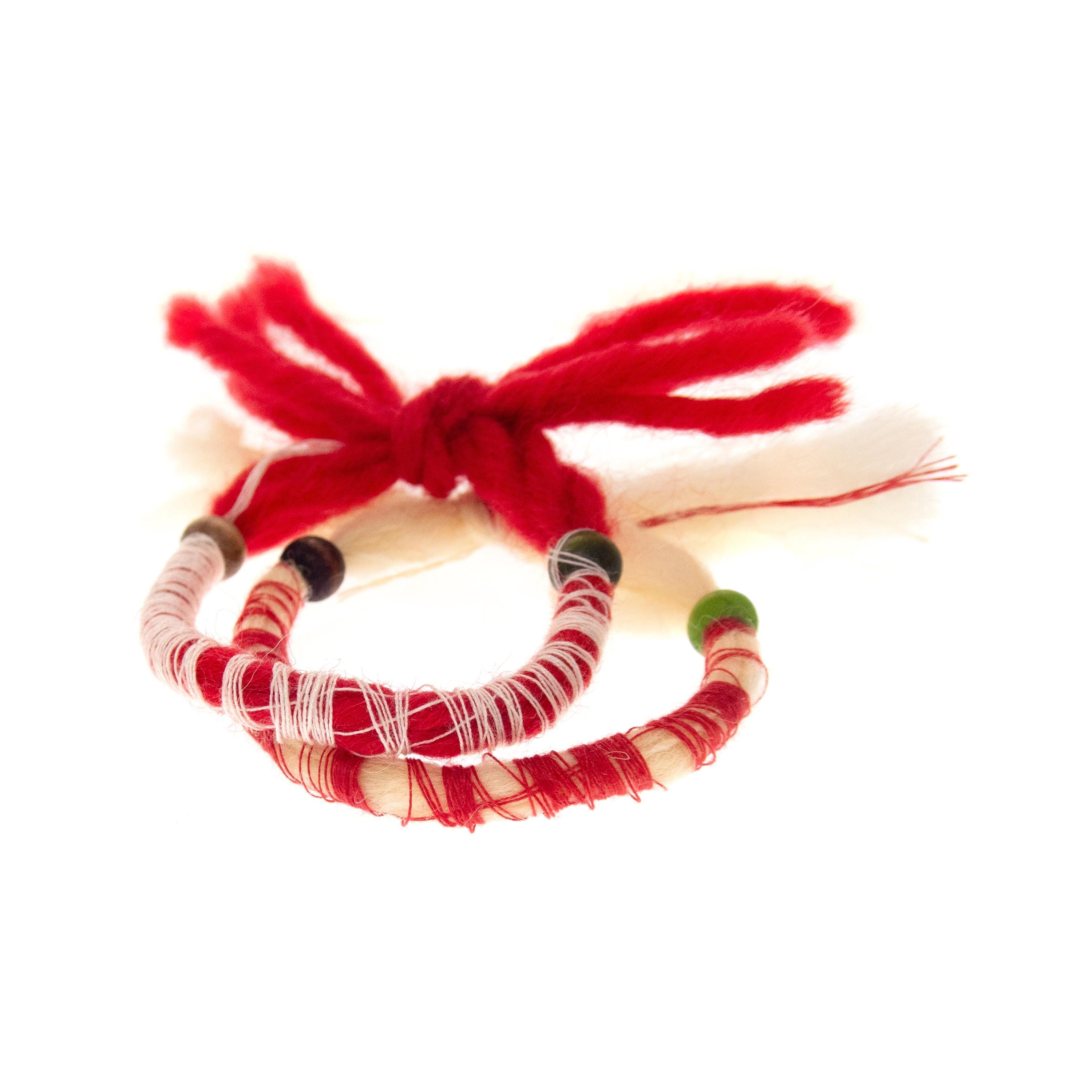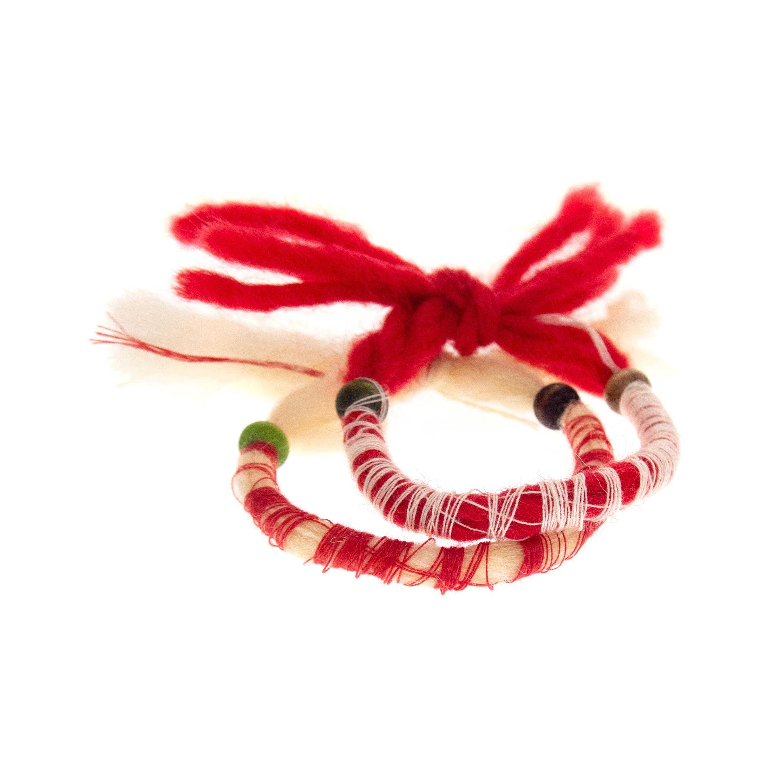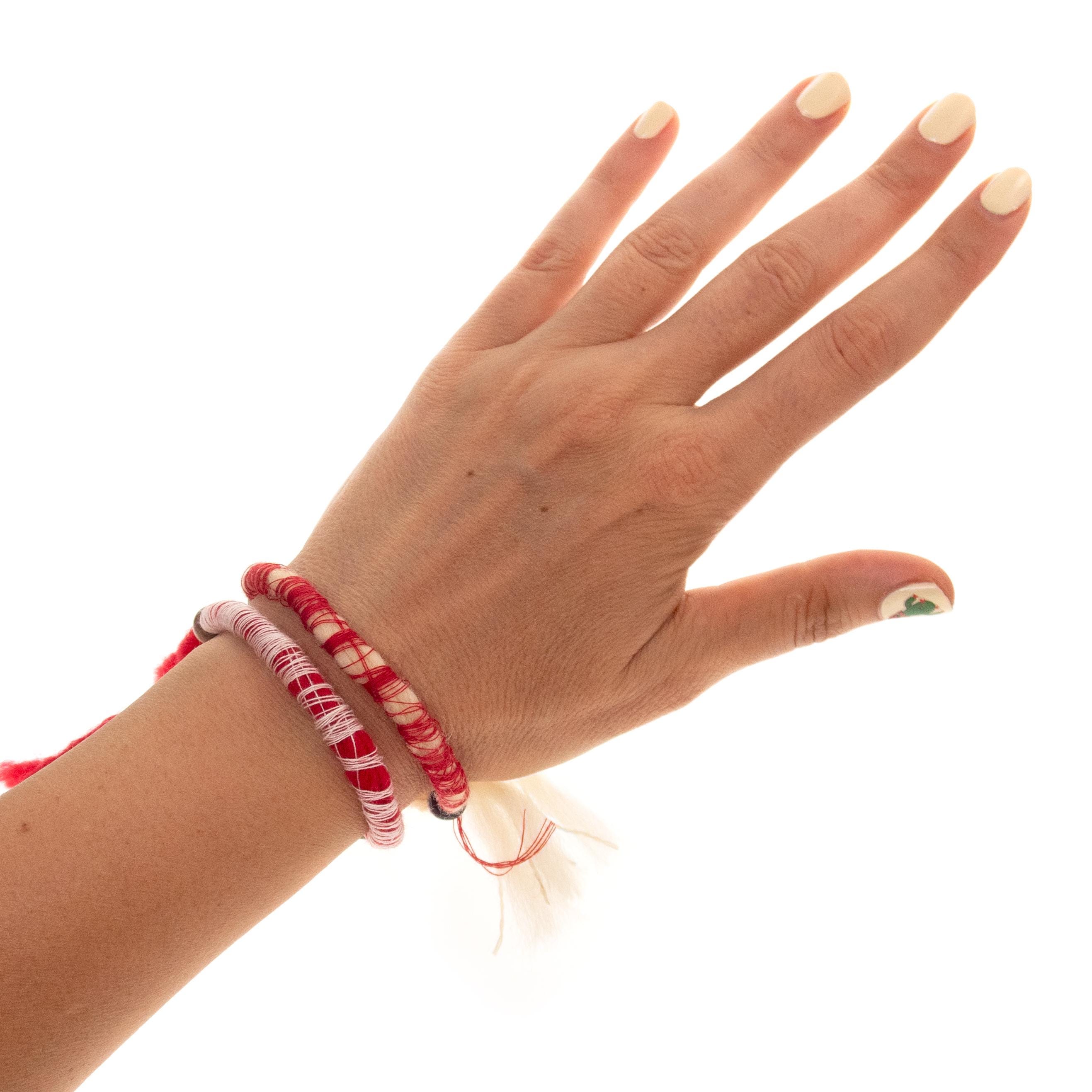 Nadamlada handmade these 10 Martenitsa Bracelets Bulgaria of natural wool, twisted with cotton thread. These Baba Marta bracelets are adjustable and comfortably fits womens and mens wrists. Luxury and handmade, they are Bulgarian Martenicka bracelets of red and white string and yarn, traditional for March 1st, worn on the hands. Other common names of the martenitsas are martenichki, martis, martisoare, martisor. Celebrate the beloved Bulgarian tradition of Baba Marta with our handcrafted Martenitsa bracelets. Each bracelet is a symbol of health, happiness, and prosperity, worn from March 1st until the first sight of spring. This set of 10 bracelets is perfect for sharing the joy of the season with friends and family.
