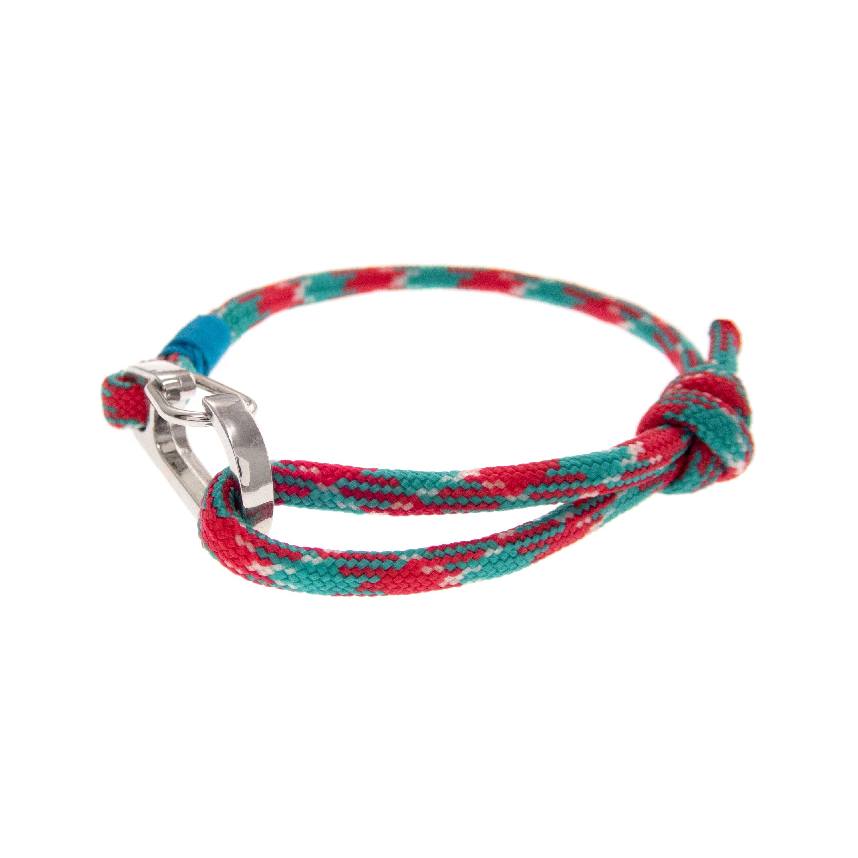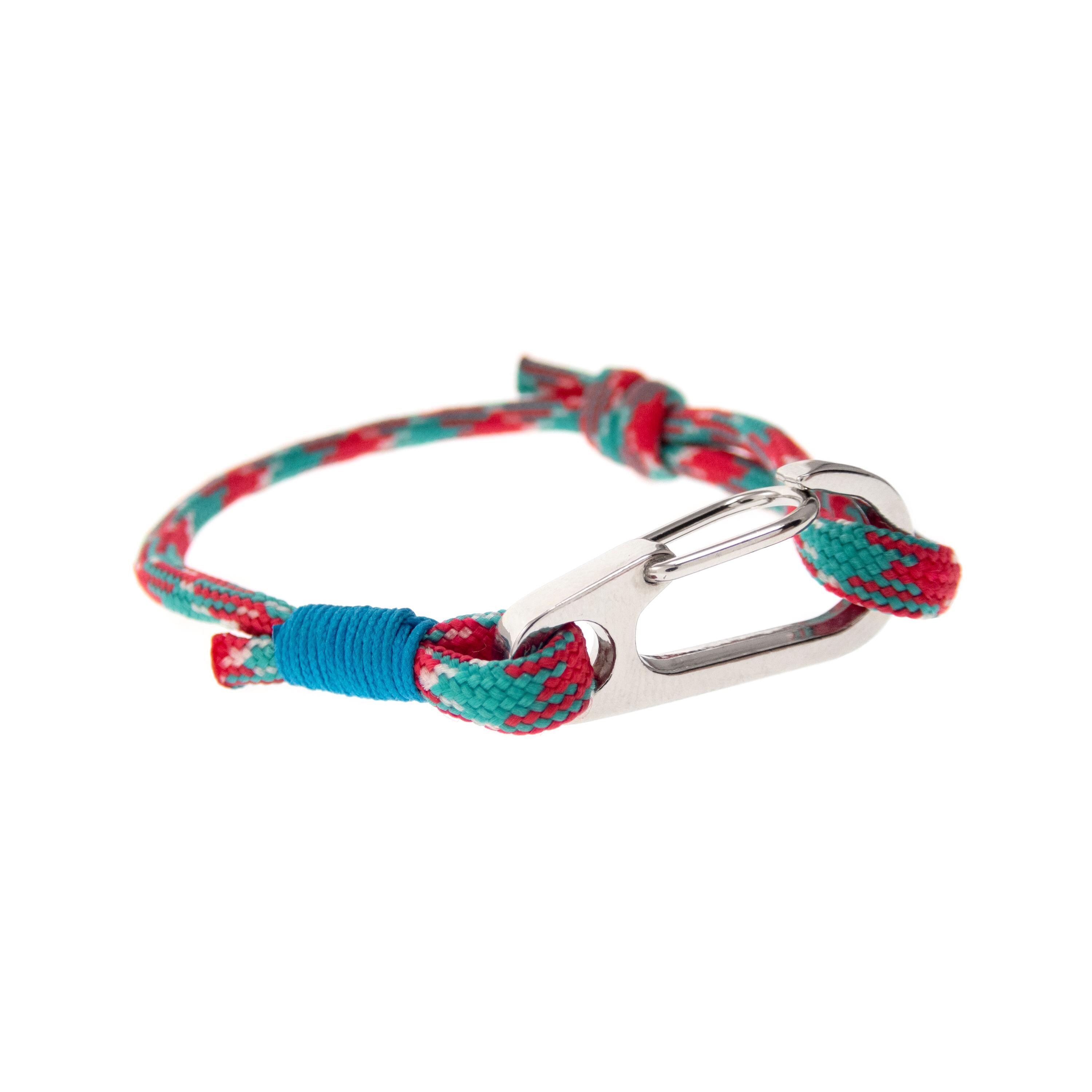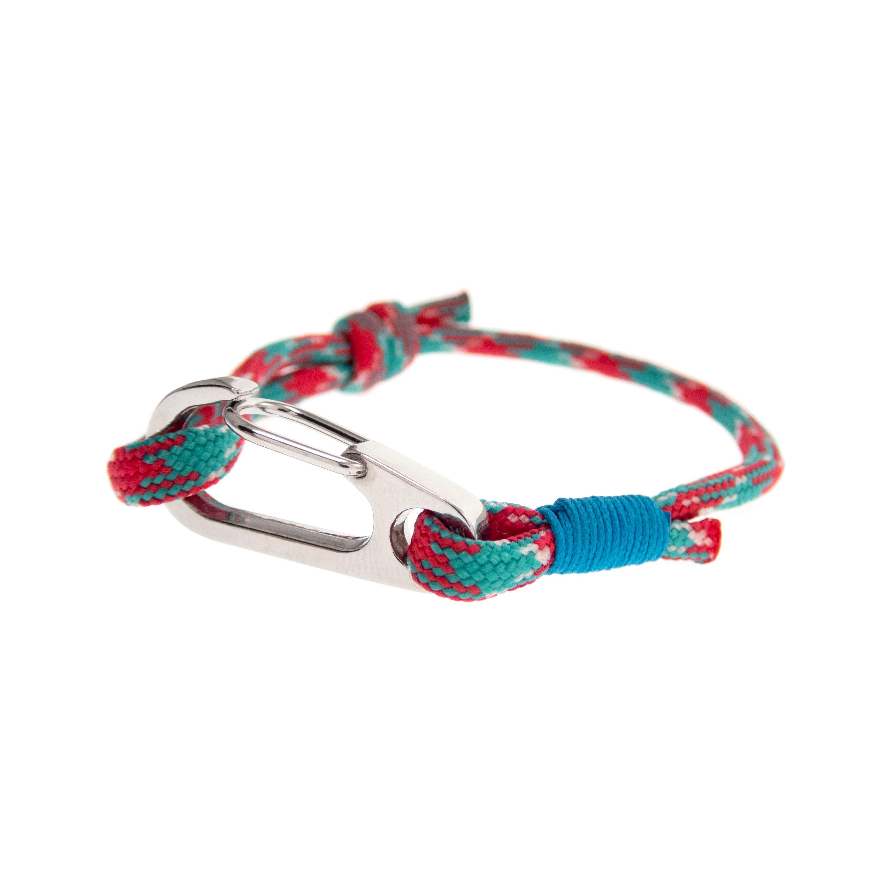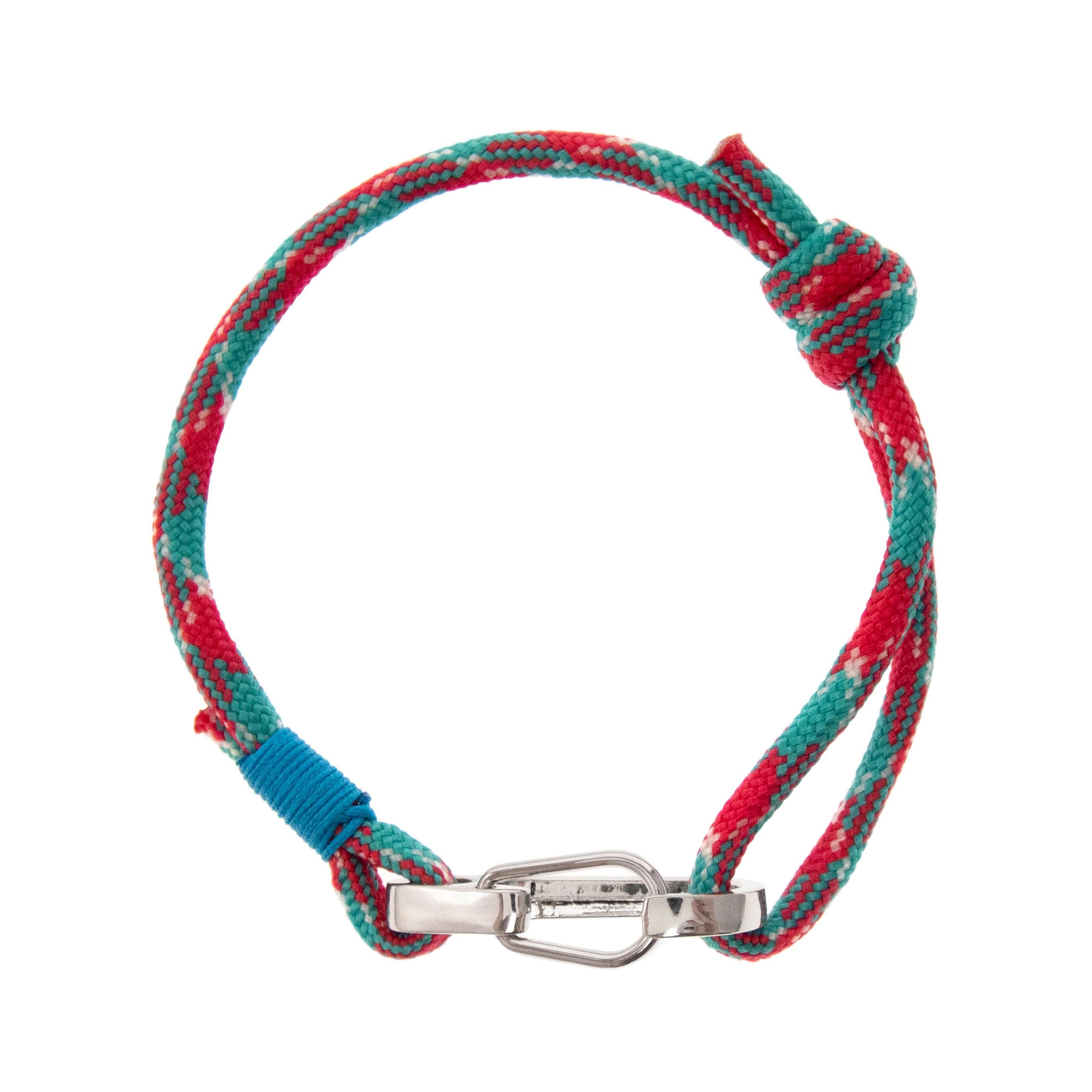 * The colors of the main pictured rope bracelet are red, green and white, with turquoise blue accent. The clasp is big, silver color