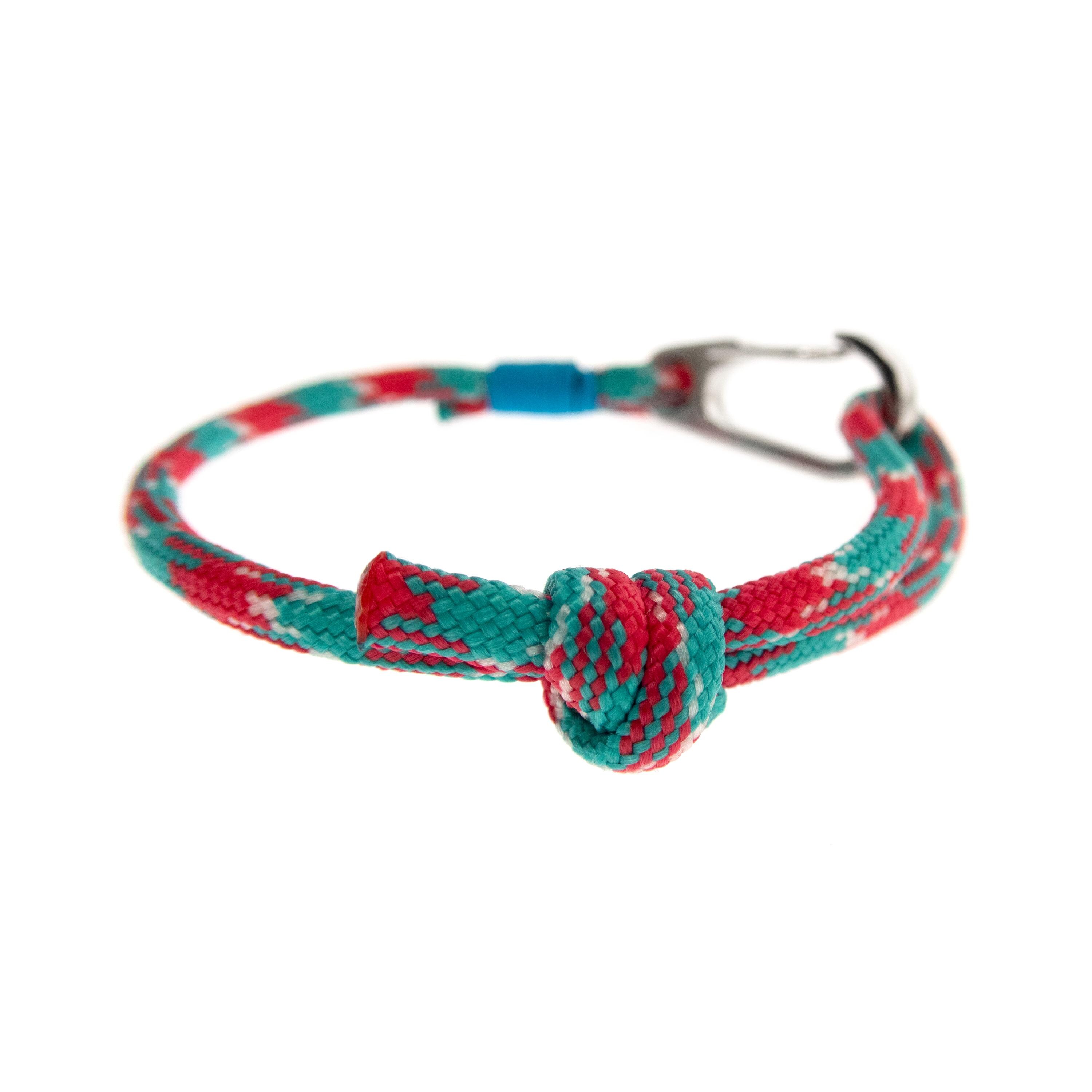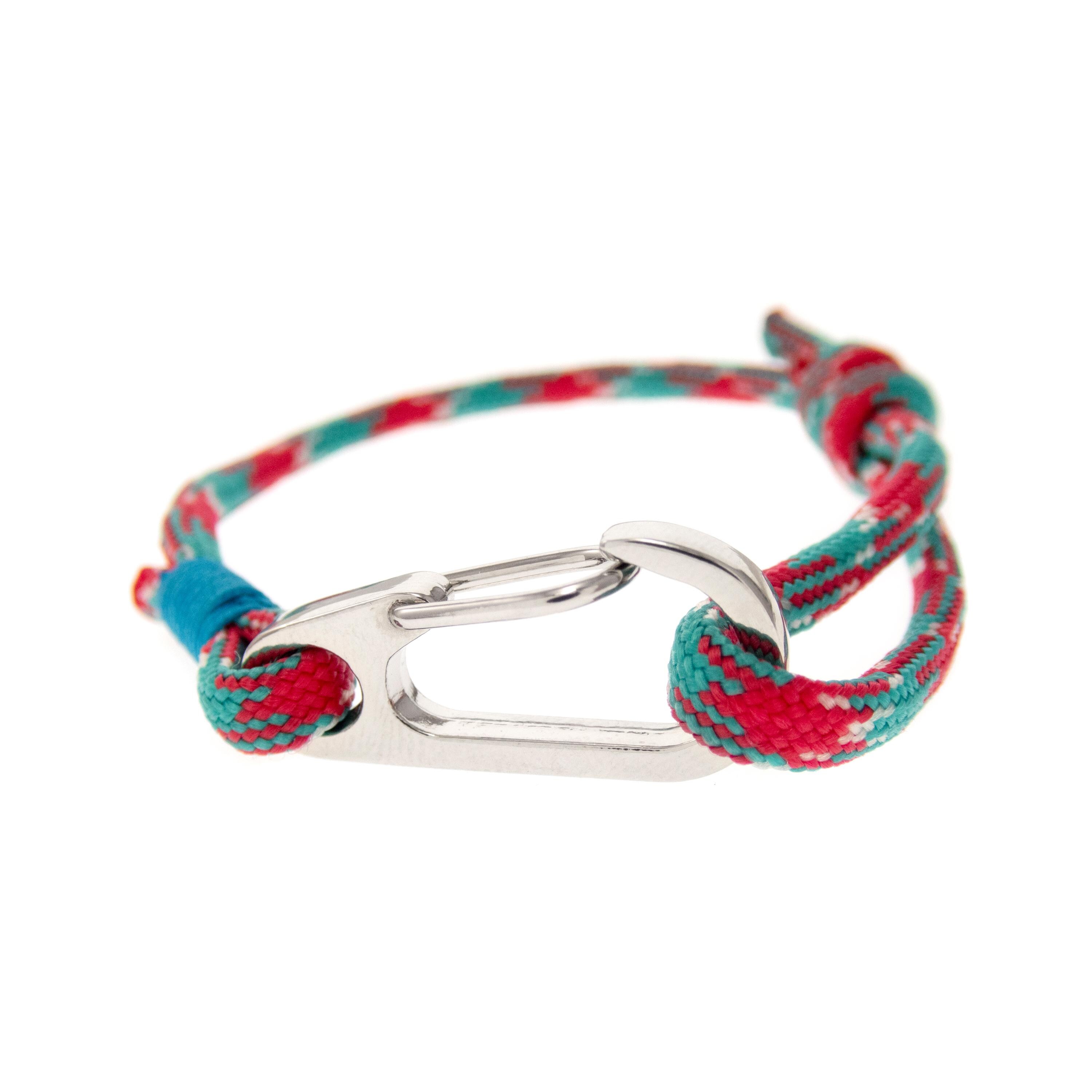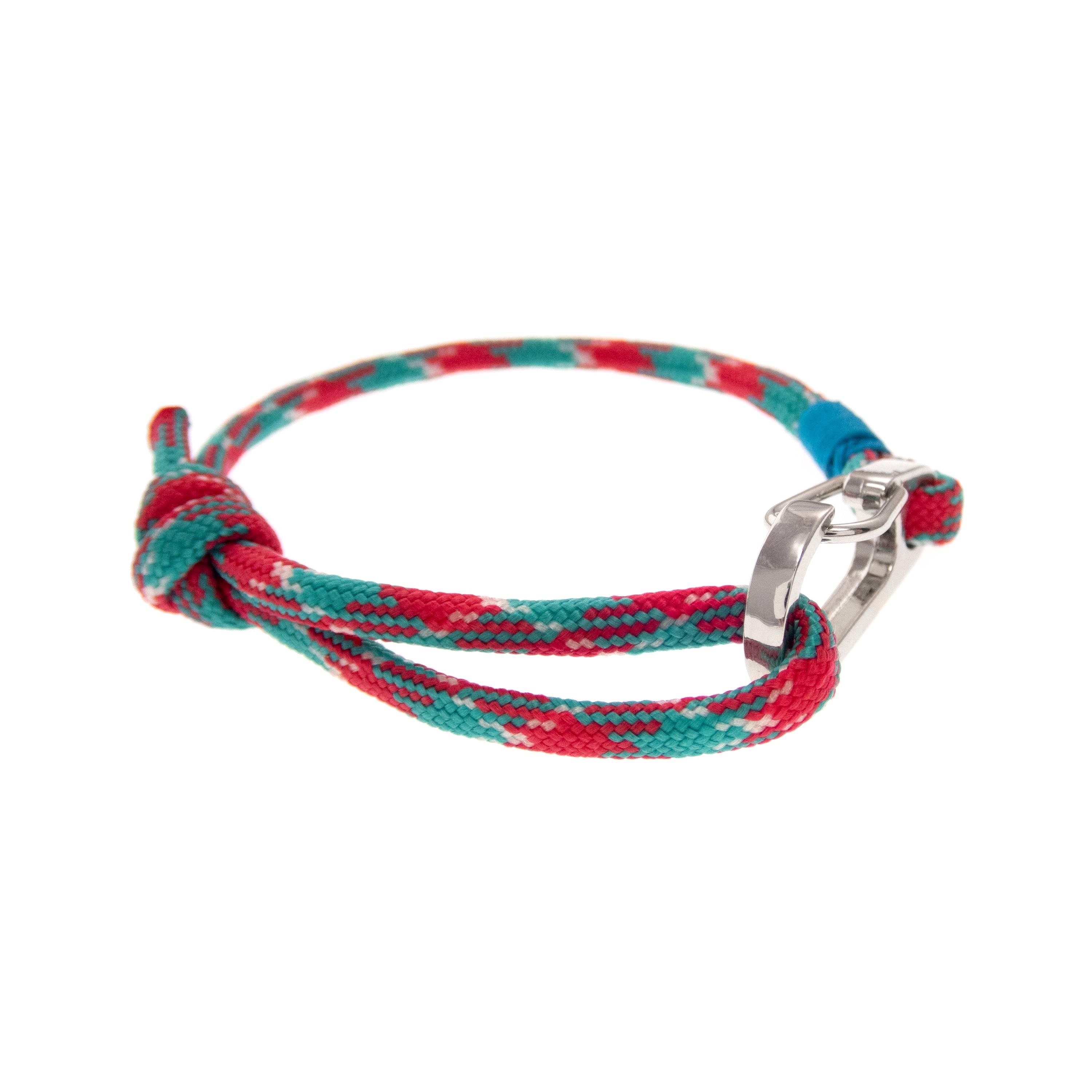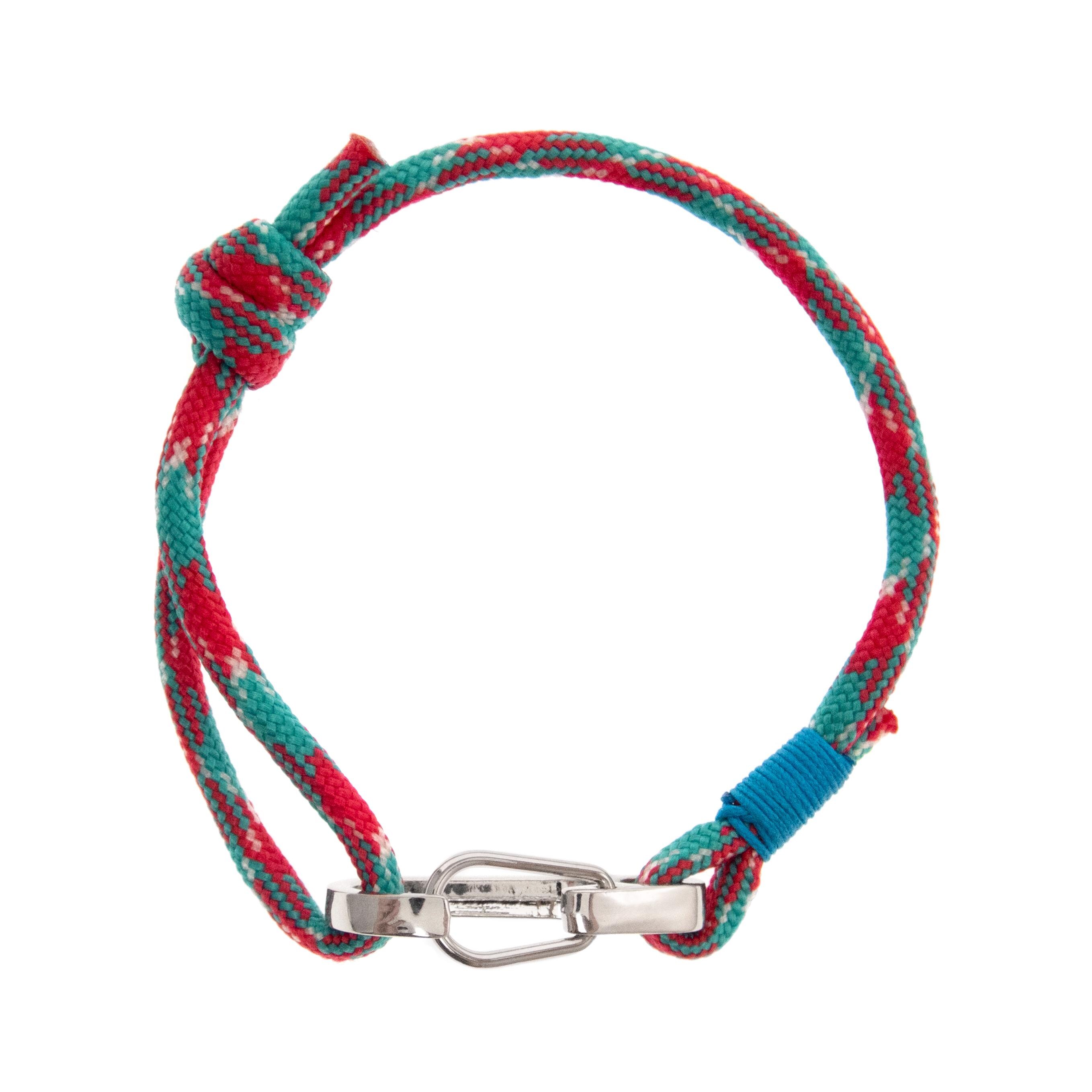* The colors of the main pictured rope bracelet are red, green and white, with turquoise blue accent. The clasp is big, silver color