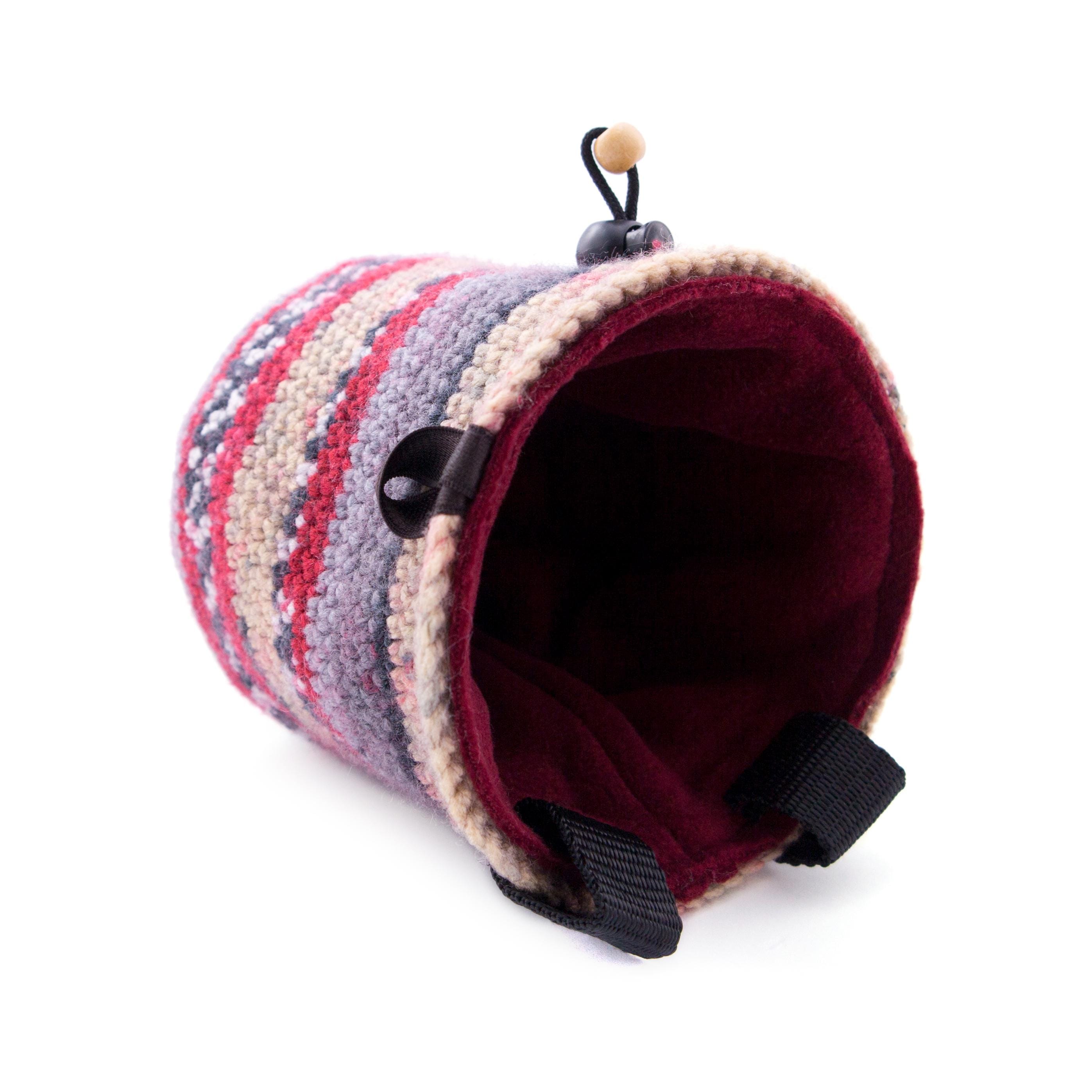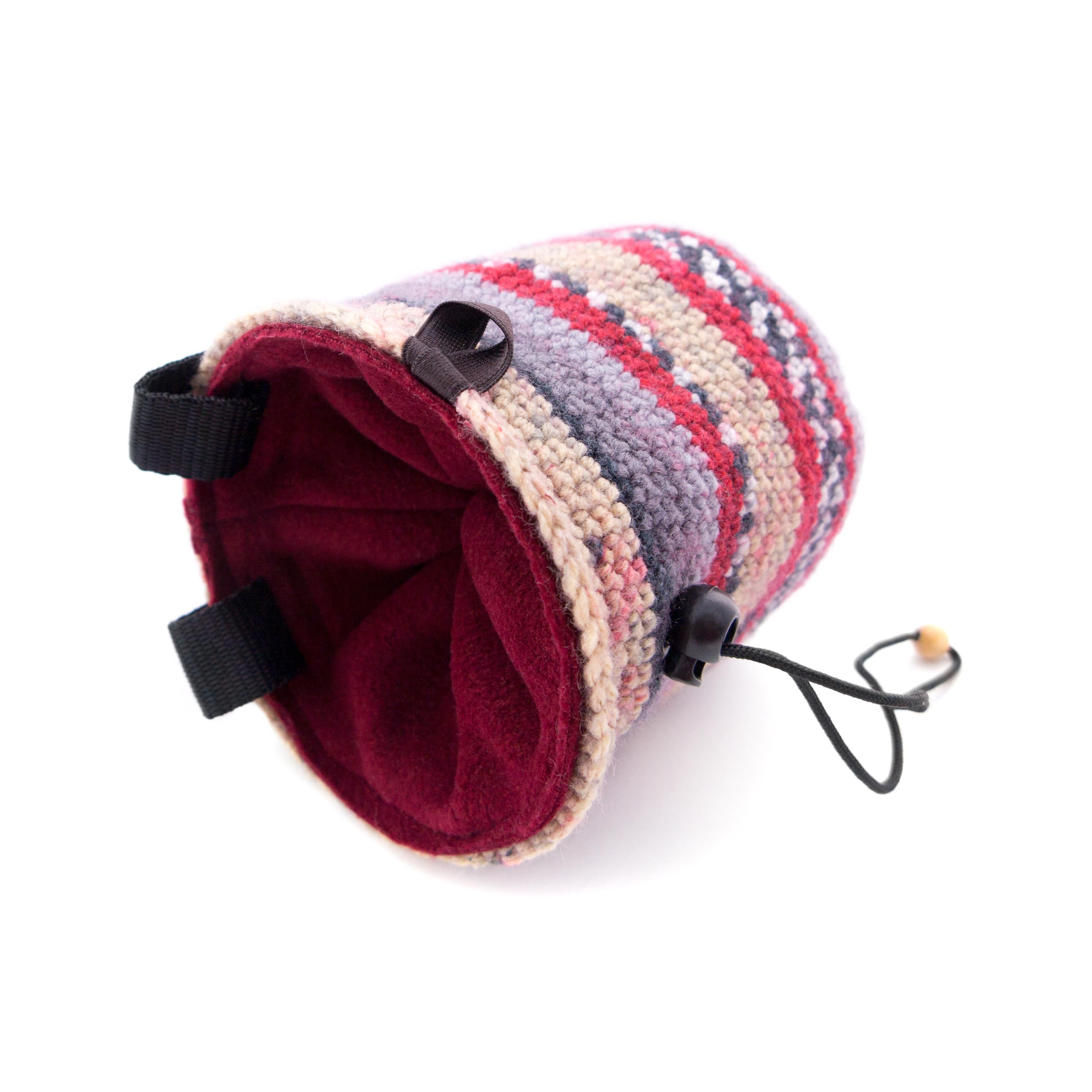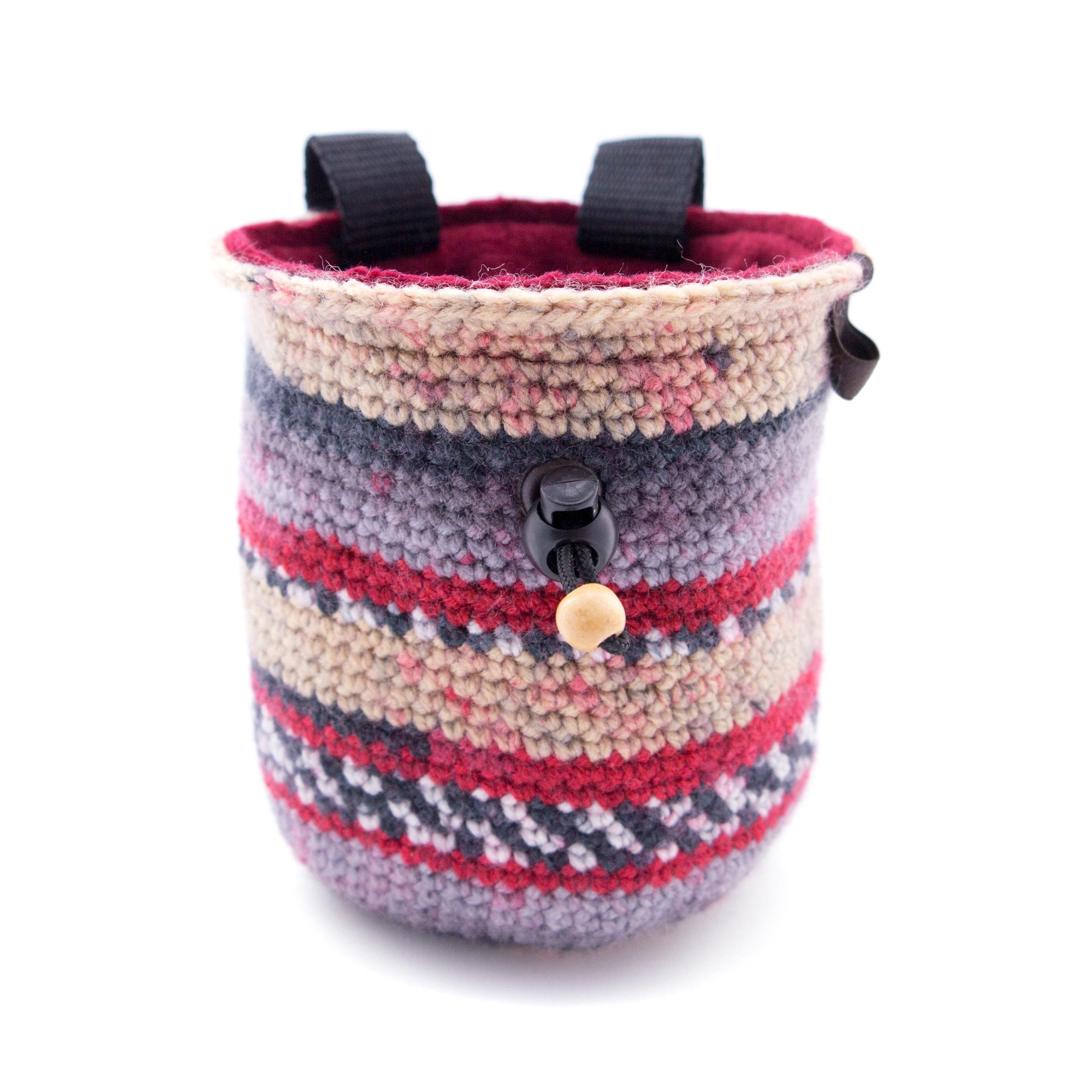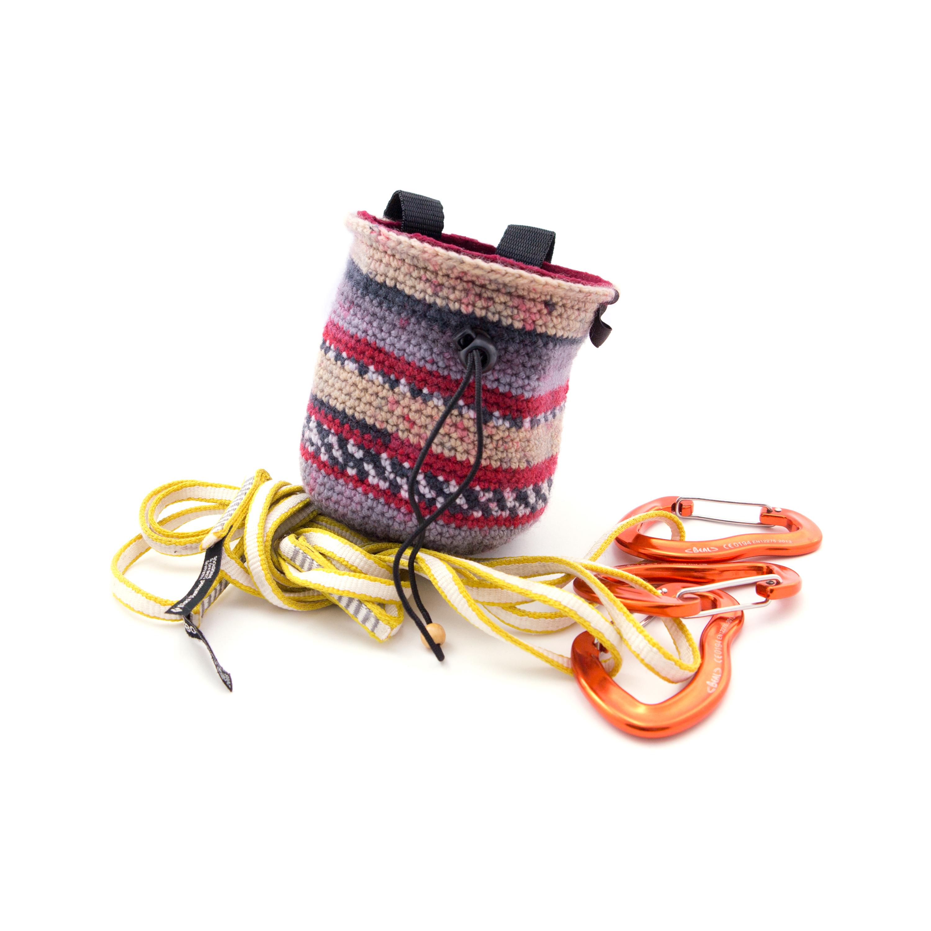 This handmade Chalk Bag is the Indoor Rock Climbing Gear that any climber, beginner or advanced will love. It is best for using when you are bouldering, wall climbing, trad climb or climbinggym. The bag is one of the accessories, part of rock climbing equipment, that any climber and boulderer needs. We created this chalk bag for girls or men, the size is large enough to be comfortably used. We hand knitted this chalk bucket of durable polyester yarn. The main color theme is beige and grey. It is with wide opened upper rib. The bag is with elastic brush holder and 2 loops for attaching to the harness.