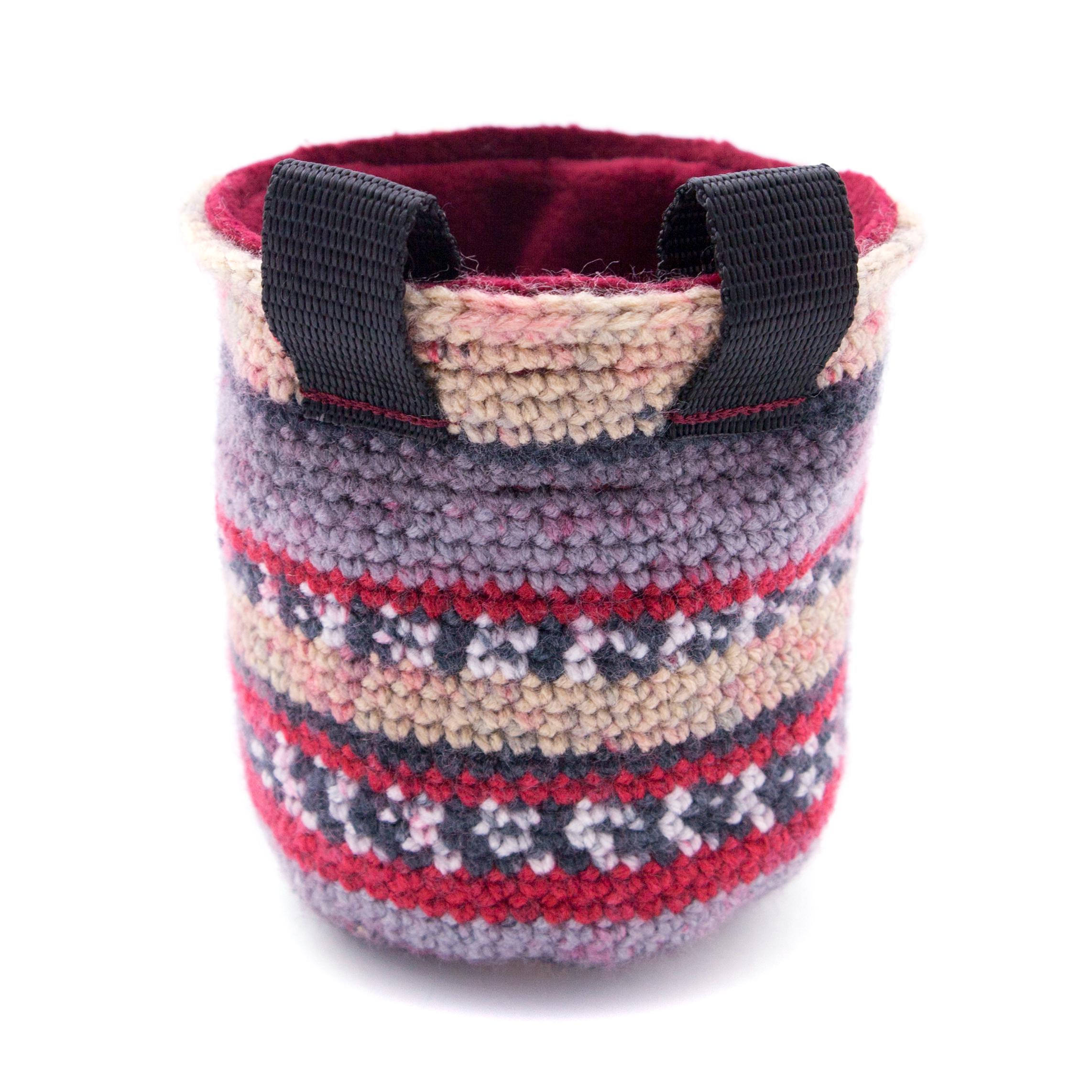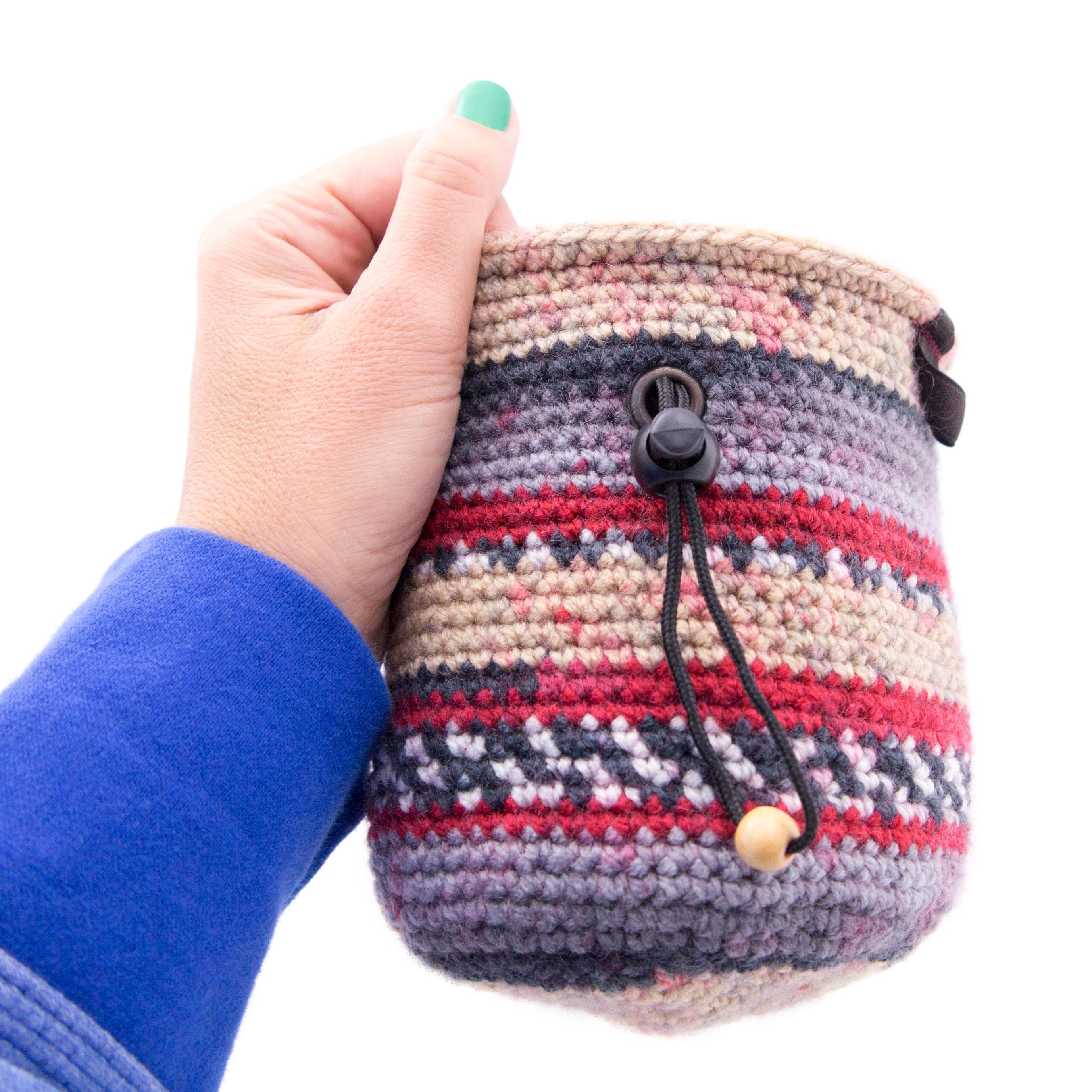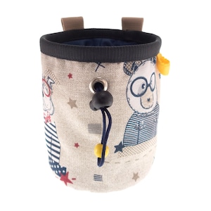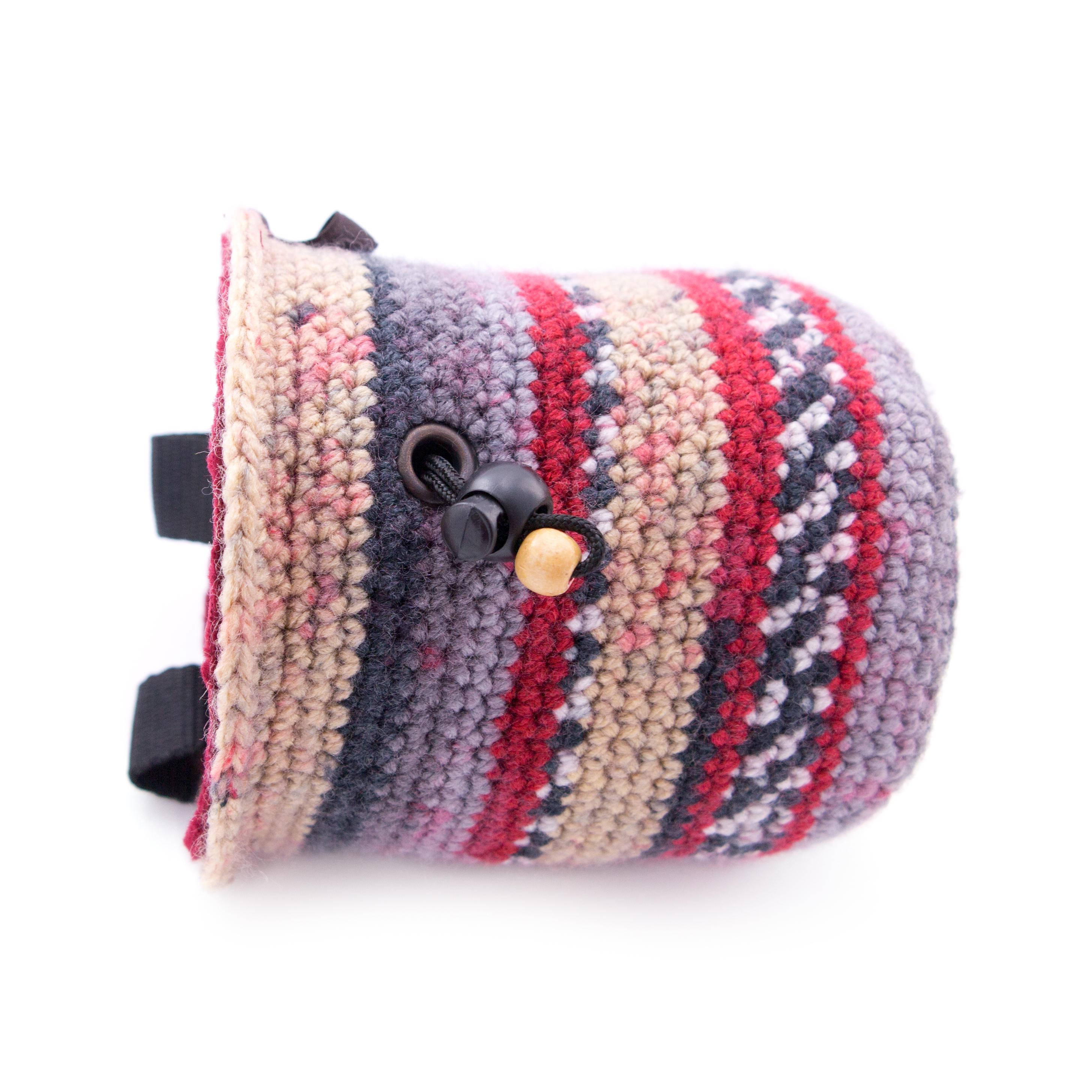 This handmade Chalk Bag is the Indoor Rock Climbing Gear that any climber, beginner or advanced will love. It is best for using when you are bouldering, wall climbing, trad climb or climbinggym. The bag is one of the accessories, part of rock climbing equipment, that any climber and boulderer needs. We created this chalk bag for girls or men, the size is large enough to be comfortably used. We hand knitted this chalk bucket of durable polyester yarn. The main color theme is beige and grey. It is with wide opened upper rib. The bag is with elastic brush holder and 2 loops for attaching to the harness.