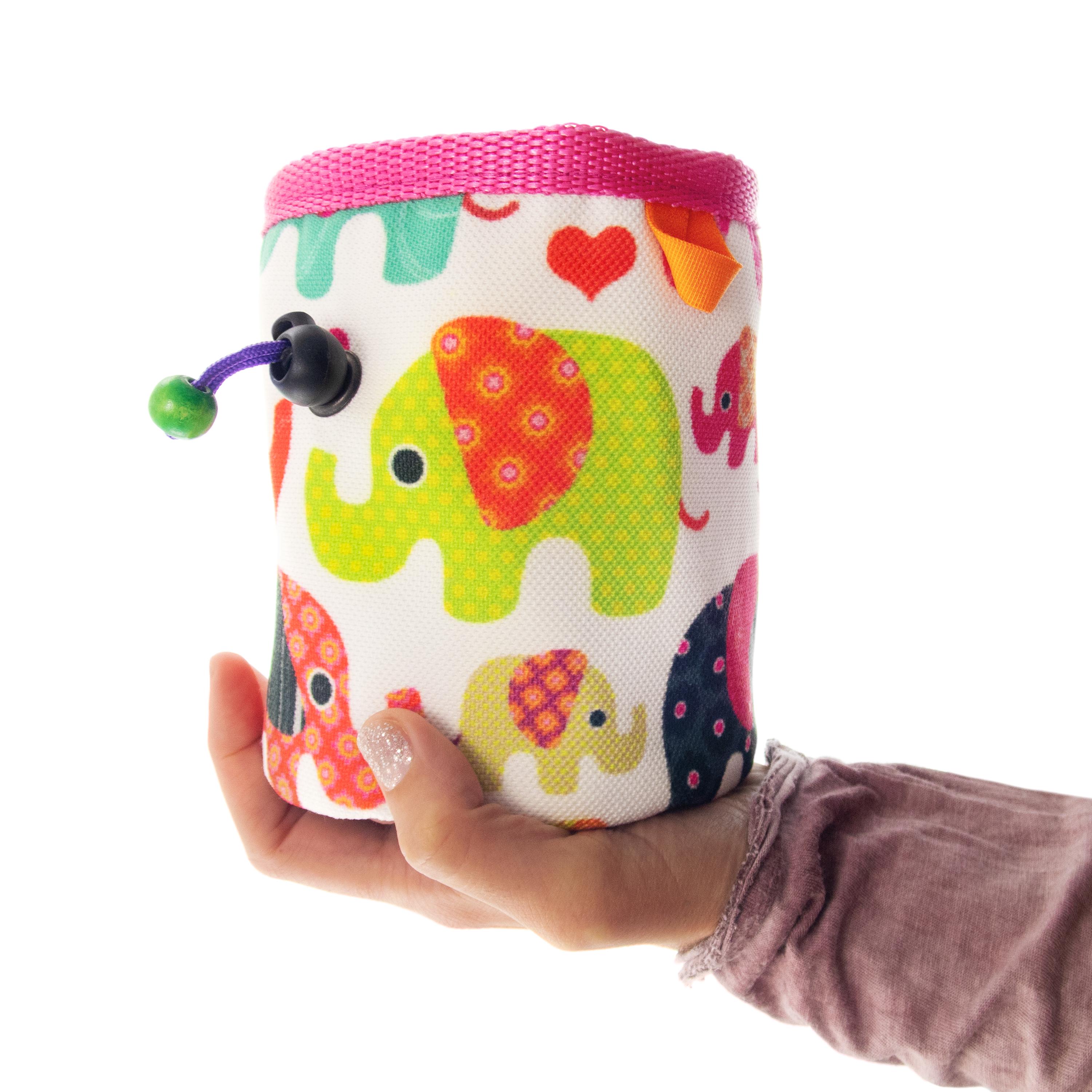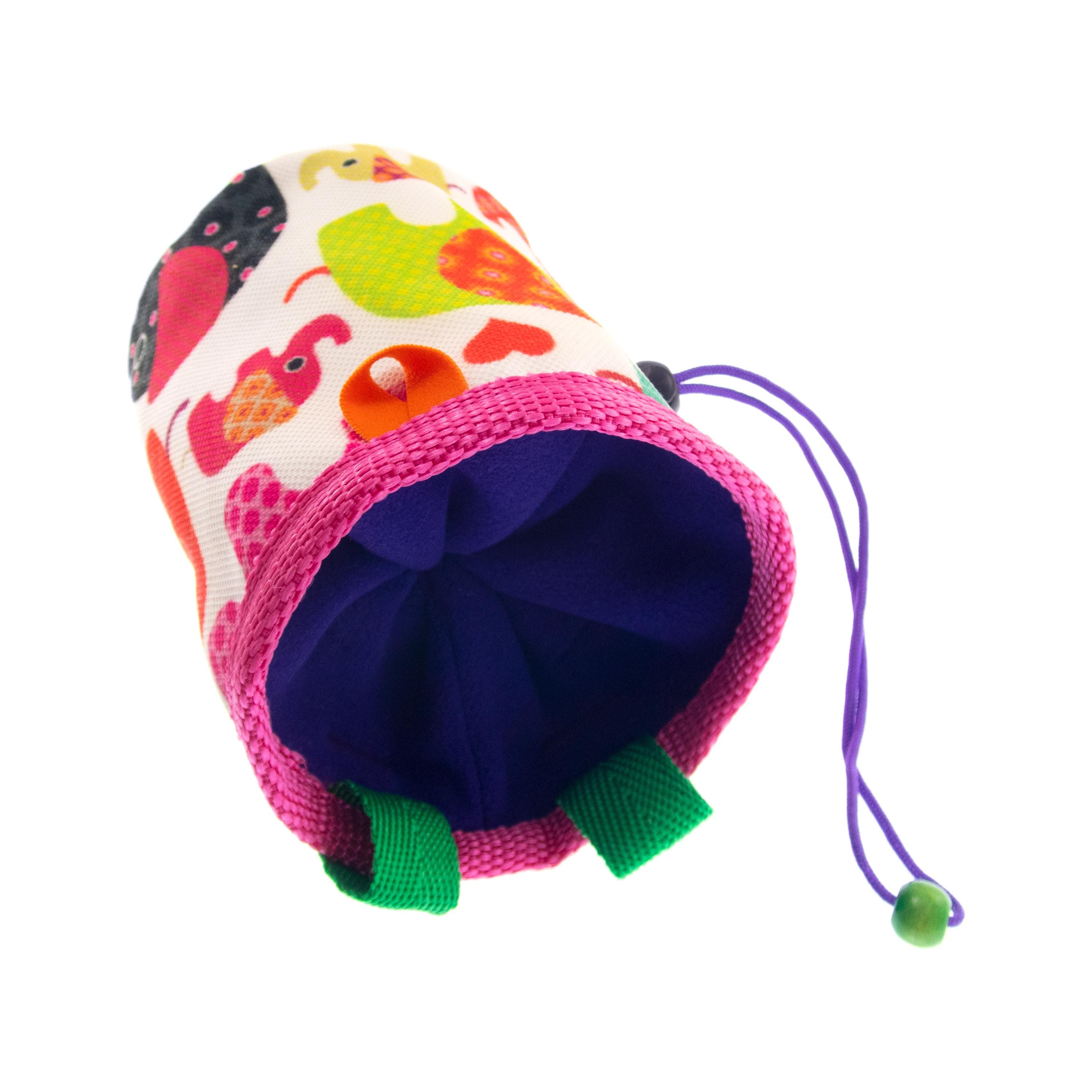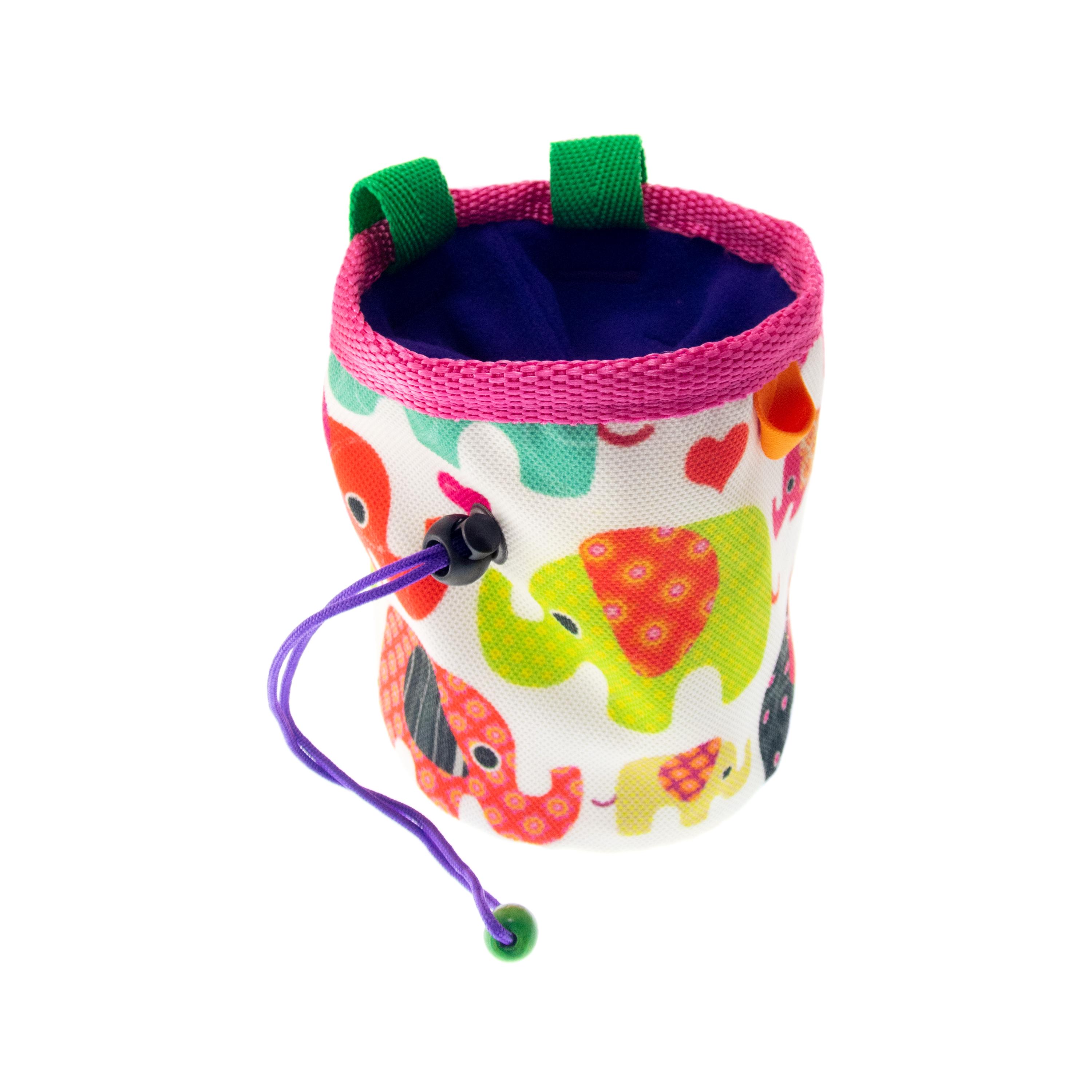 Cute Rock Climbing Chalk Bag, best for bouldering and climb gym. This chalk bucket is in the climbing accessories list for every rock climber. We handmade it of fabric with elephants. The main colors are pink, purple and green.