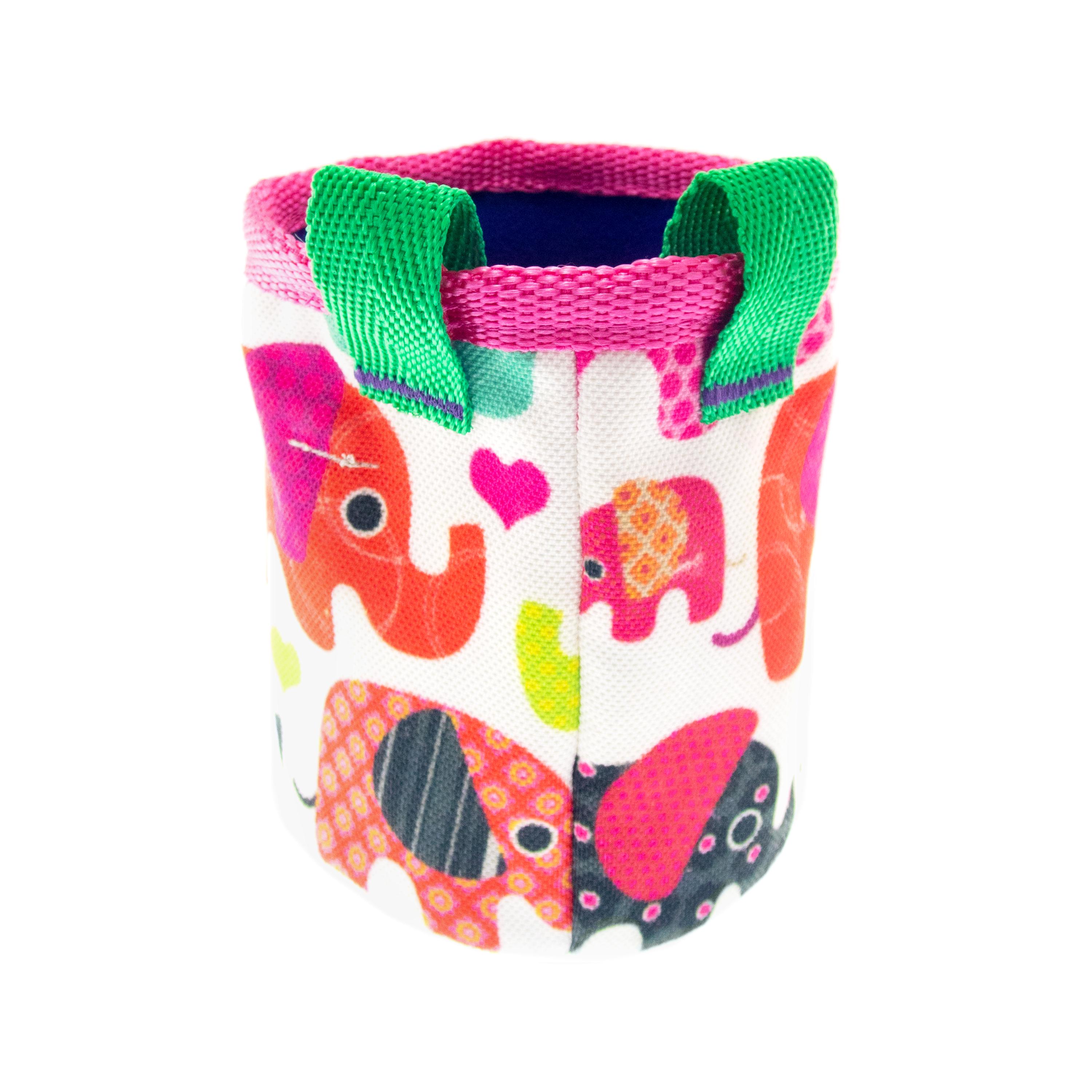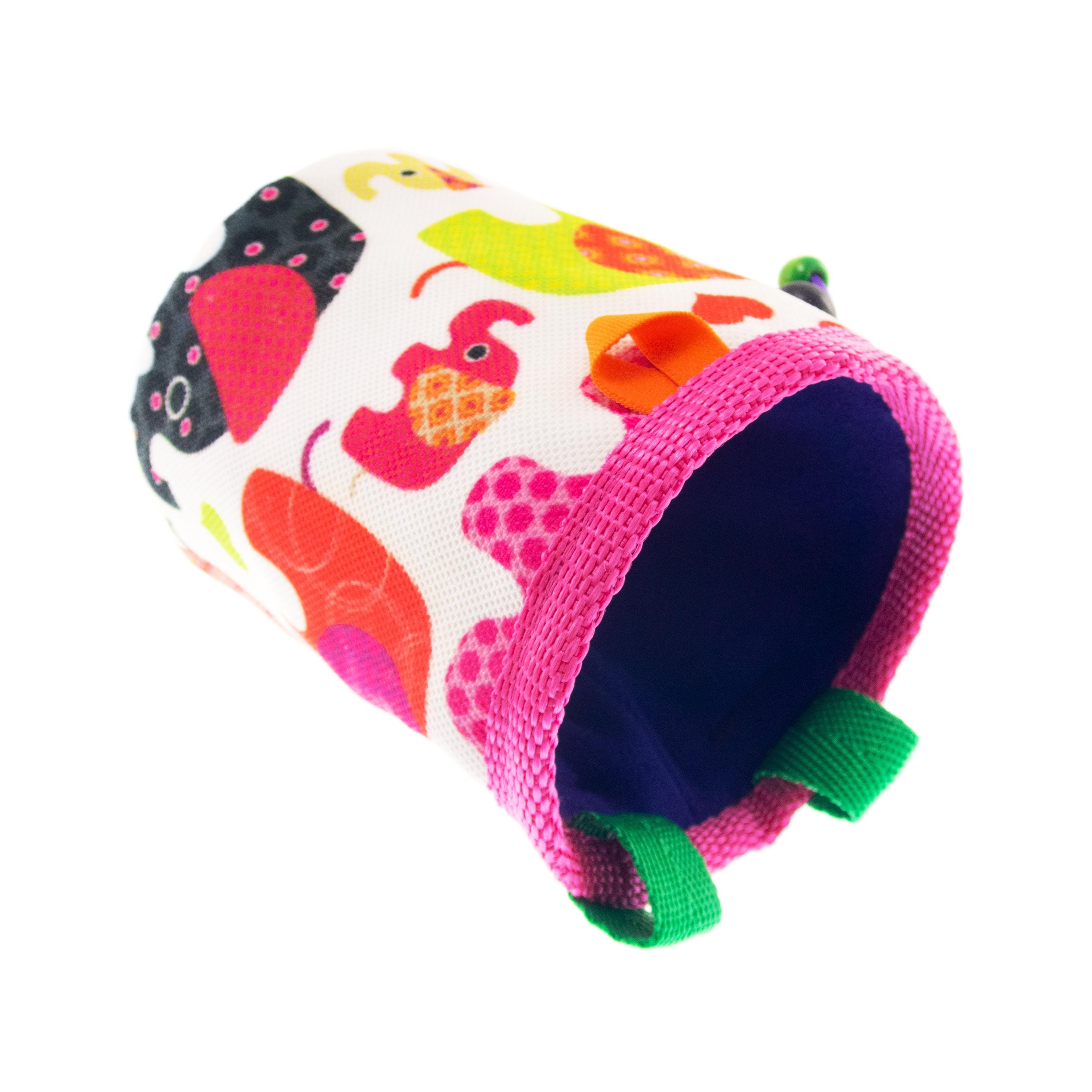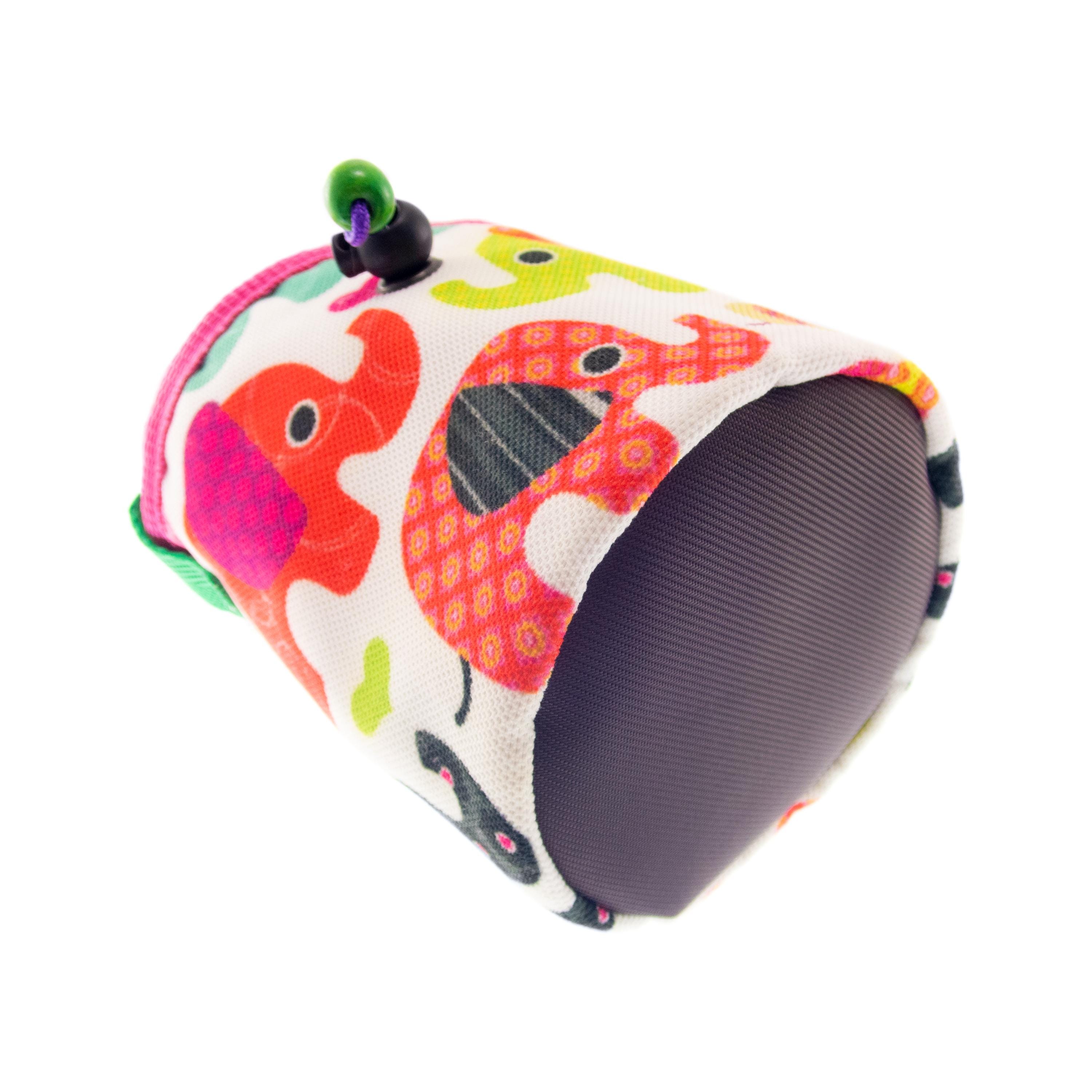 Cute Rock Climbing Chalk Bag, best for bouldering and climb gym. This chalk bucket is in the climbing accessories list for every rock climber. We handmade it of fabric with elephants. The main colors are pink, purple and green.