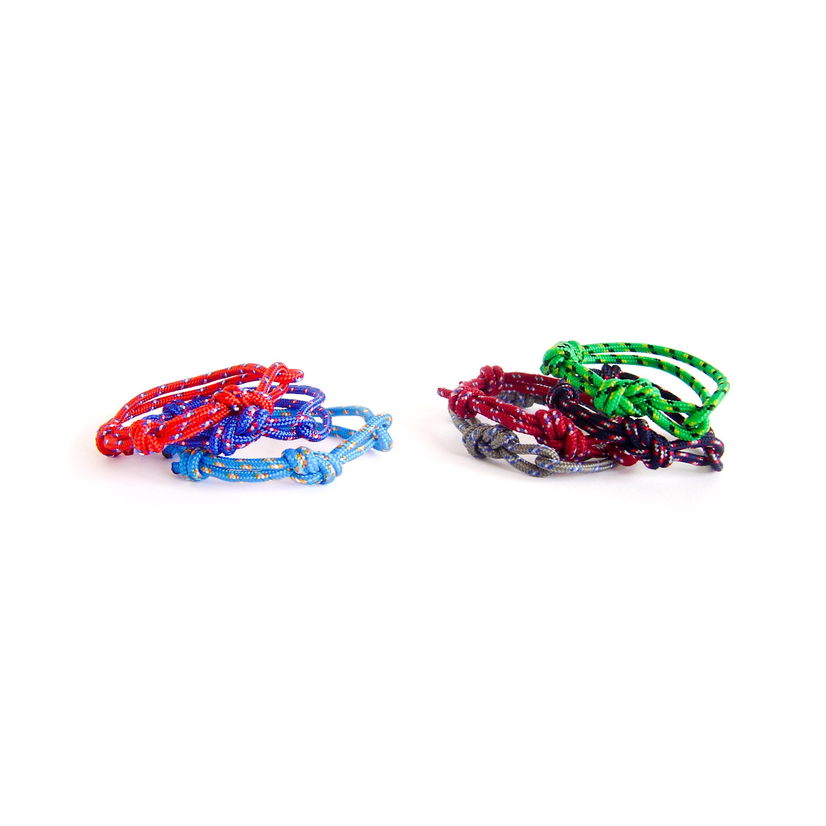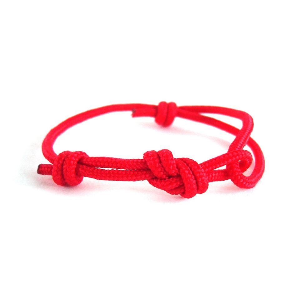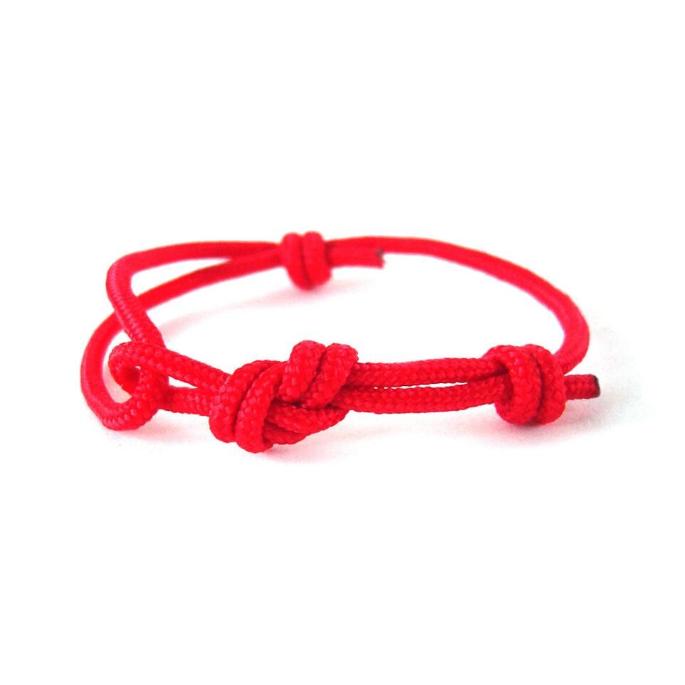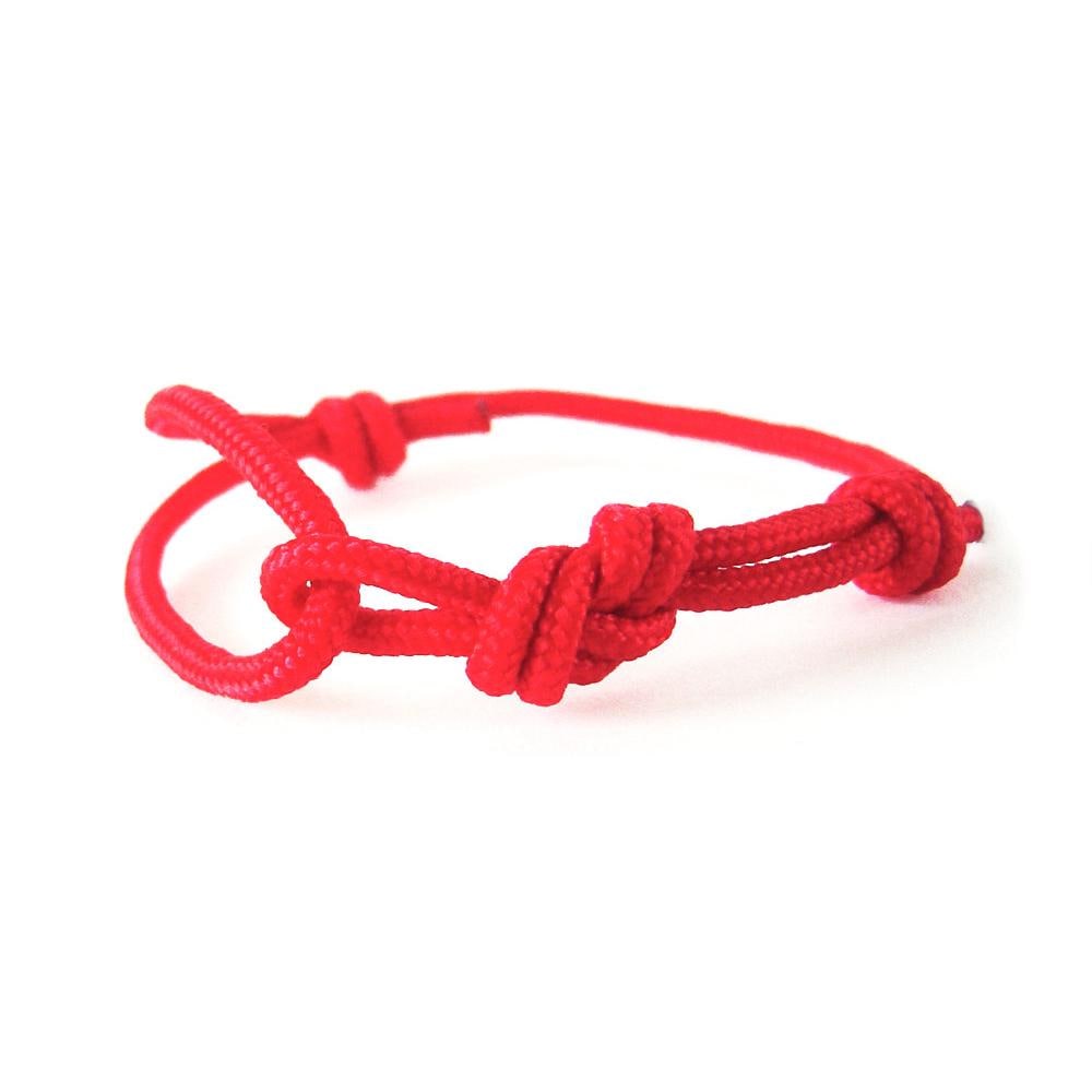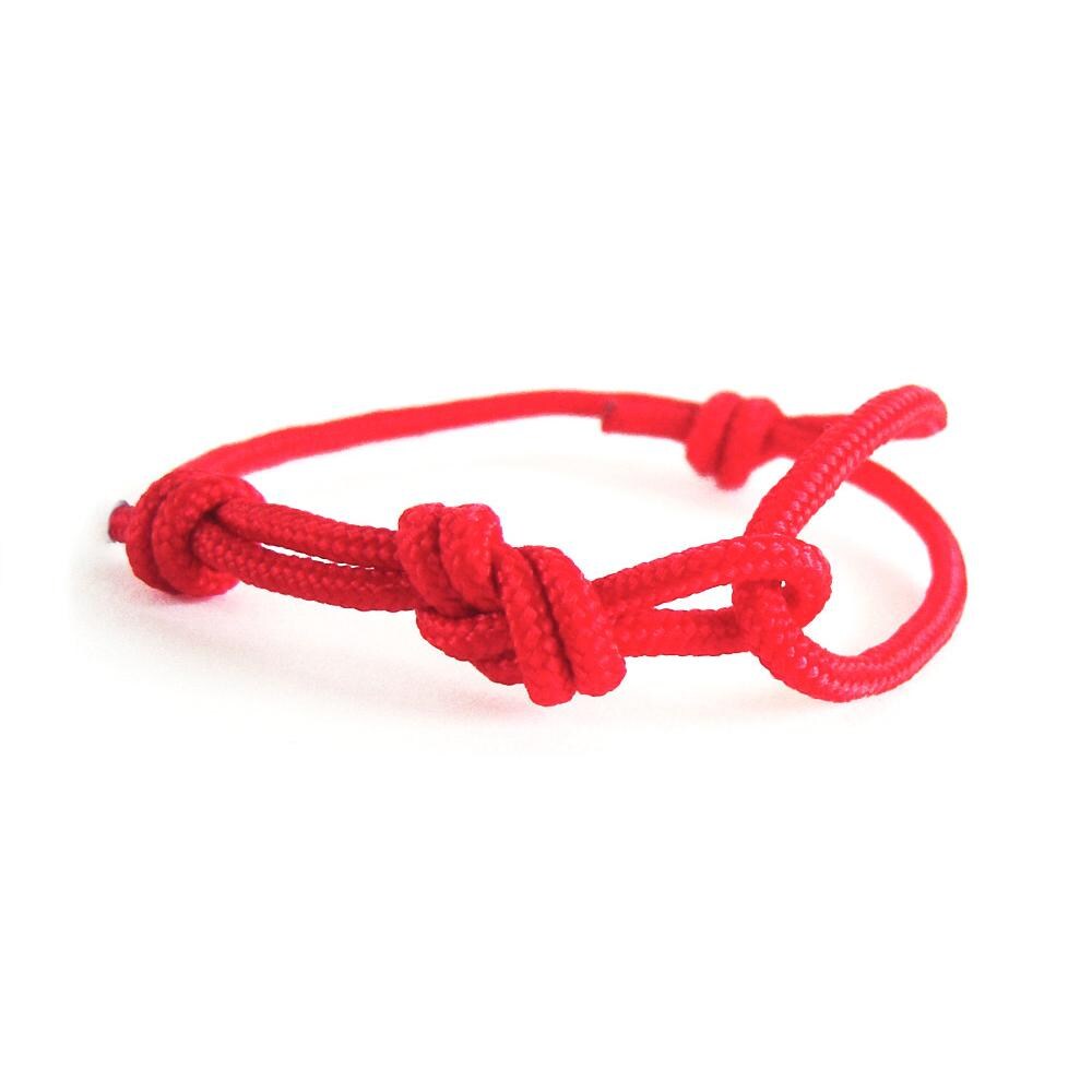 The red protection bracelet is knotted of one string paracord rope with diameter 3 mm (1/8"), and knotted with sailor and climbers figure eight knot.