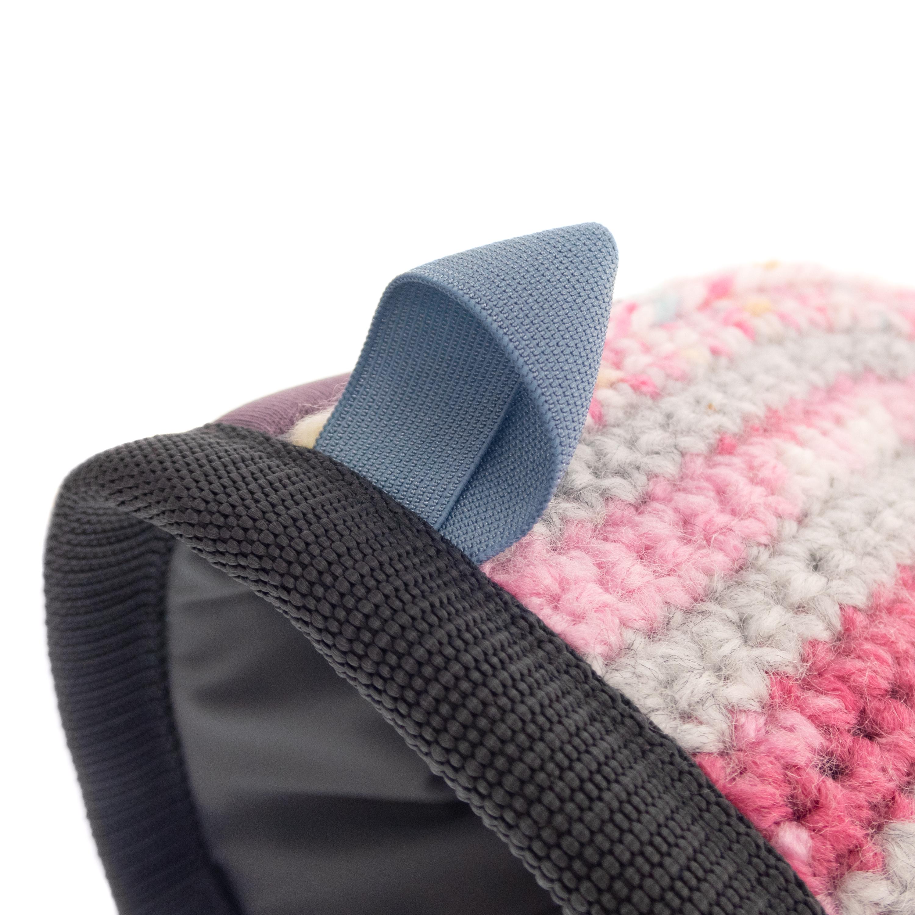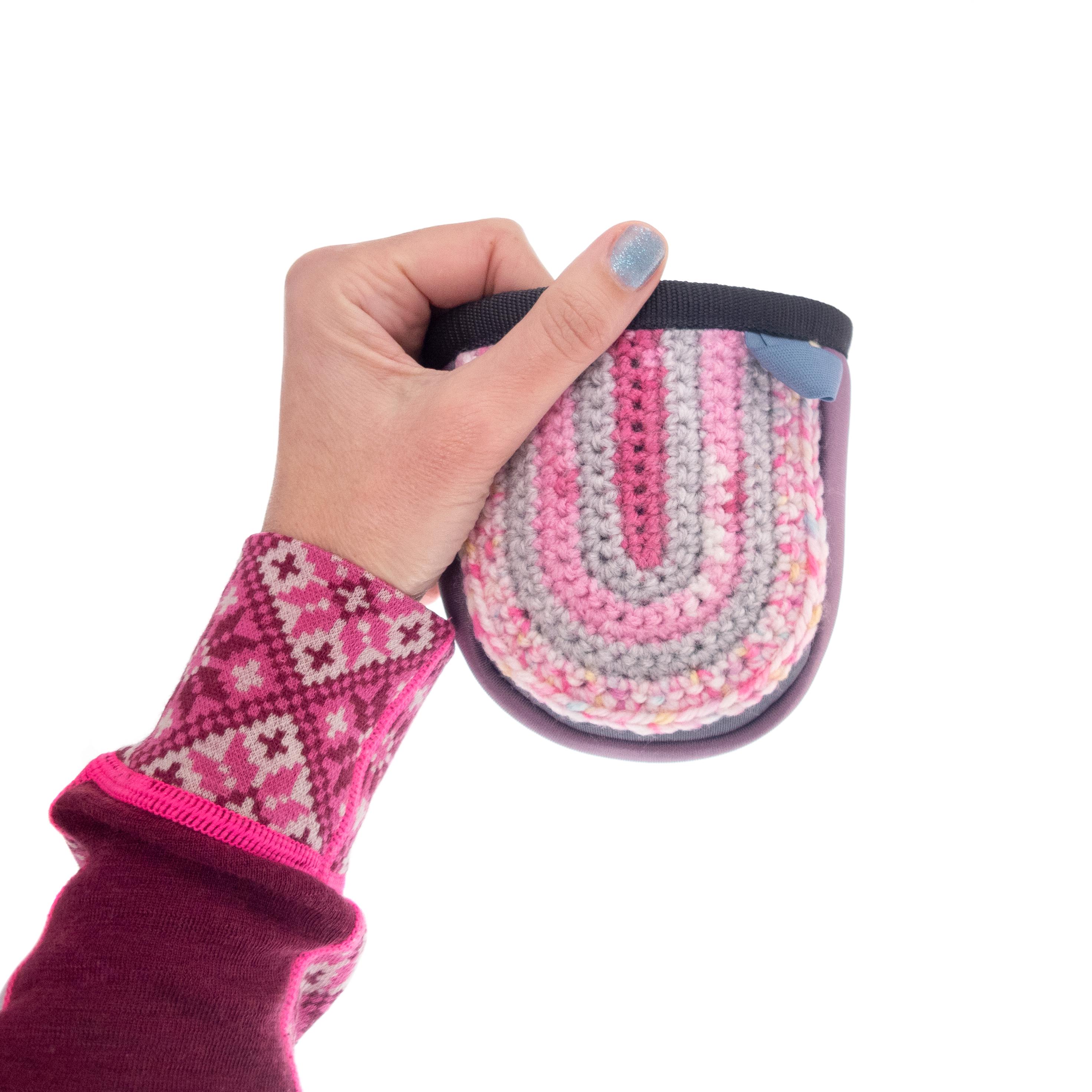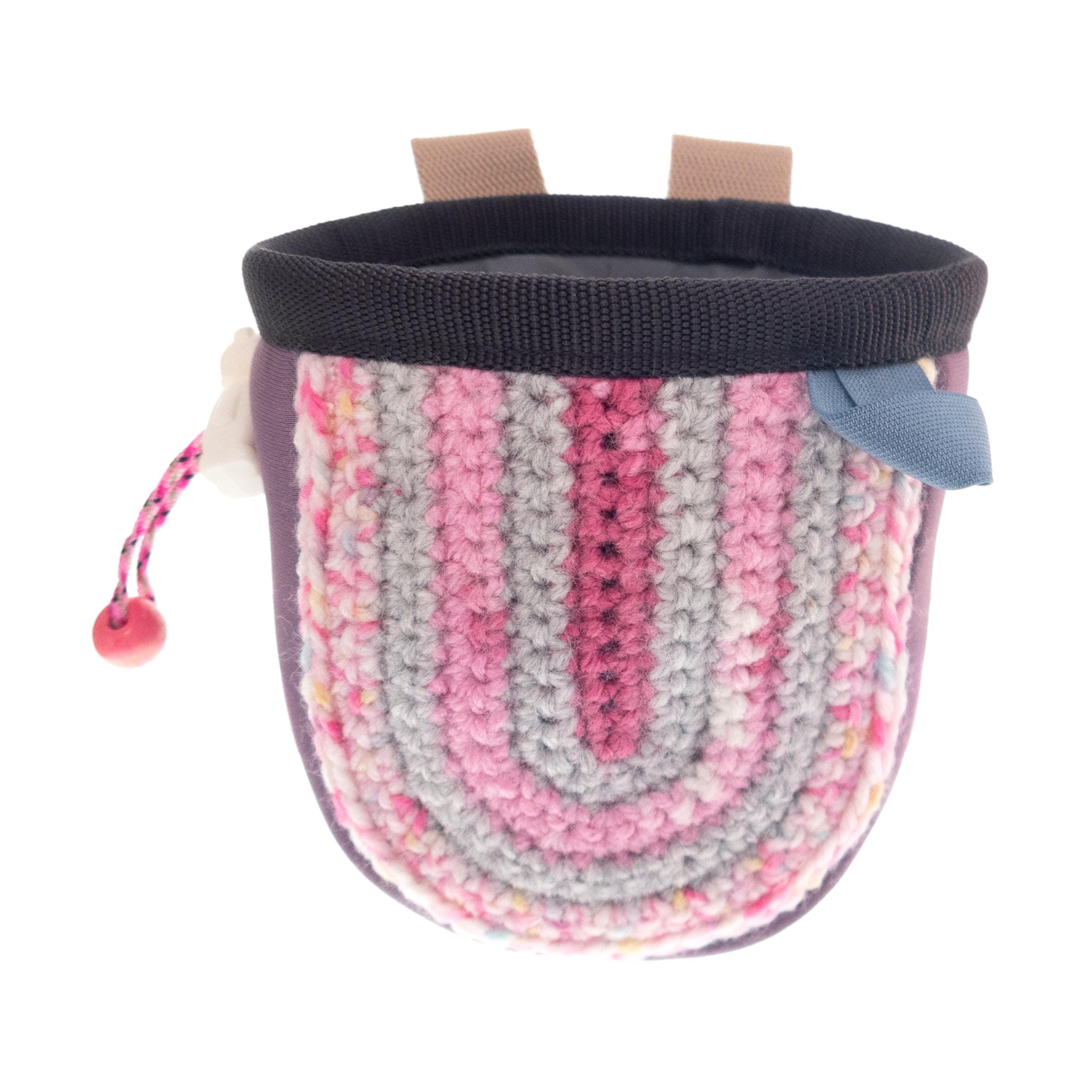 This is Kids Chalk Bag Cute for Little Girls. It is small pink rock climbing chalk bag, handmade of neoprene with hand knit front part. This mini chalk purse for bouldering children is good climbing kids gift idea. The little climbers will love having their own chalk purse, as adult climbers. Nadamlada designed this chalk bag with full functionality, it is with elastic brush holder and protected upper rib. Closes very well with grey elastane fabric. Only one available.