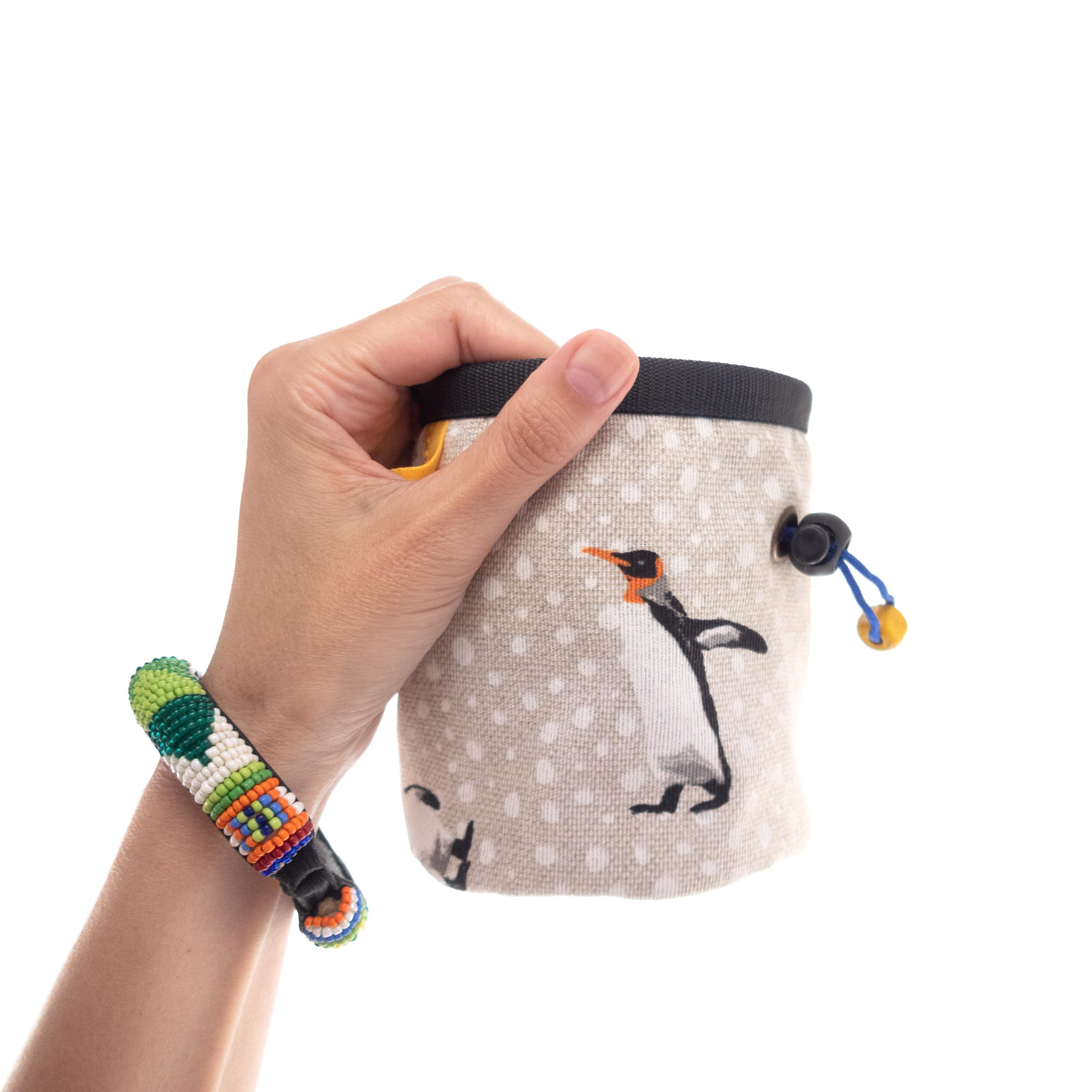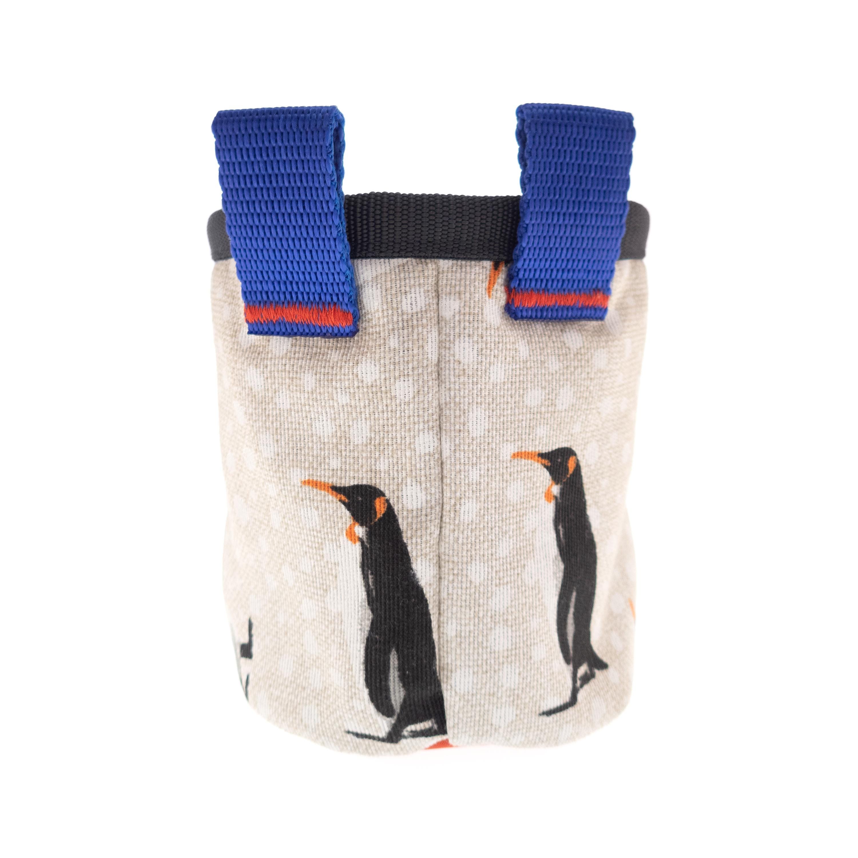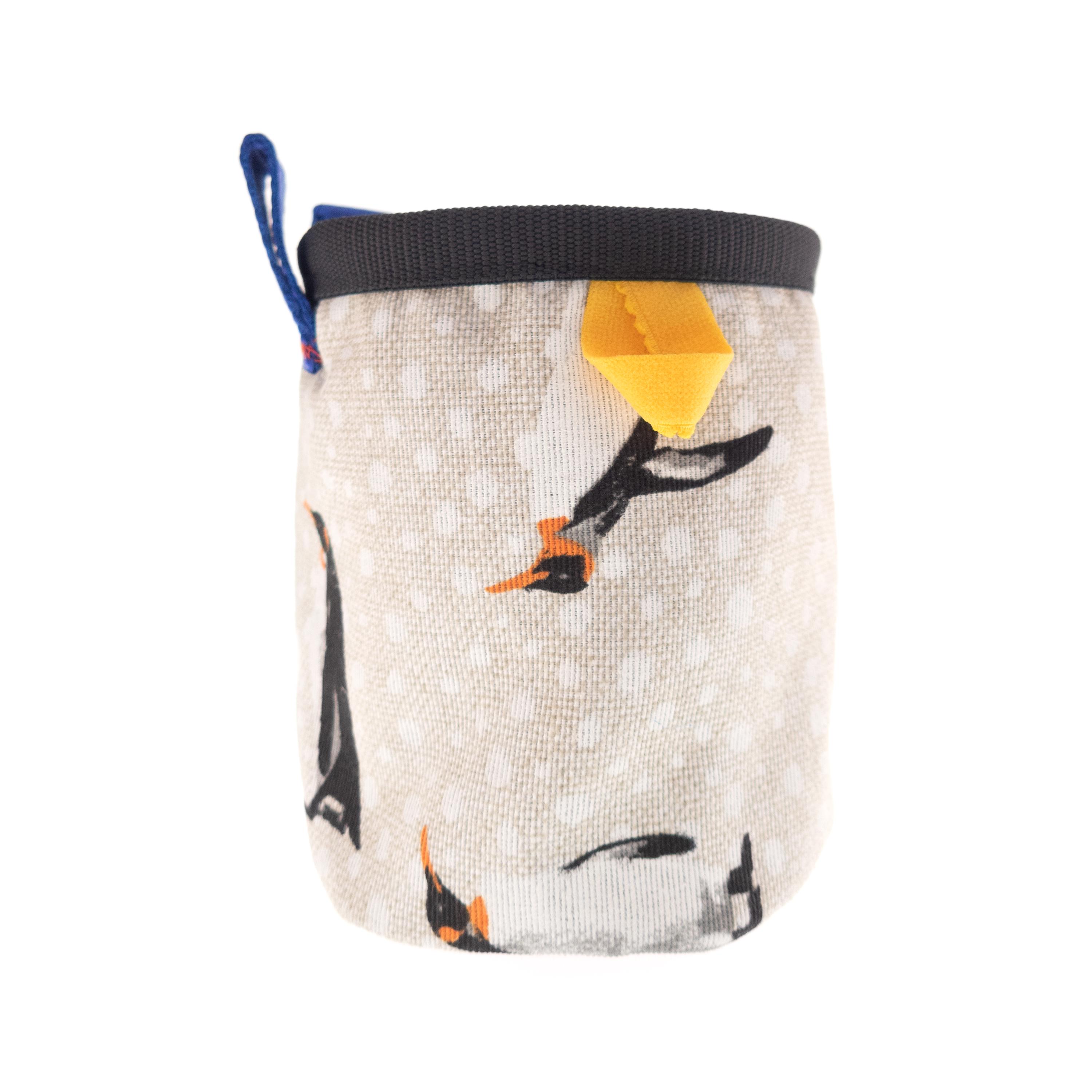 Rock Climbing Children's Chalk Bag for beginners, handmade by Nadamlada. We designed it for the little climbers, who have interests in alpine, indoor of vertical climb and bouldering. This kids chalkbag is smaller in size that the chalk bags for adults, but have all functions, that the others have. It is with elastic brush holder, durable bottom, and closes very well. The pattern of the fabric is with penguins. It is stylish, cool and every kid will like it.