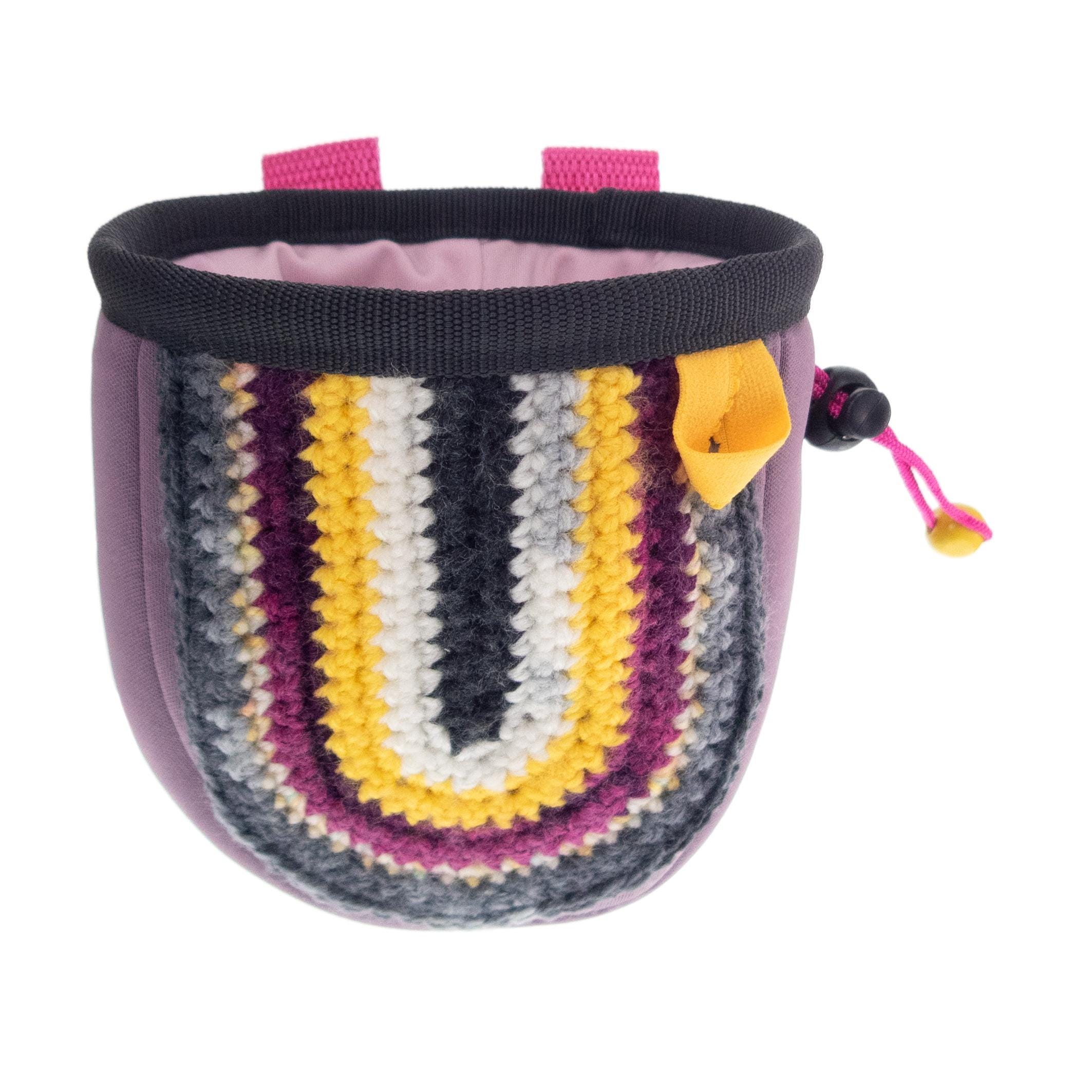 Handcrafted by Nadamlada Climbing Gym Bag for Ladies. It is handmade large chalk bag for rock climbing, indoor and outdoor climbing. This wall climb equipment was created to become your favorite rock climb gear. We designed this chalk bag of pink neoprene. The front is hand knit of yarn. It is in stripes pattern. The climbing gym bag closes very well with thin elastane fabric, drawstring and a stopper buckle. It is with elastic brush holder, and two loops for attaching to a webbing strap or on your harness. Can be purchased with or without belt. One of a kind, and only one available. The details are: