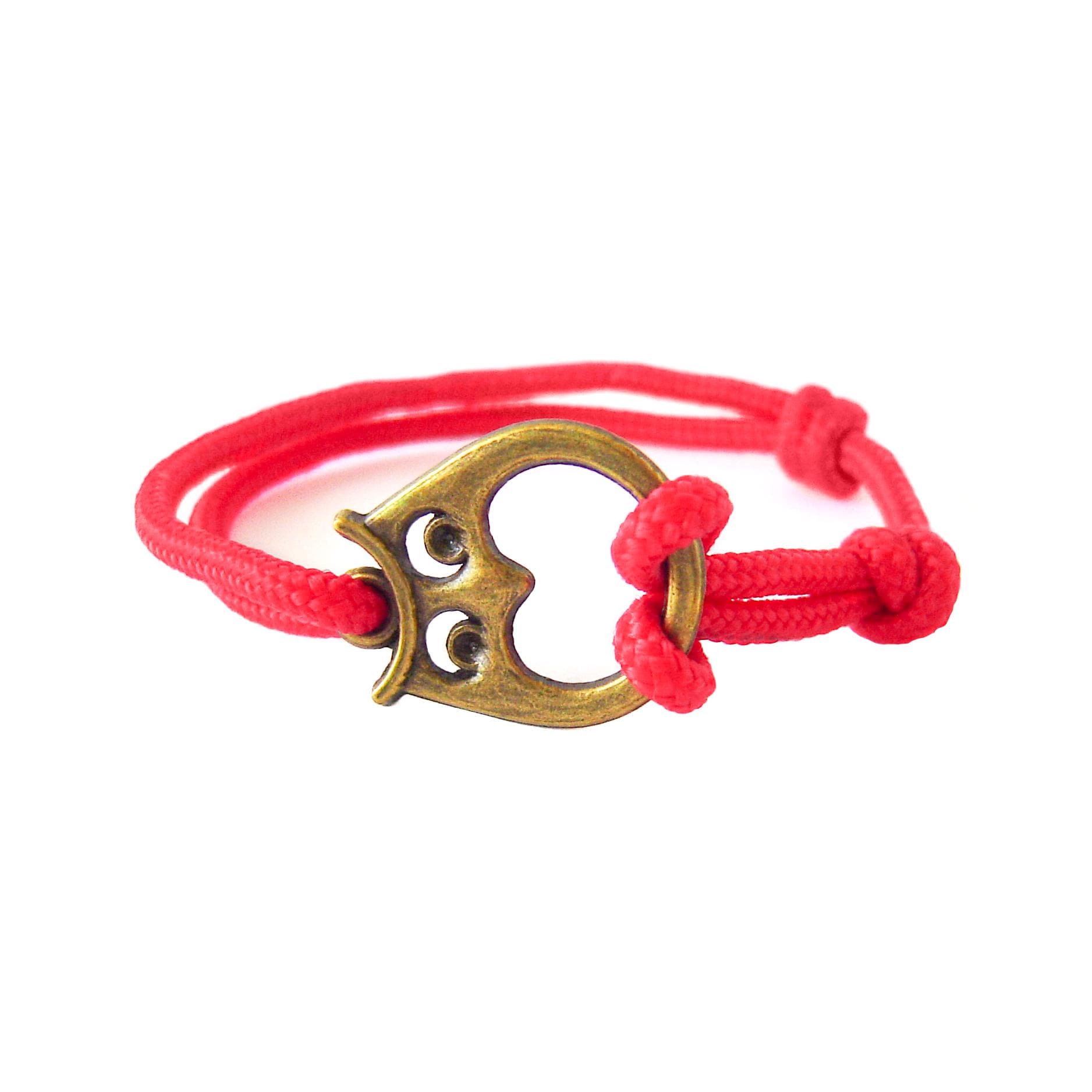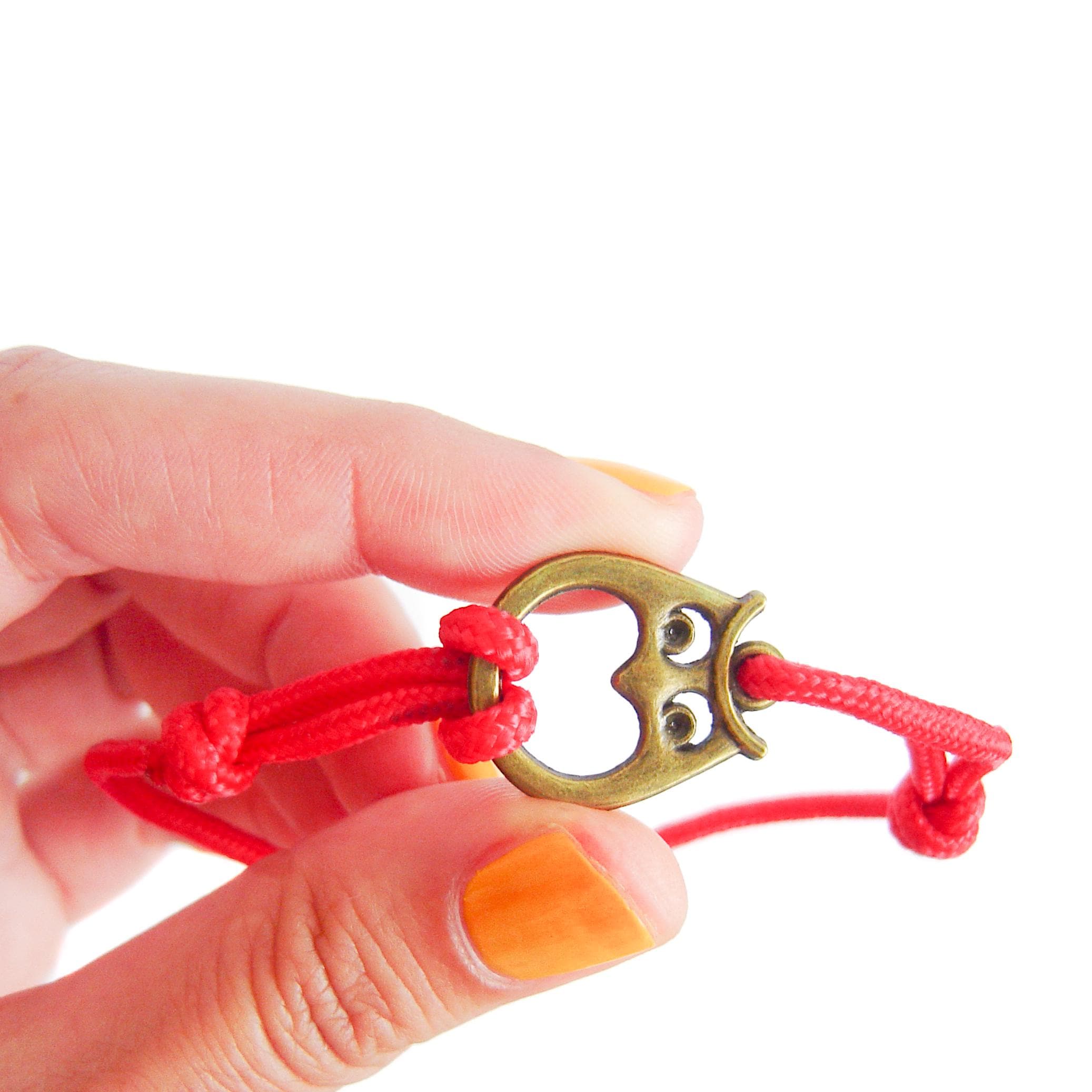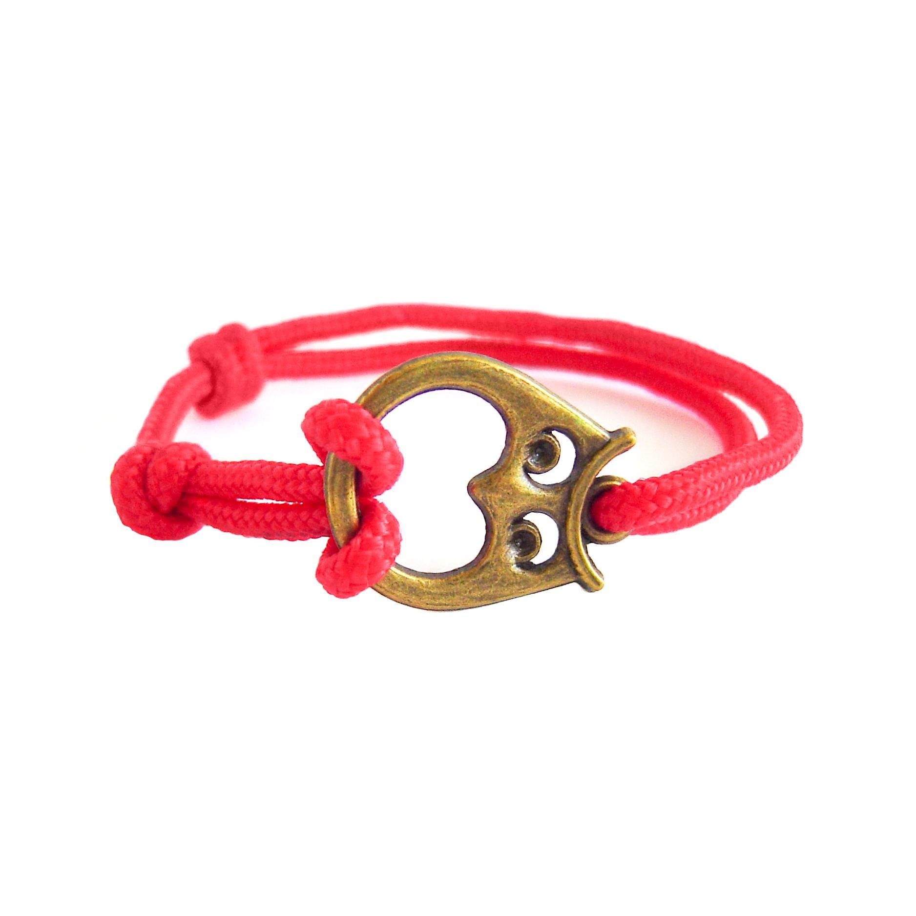 Red men's bracelet. We knotted this survival bracelet of a one strand paracord 275 cord. Unique in our nautical bracelet collection, we handmade it with nice owl charm. It suits nice to everyone: a camping lover, rock climber, men or women. It will fits even to child, because you can adjust its diameter from 27 cm (10 5/8") to 16 cm (6 5/16"). The diameter of paracord drawstring is app. 2-3 mm (1/8").