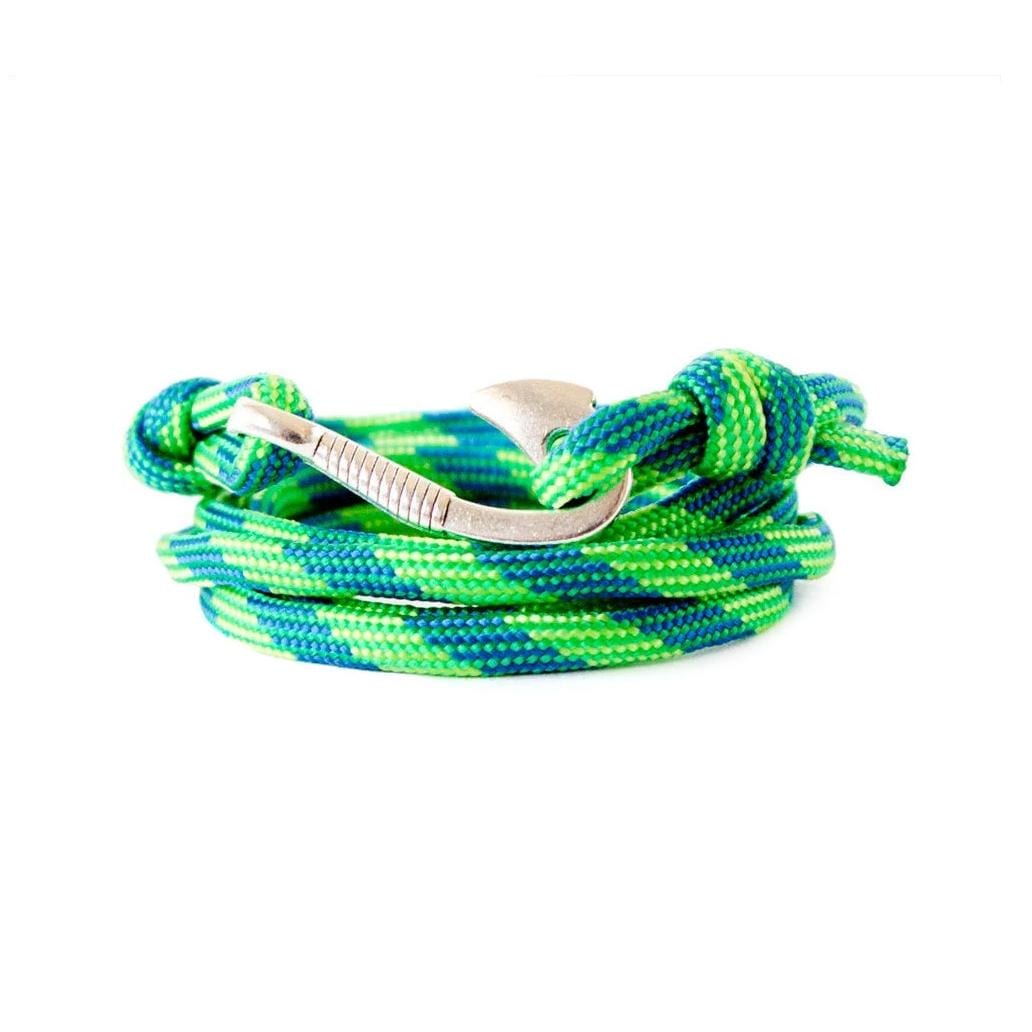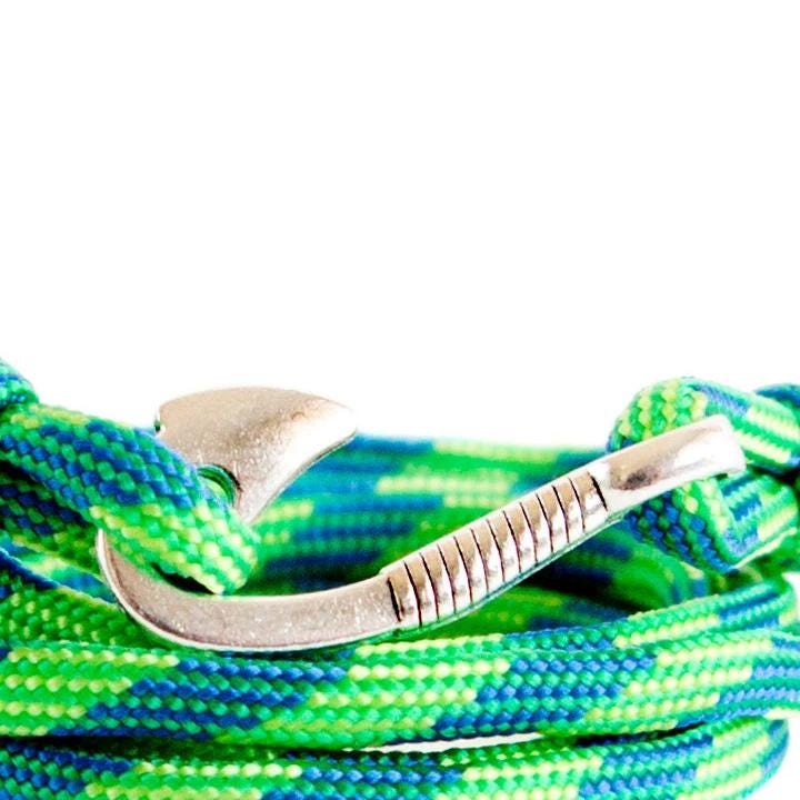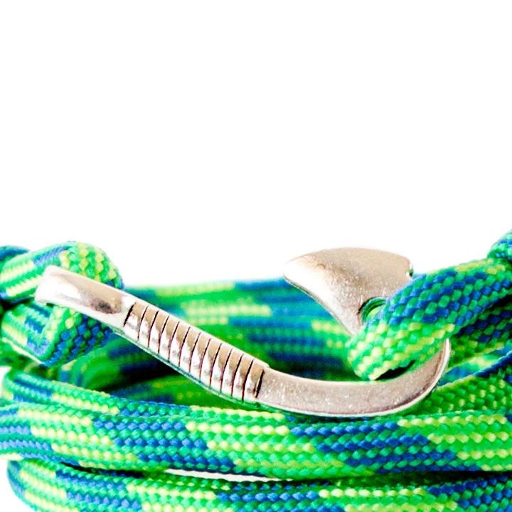 We knotted it of 550 paracord in green colors - lime green and dark green. For the closure we used a metal, detailed fish hook in silver color.