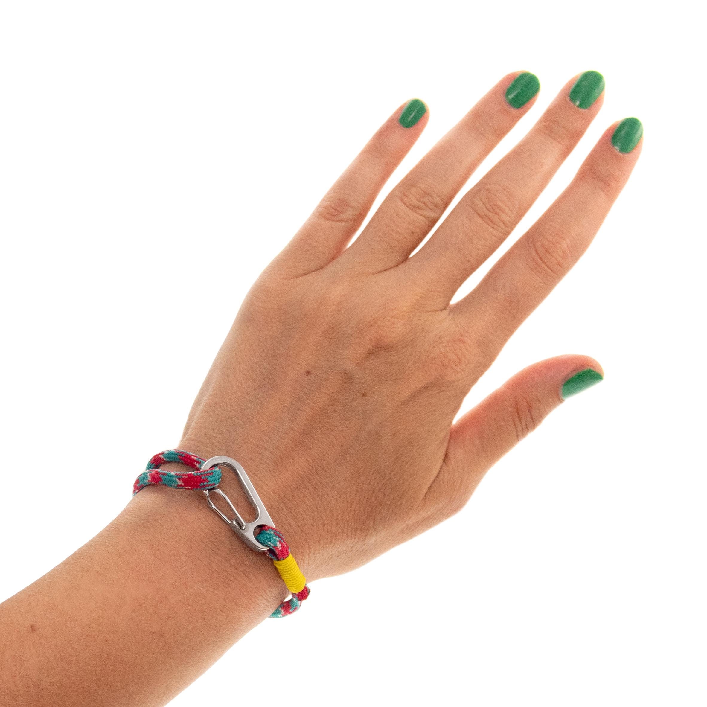 This is handmade Rock Climbing Rope Bracelet with Clasp, handmade by Nadamlada of survival paracord rope, adjustment slide knot and a clasp. Unique in rock climbing jewelry, the clasp shape of this bracelet is as mini carabiner. You can easily take the bracelet on and off when you push one of its sides. It is not just mens bracelet, but it is unisex, because this rope jewelry is adjustable in size. All girls or guys will love it. It can be customized, and you can choose the clasp color and the rope color. Use this hiking bracelet as a gift for any rock climber, survival enthusiast, surfer or traveller. Comfortable, lightweight and stylish.