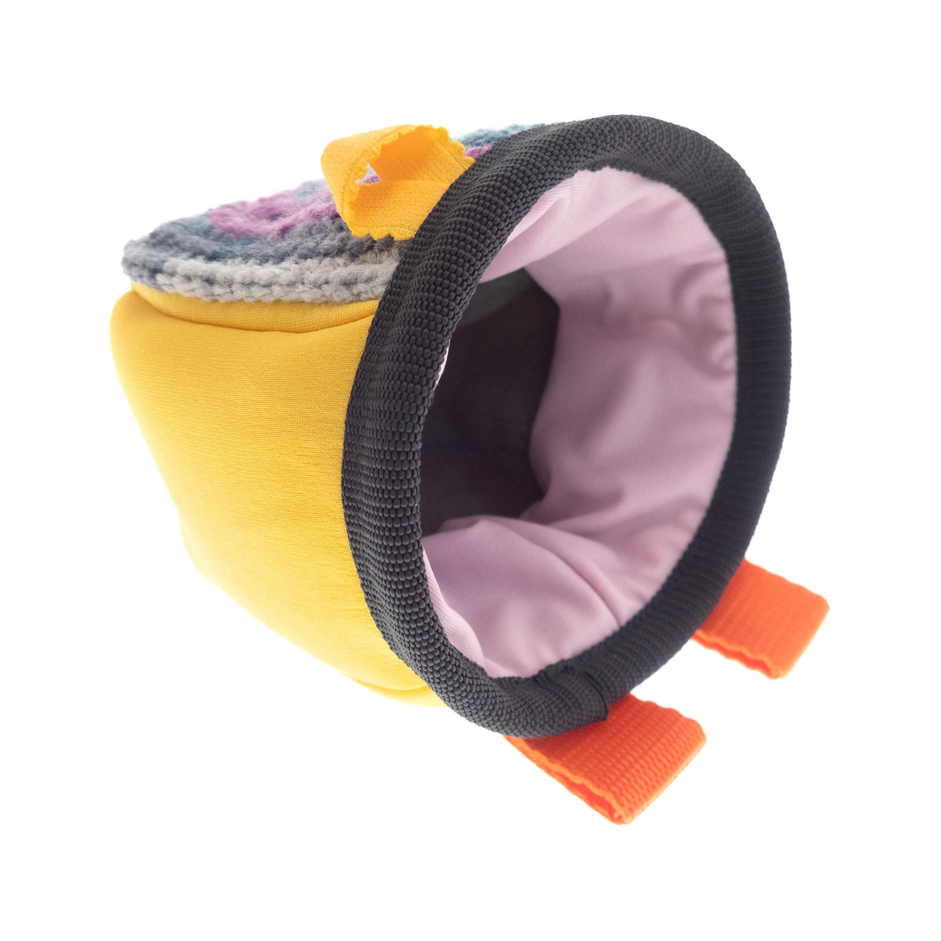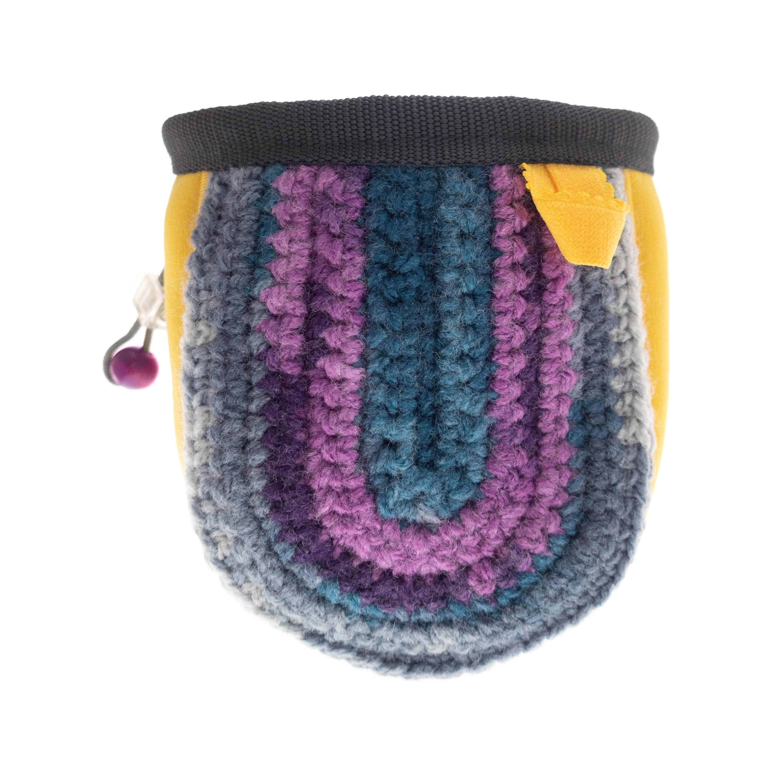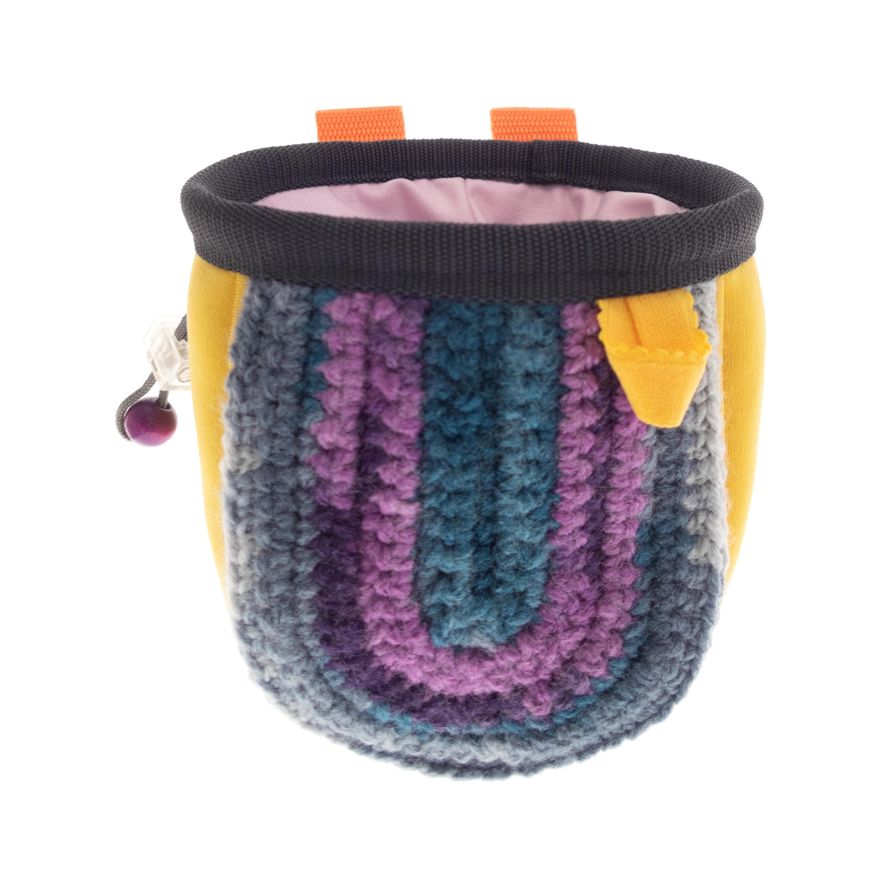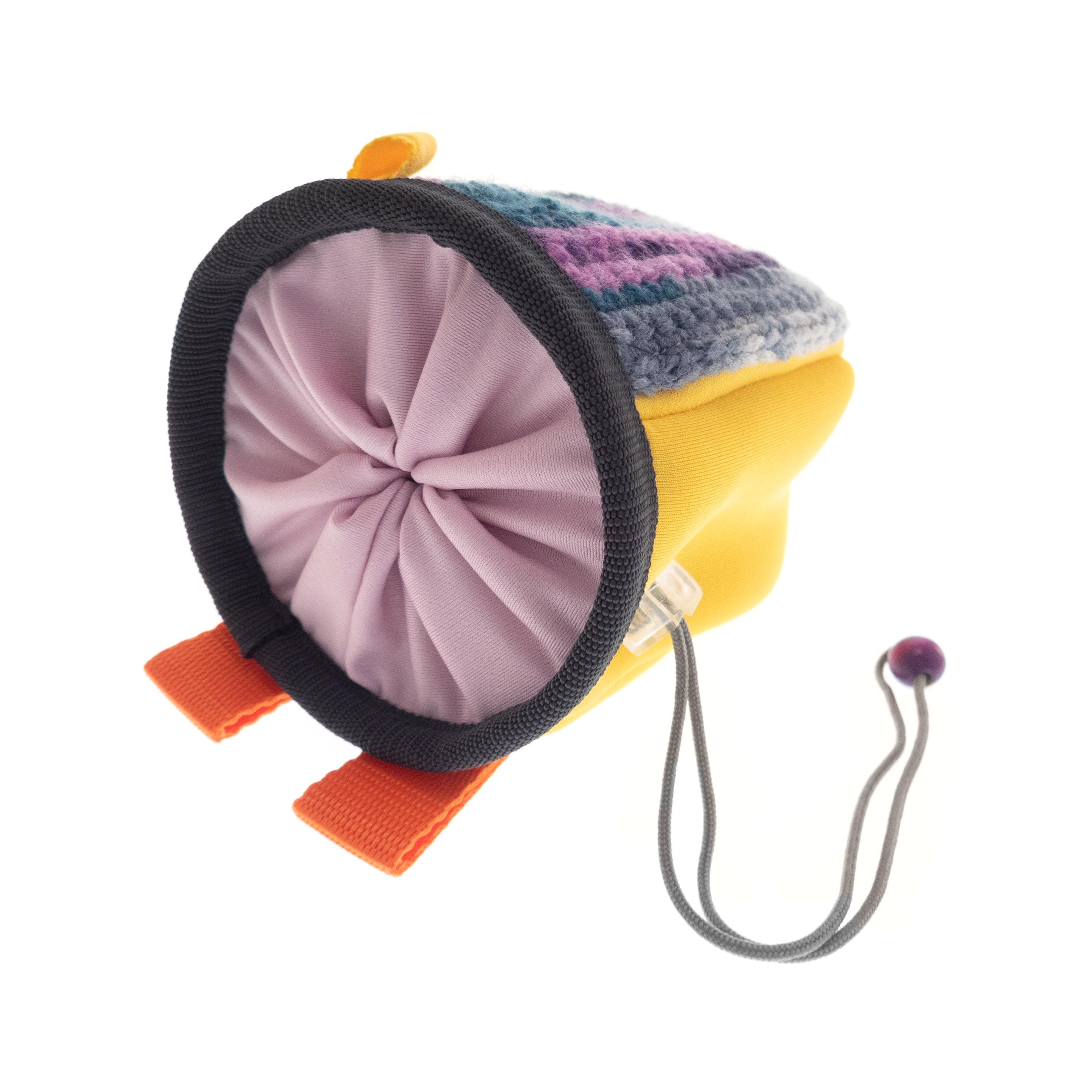 Kids Climbing Chalk Bag for climb gym or rock climbing walls. We handmade it as an equipment for junior girls or boys. This bag can be attached to harness or worn with the webbing belt when the little ones are bouldering or climbing too. The size of the chalk bag is smaller than the chalk pouches for the adults, but it is with the same functionality. We handmade sew it of neoprene fabric and knitted its front part of yarn. Make your kid happy, having one of a kind climbing accessory.