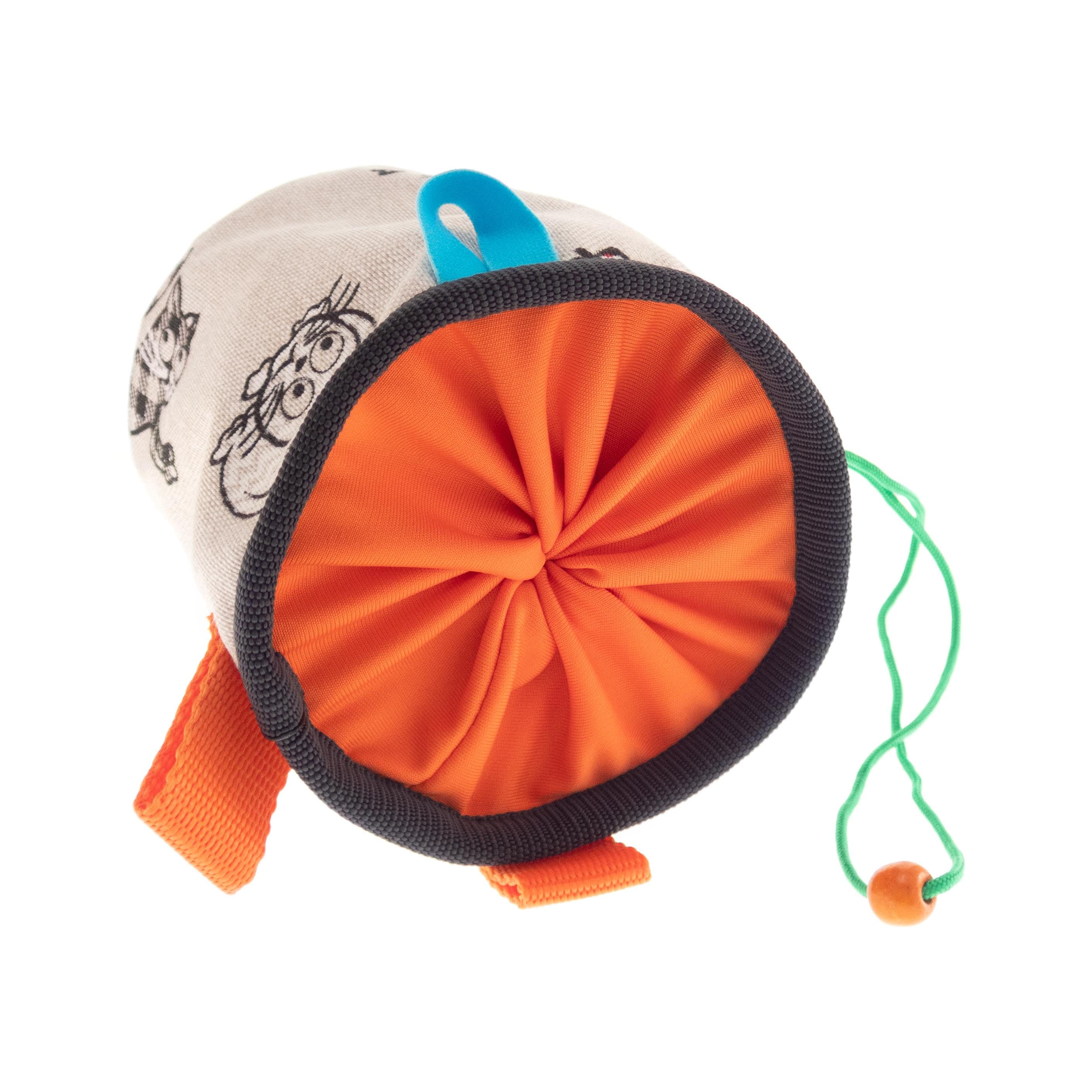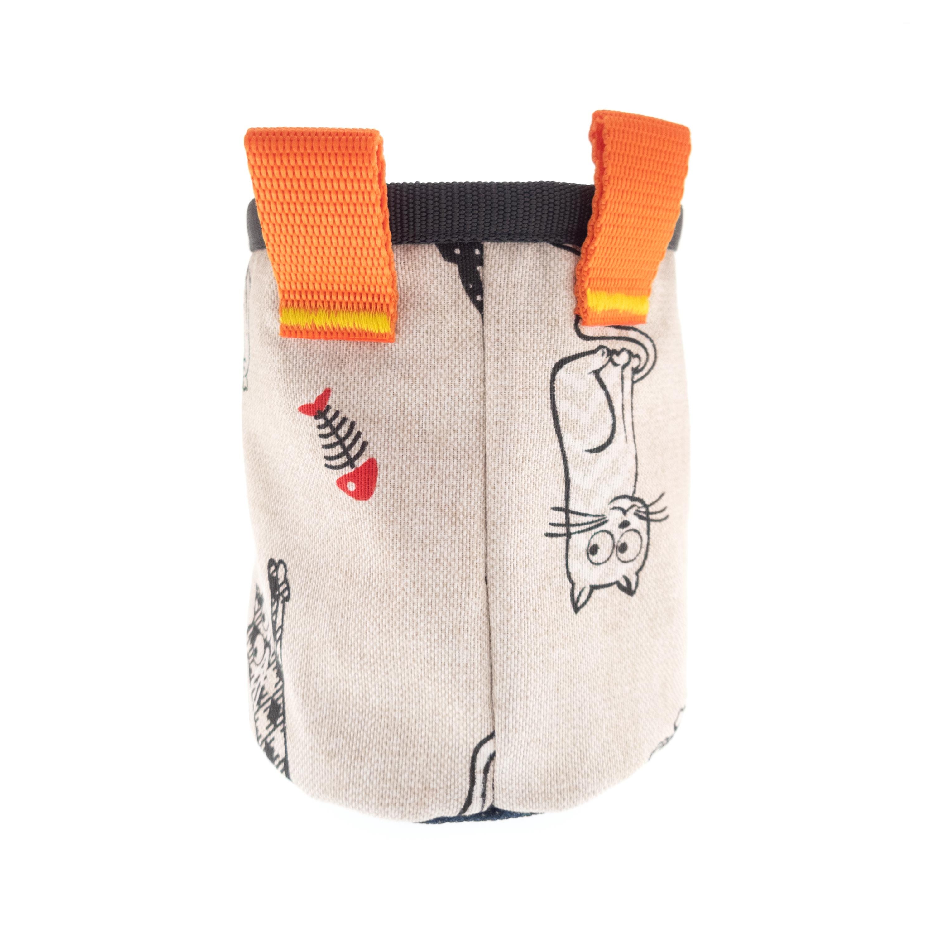 This is Gym Chalk Bag to Climbing Harness. We designed it for rock climbing gym and bouldering. The chalk bucket fits mens and ladies hands, also youths. We handmade it of fabric with cats. The main color theme of the bag are beige and black. The gym chalk bag is with two loops for hanging it to the waist belt or harness. With elastic brush holder too. One of a kind, handmade for climbers from climbers. For outdoor and indoor climb.