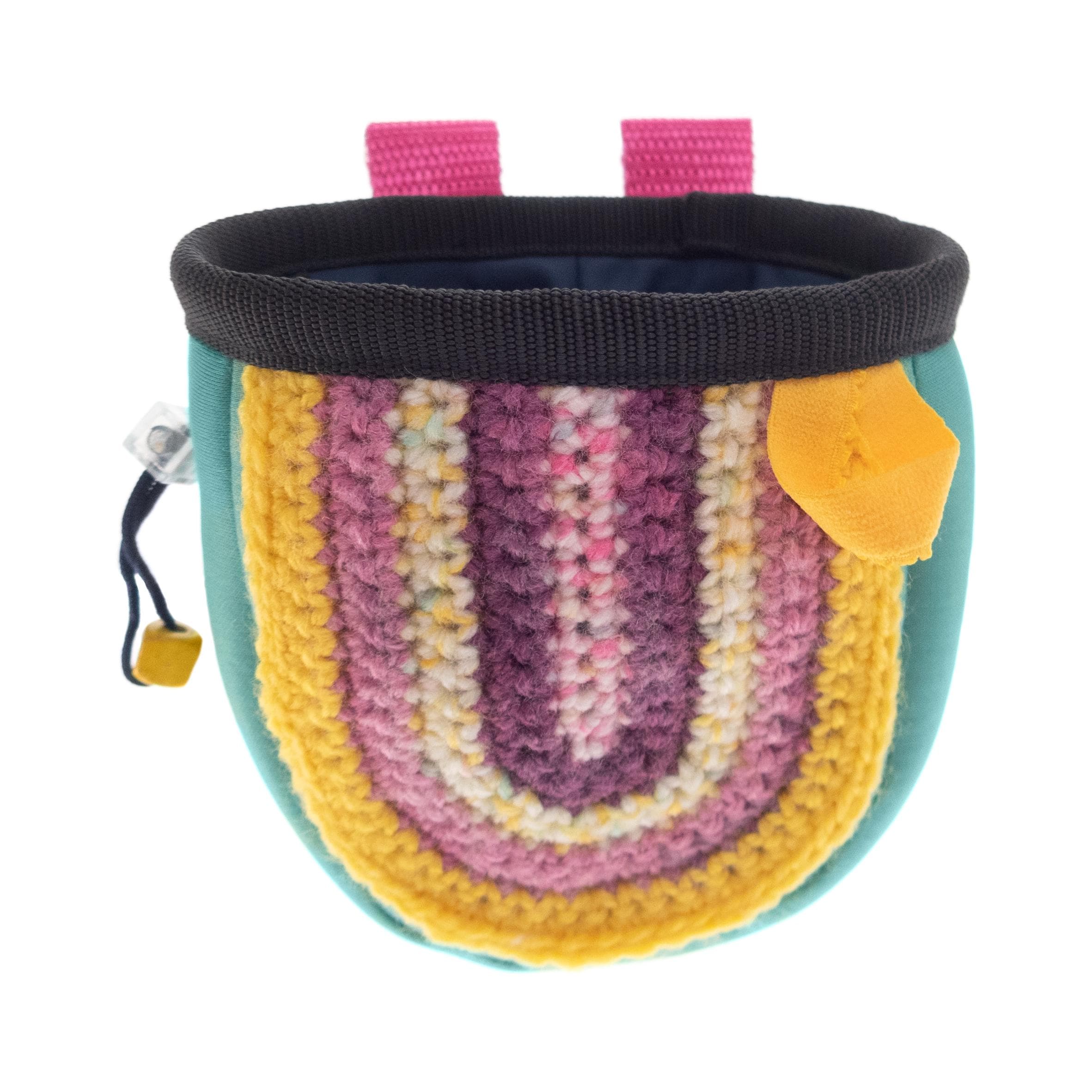 This is Climb Chalk Bag for Kids, handmade of blue neoprene fabric with hand knitted front part in pink and yellow. This powder bag can be used of children for bouldering and rock climbing. You can attach the boulder chalk bag to the harness, or hanging it on the belt. Smaller in size, but with the full functionality of the climb chalk bags for the big ones. One of a kind.