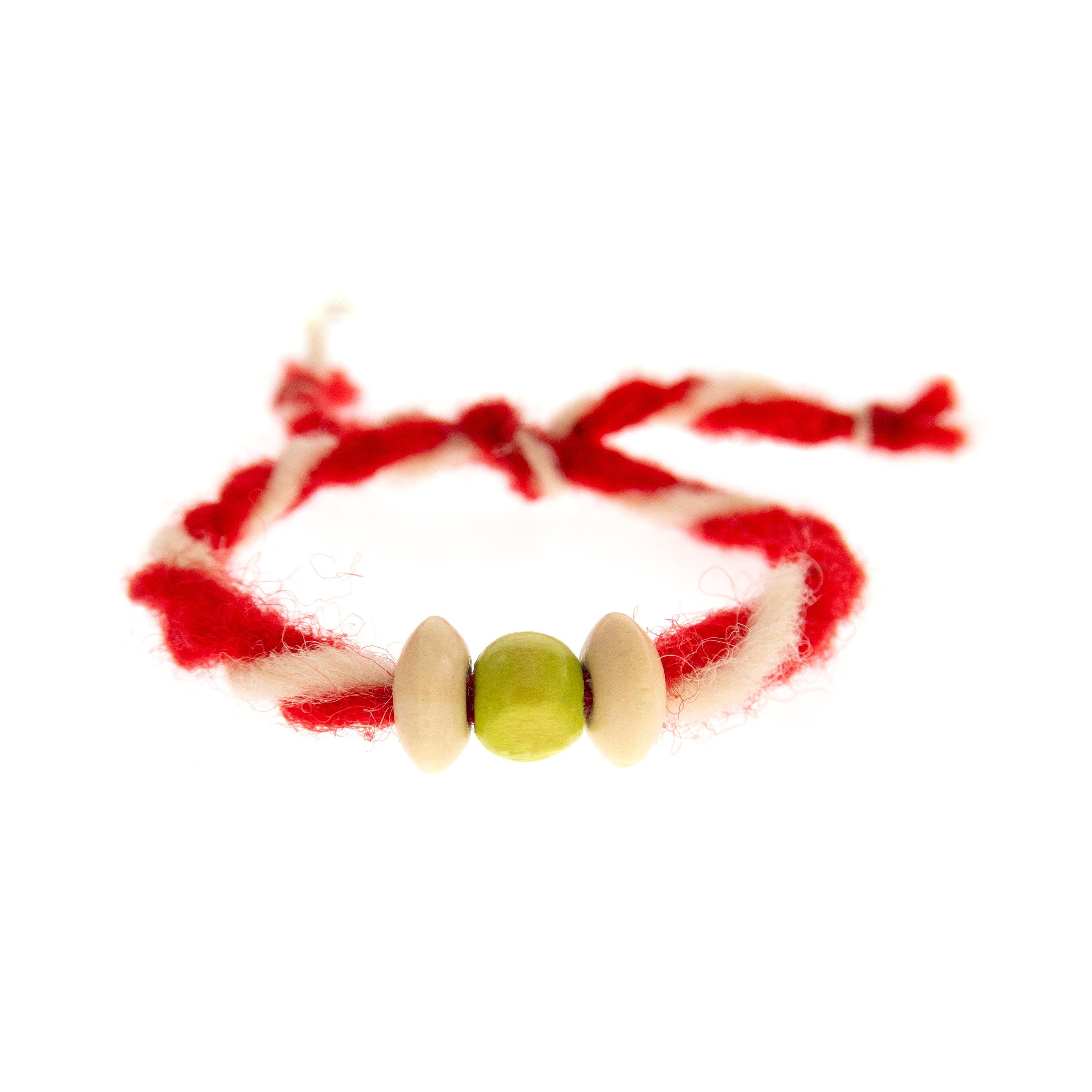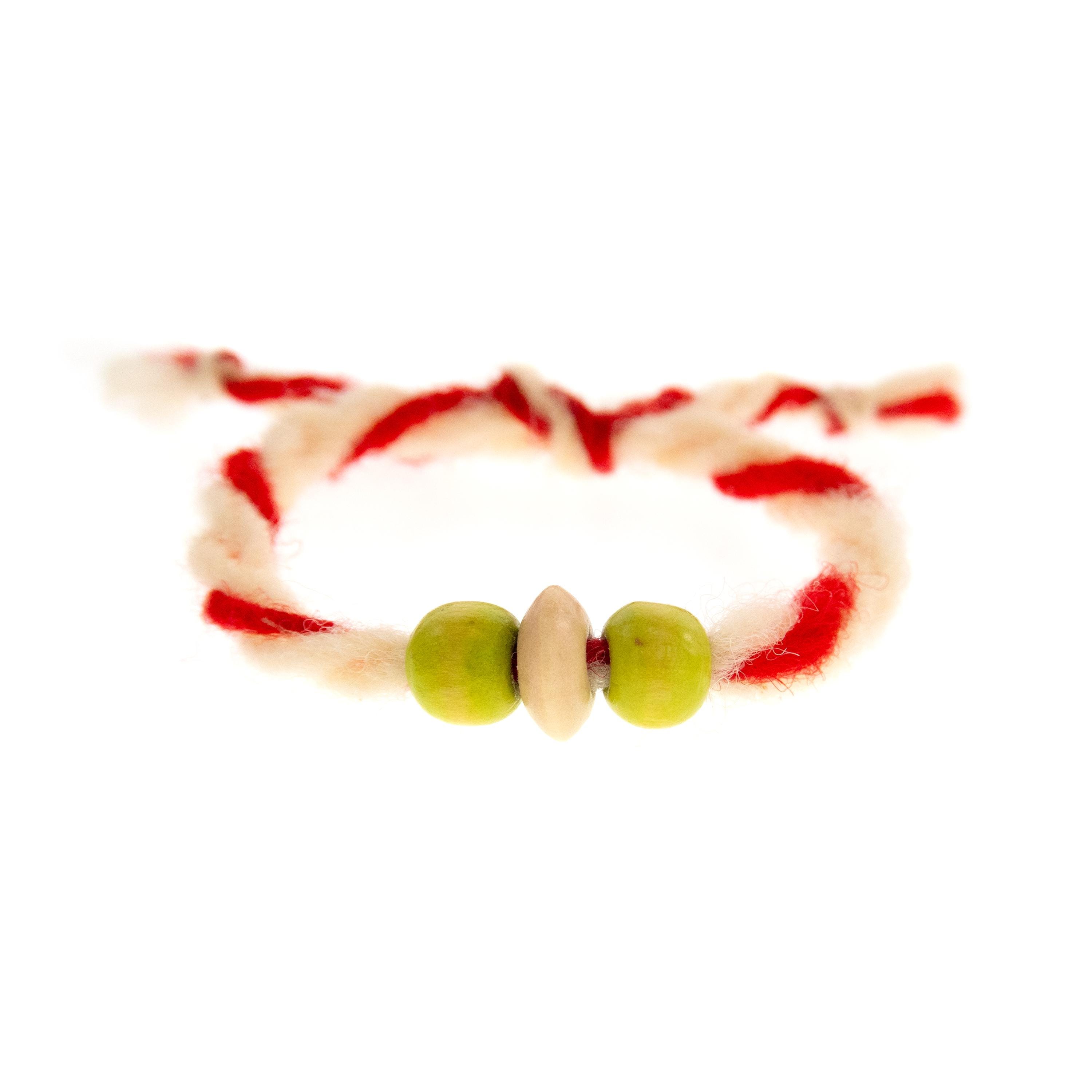 This is set of 10 Wool Martenitsa Bracelets, handmade by Nadamlada as traditional for Bulgaria wool martenitsi, martenitchki. We designed these hand made bulgarian bracelets of entirely natural materials: red and white creamy wool and wooden beads. Use these martis / martisor bracelets as a symbol of luck, the beginning of spring and just to celebrate the Baba Marta day (the 1 of March, 1 Martie). These eco-friendly martenitsa bracelets are designed to break down naturally over time, minimizing their environmental impact at the end of their lifecycle. Unlike synthetic materials, which can persist in the environment for centuries, the natural materials decompose into harmless substances, reducing waste accumulation.